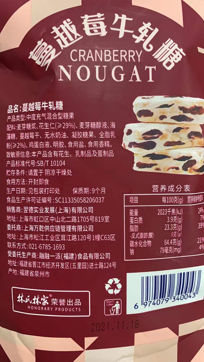 【2.18视频号】120g陌易蔓越莓牛轧糖*3