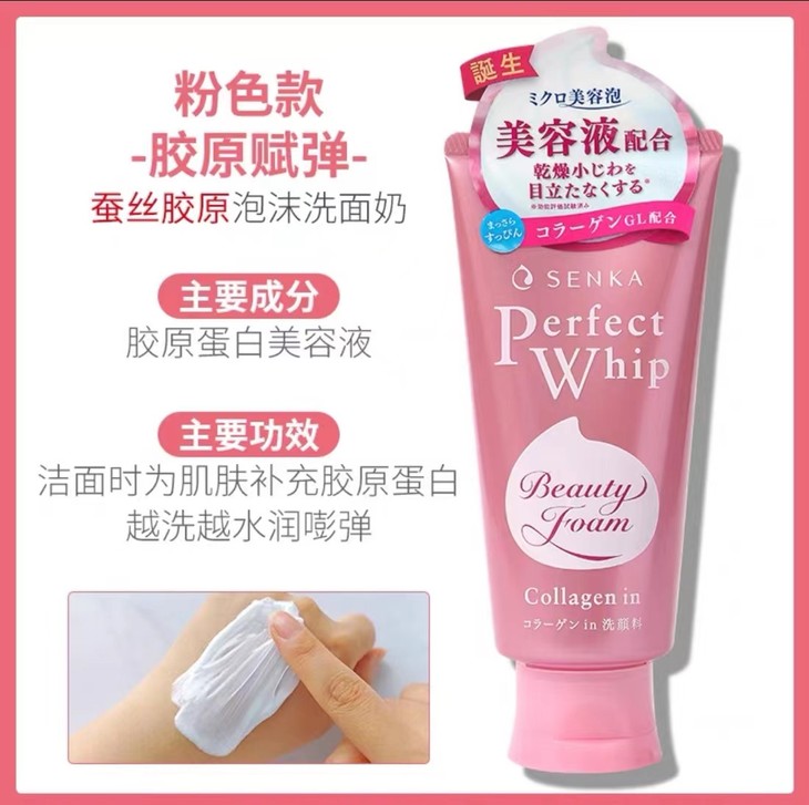 👑资生堂粉色洗顏专科洗面奶120g 👍胶原赋弹,滋润补水 💕蕴含[蚕丝胶原蛋白]成分 🔆主打:恢复弹力、丝滑润泽 🍀有效:清洗面部的同时还滋润肌肤,洗完不紧绷 🎈质地乳白,丰富绵密泡沫,越洗越水润Q弹 💕适合:敏感、混干、干性肌肤
