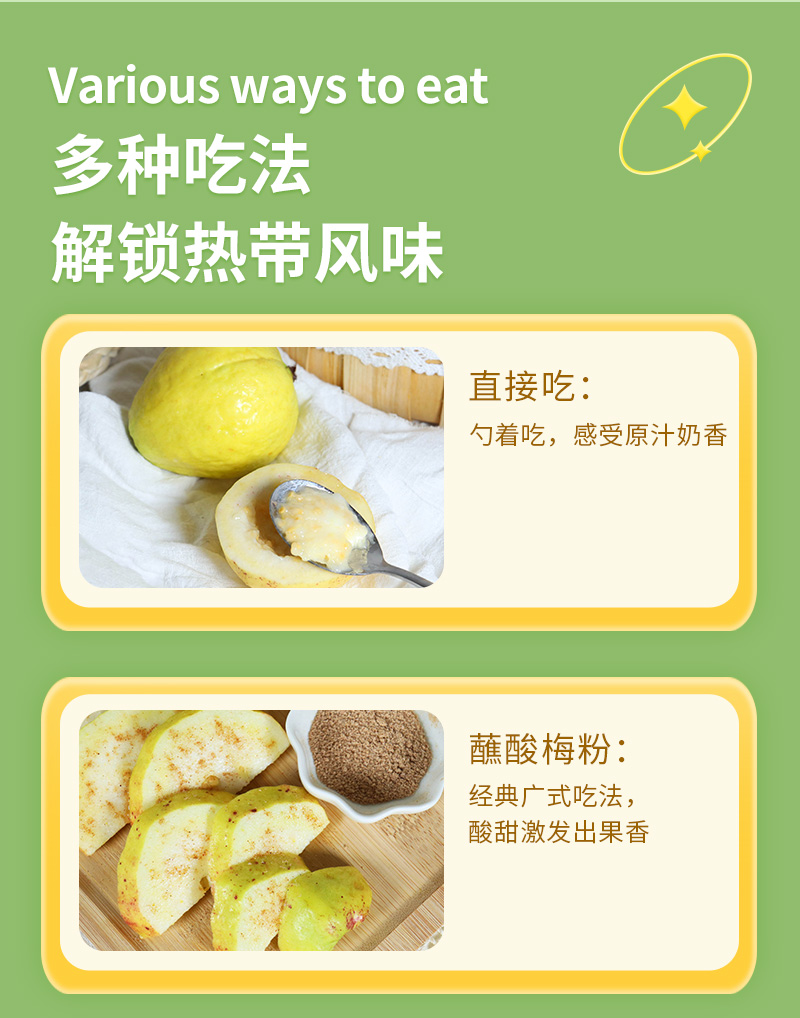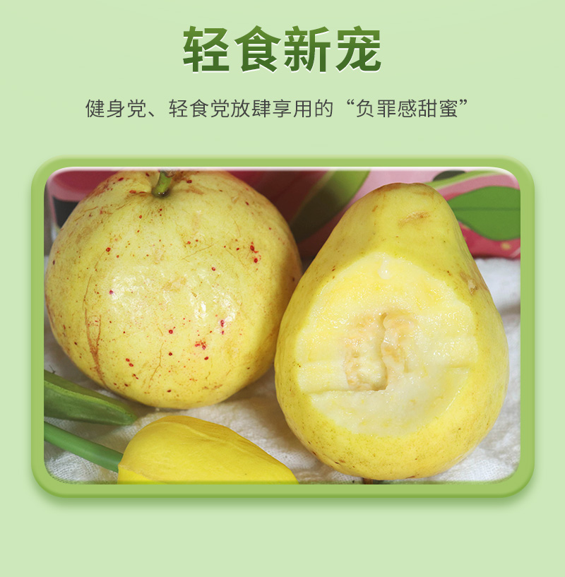 2.芭乐不分生熟,只分青黄,稍青的果子口感偏清脆爽口,泛黄的果子口感偏软,带有独特香气