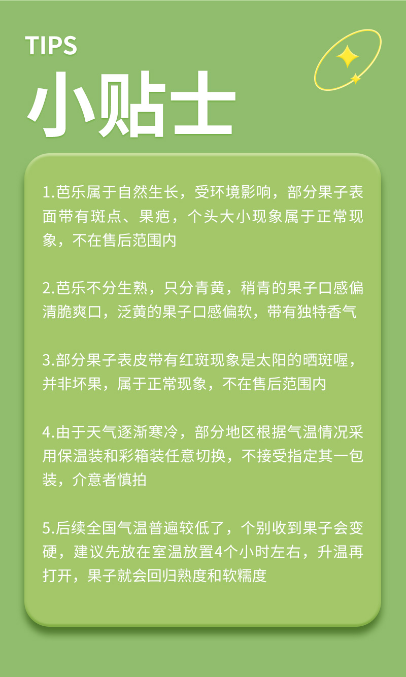 3、个别果子因为自然生长采摘,所以表皮可能会有果斑,不影响食用,介意勿拍。