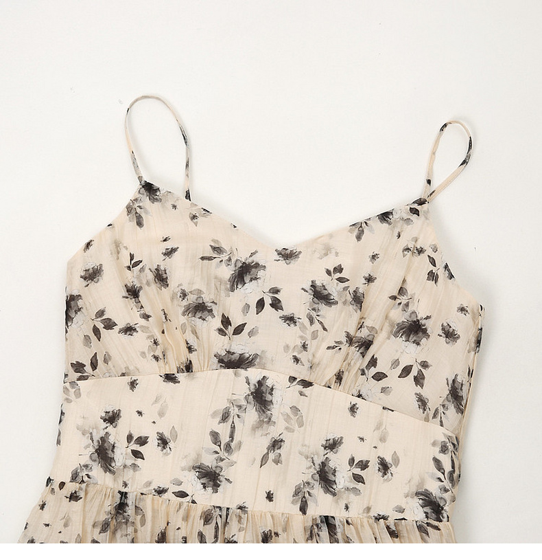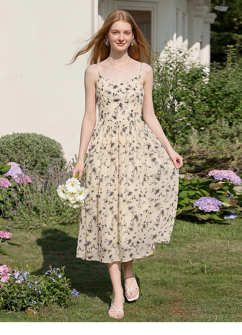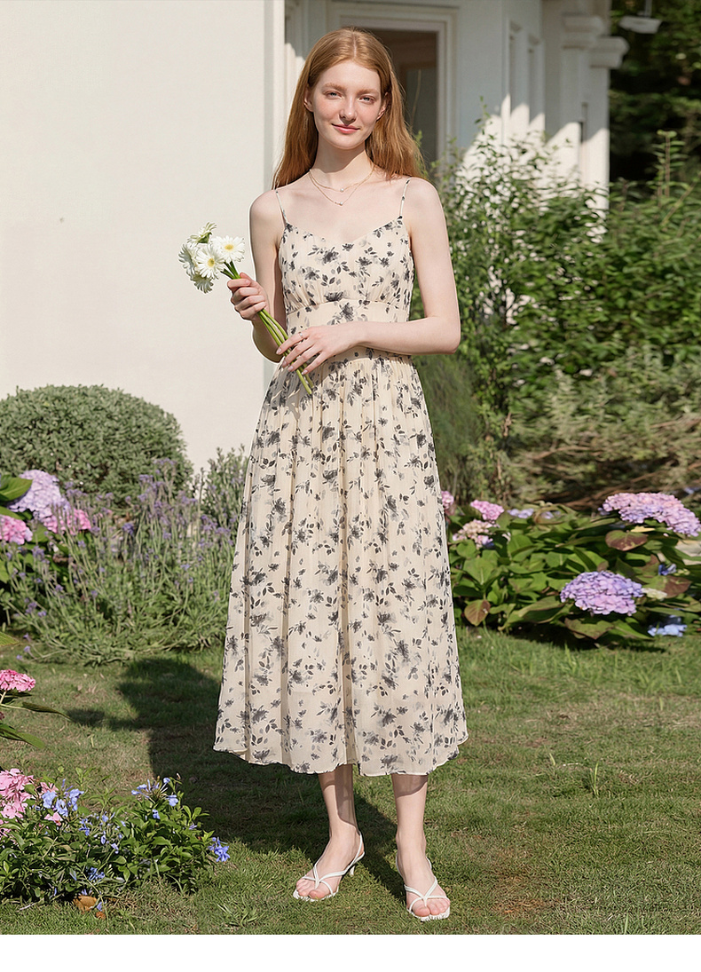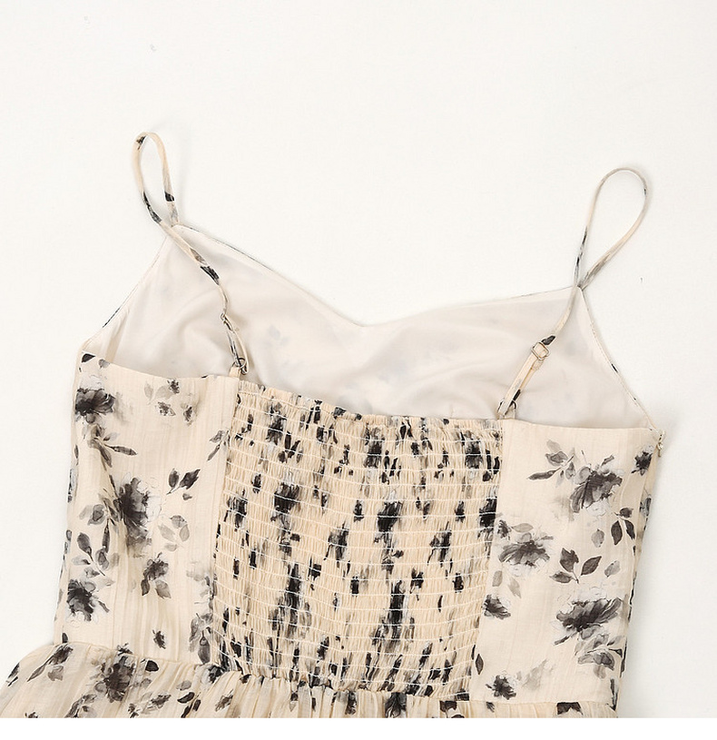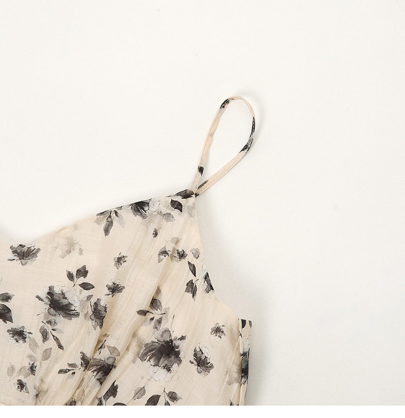 天猫同步【天丝混纺】拉夏贝尔/La Chapelle轻奢线!法式V领撞色花朵后背松紧吊带裙气质温柔连衣裙