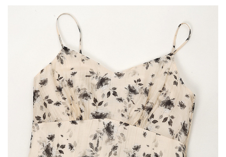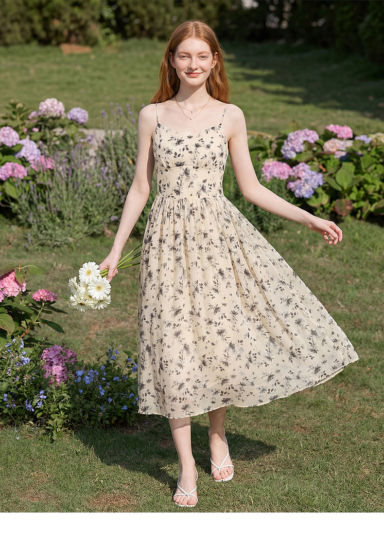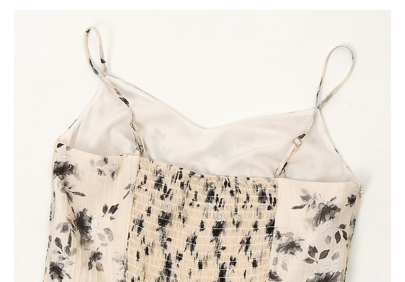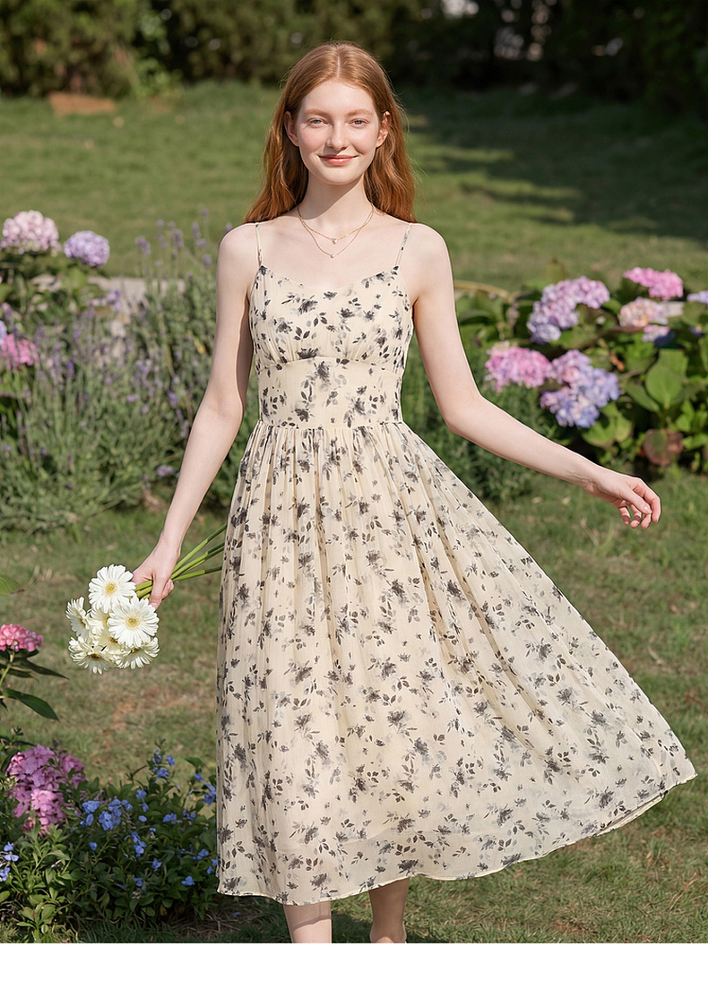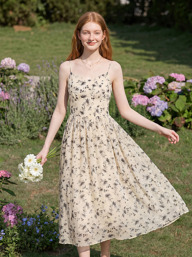 天猫同步【天丝混纺】拉夏贝尔/La Chapelle轻奢线!法式V领撞色花朵后背松紧吊带裙气质温柔连衣裙