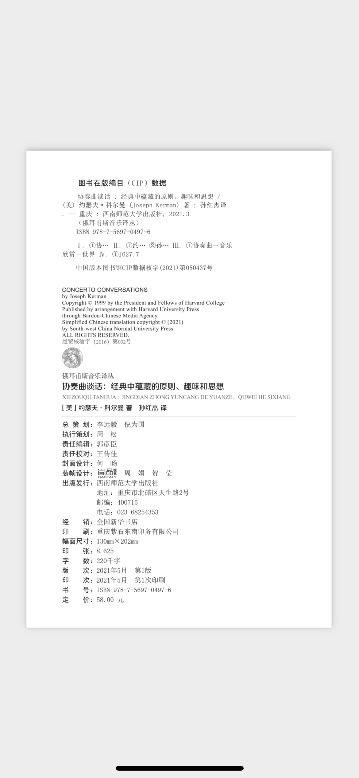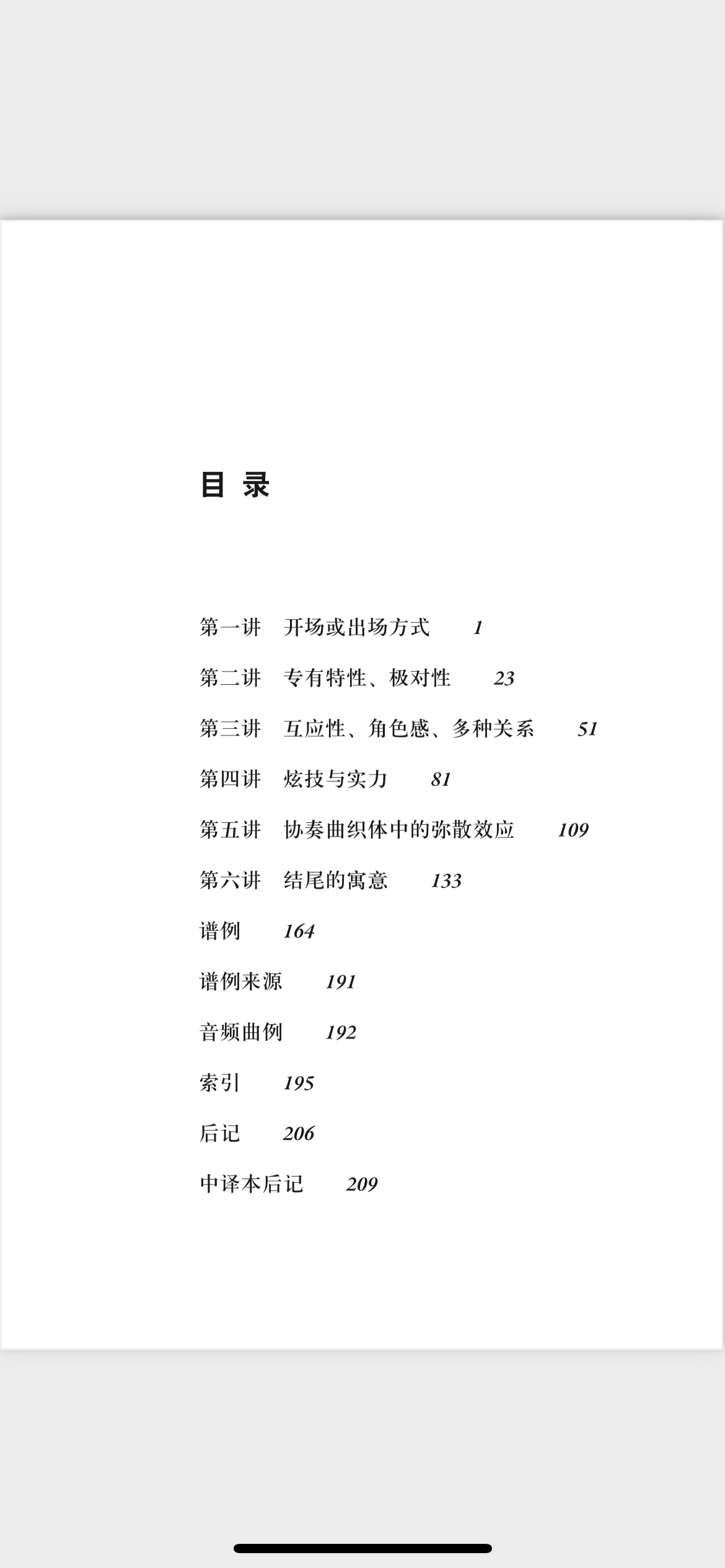 《协奏曲谈话》原系作者在哈佛大学“诺顿讲坛”(Norton Lectures)上的系列讲座文稿。全书共分六章:开场/出场,专有特性、极对性,呼应性、角色感、多重关系、炫技/实力,弥散:协奏曲的织体,结尾的寓意。它以深入浅出地口吻论及了协奏曲的体裁属性、核心概念、结构原则和哲性寓意,提出了观察协奏曲的有效视角,梳理了协奏曲在历史发展过程中经历的主要范式,分析了在协奏曲体裁史上(从巴洛克到20世纪)具有里程碑意义的一大批经典作品——作曲家涉及维瓦尔第、巴赫、莫扎特、贝多芬、李斯特、舒曼等,是一部不可多得的批评专著,也是发人深省的赏乐指南。- 西南大学出版社音乐分社