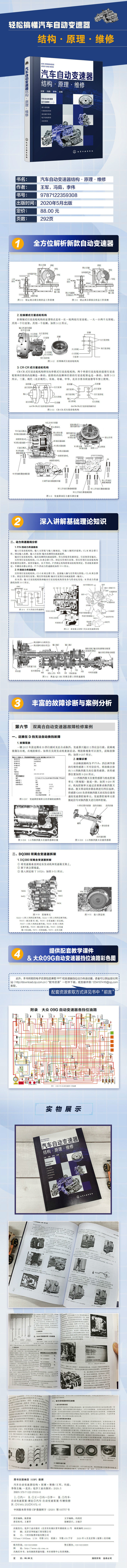 本书所选自动变速器均是在近期上市且社会保有量较大车型所选用的,如新款爱信三代自动变速器6F25、大众09G 自动变速器、宝马9 速自动变速器、通用10 速自动变速器、通用GF6 6T40 E 自动变速器、DQ500/380/02E/0AM 双离合变速器等。在编写时,着重对这些变速器的拆装与检修技术做了详细介绍,对每款车型自动变速器的动力传递路线进行了详细分析,对电液控制原理及控制电路进行了介绍,这部分内容可满足广大修理人员对自动变速器新知识学习的需要。