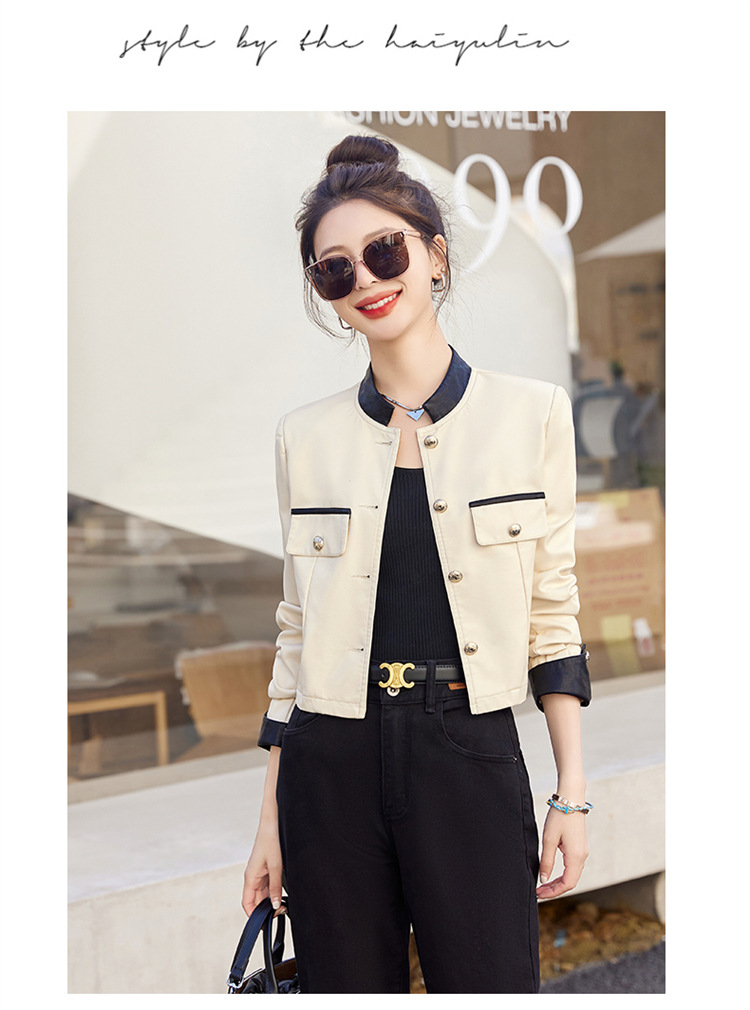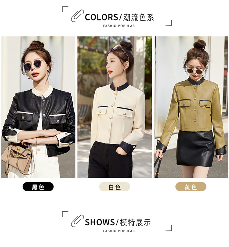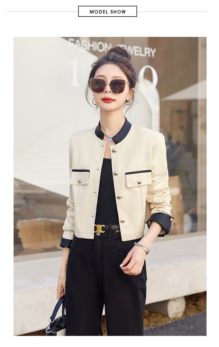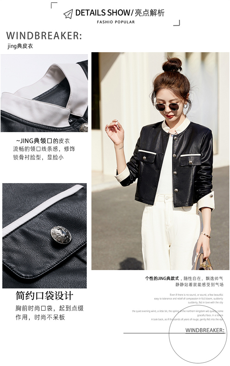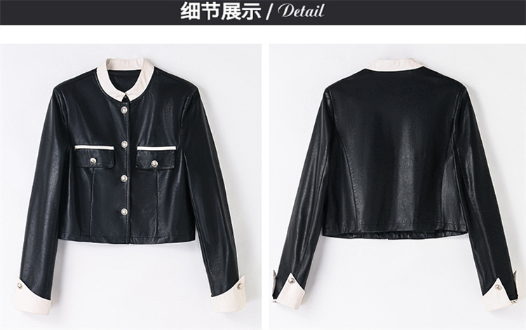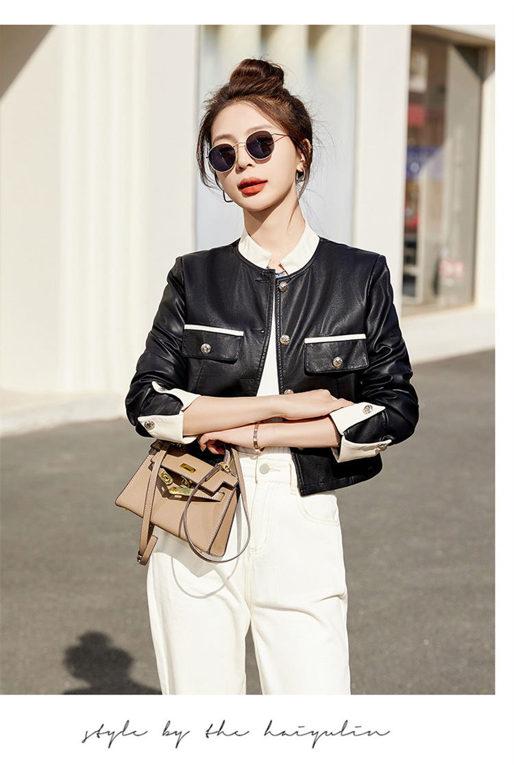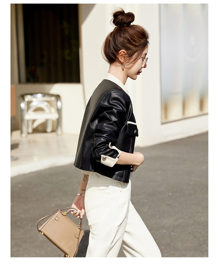 春女新款皮衣短外套,撞色拼接方形口袋小立领小个子夹克外套HR-WY38099