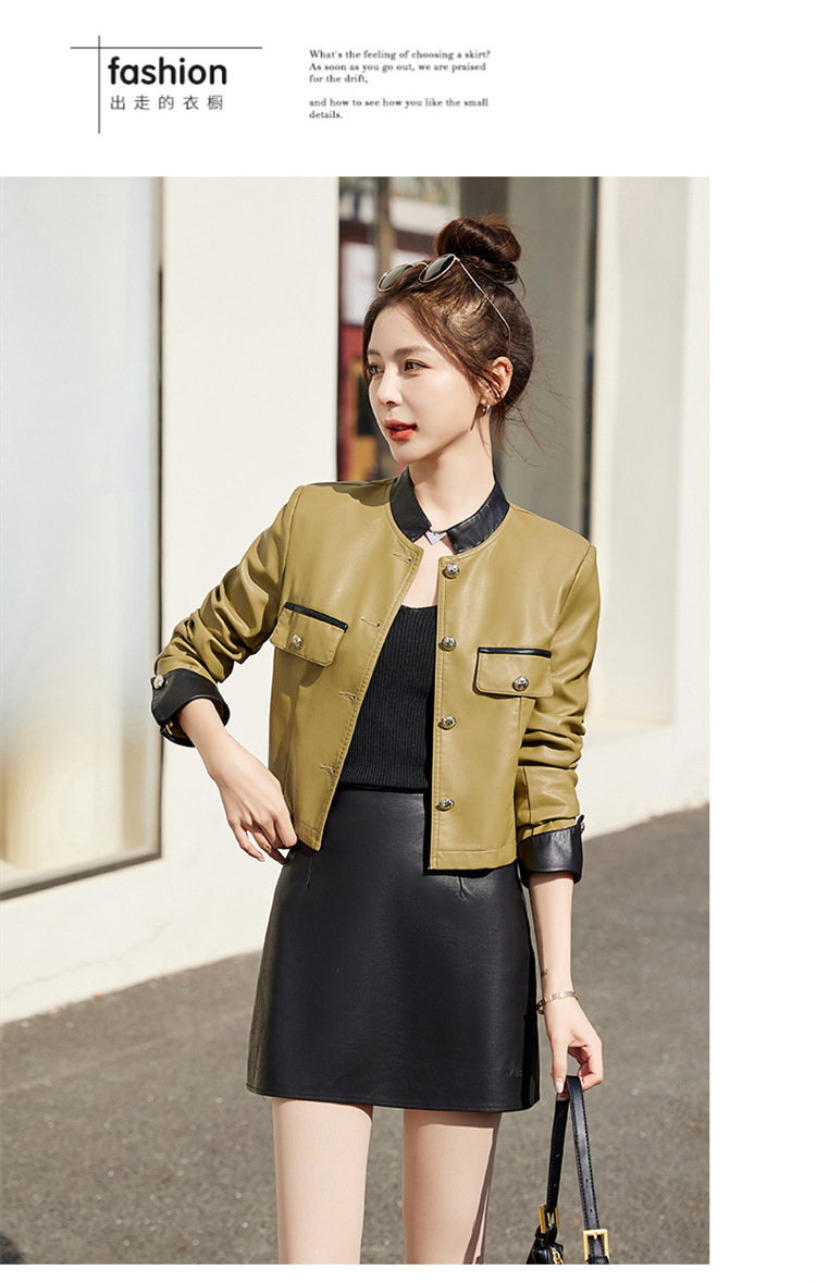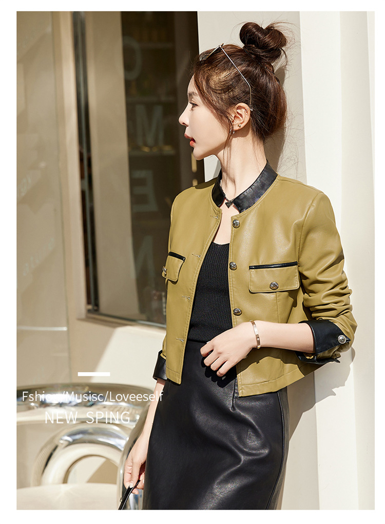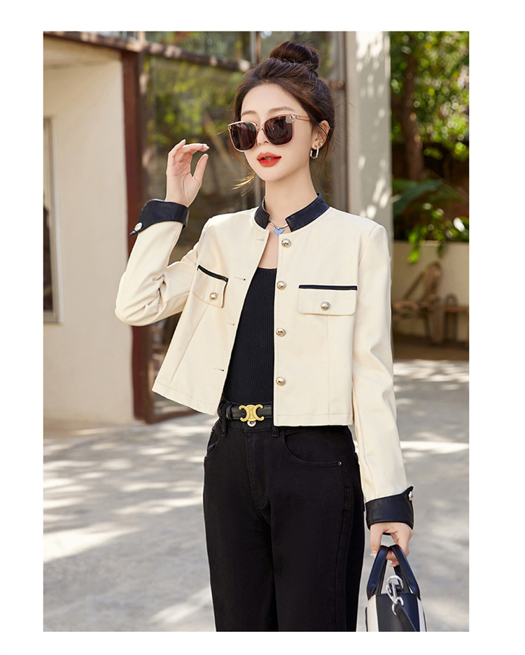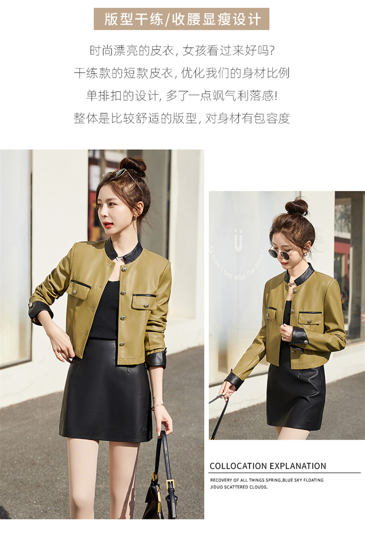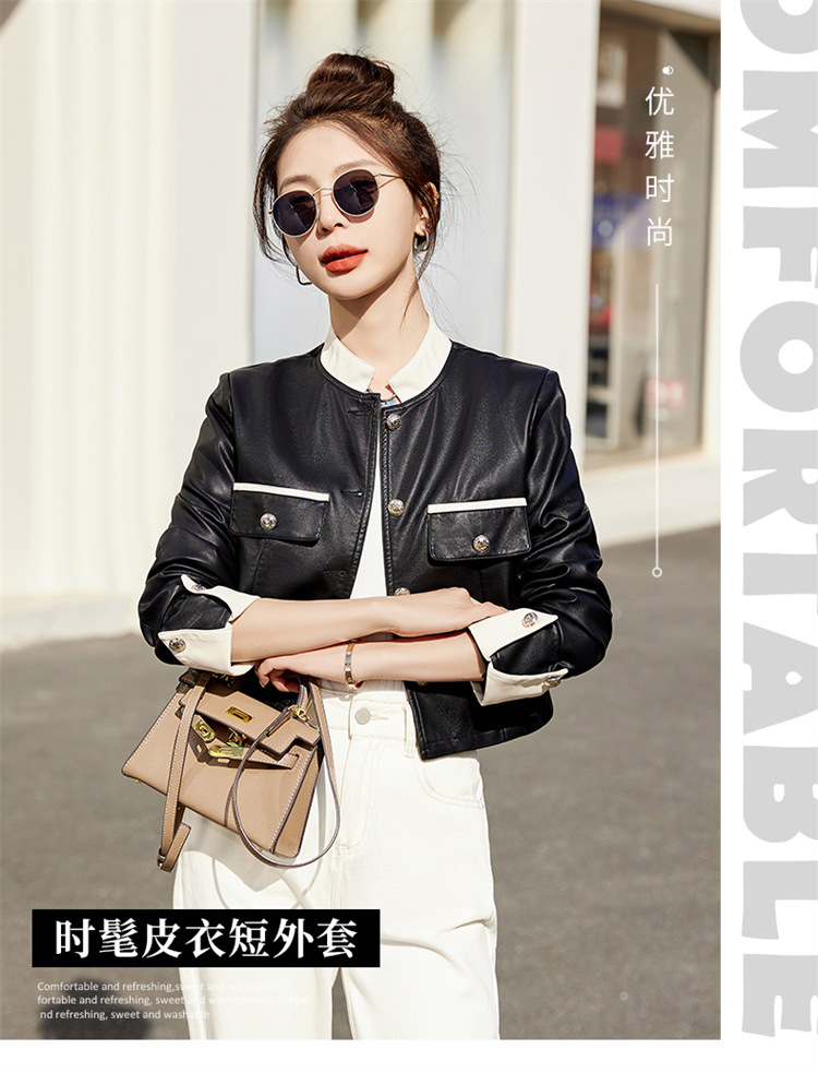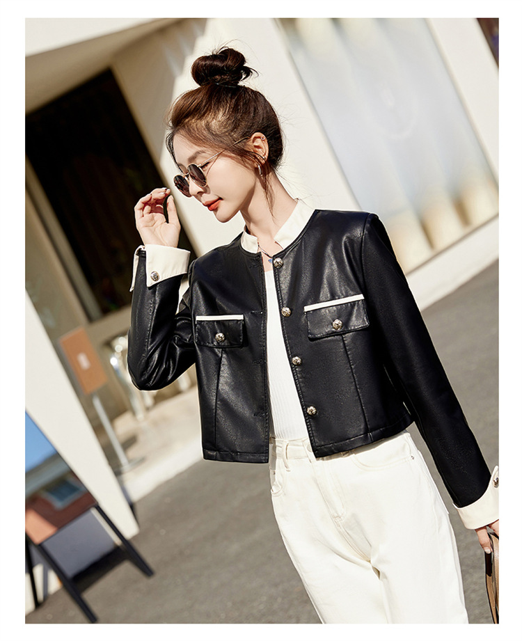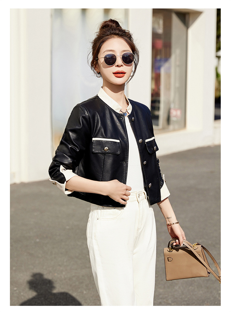 春女新款皮衣短外套,撞色拼接方形口袋小立领小个子夹克外套HR-WY38099