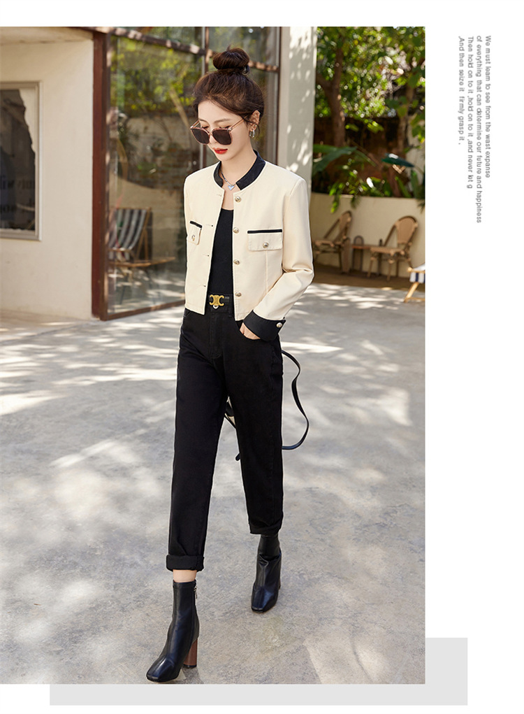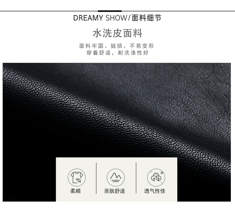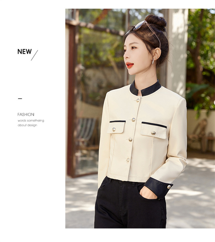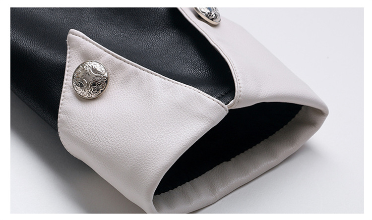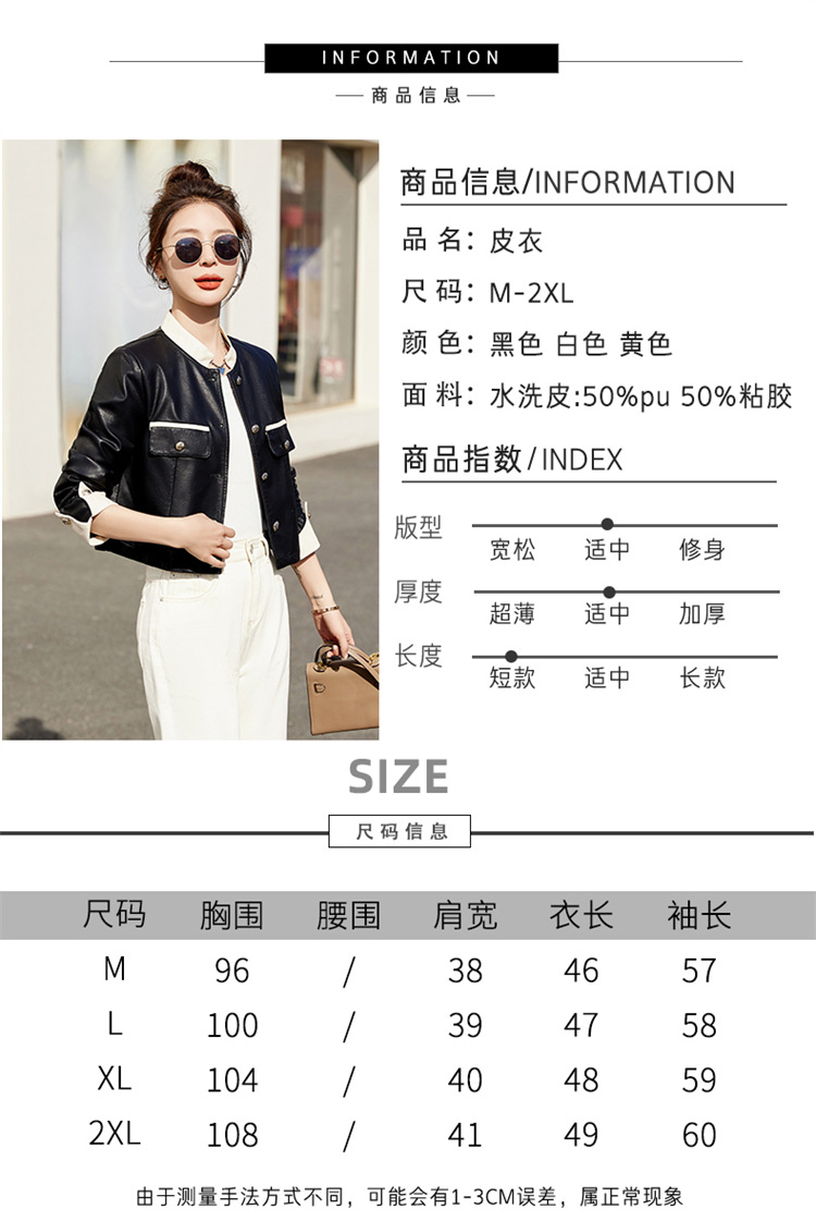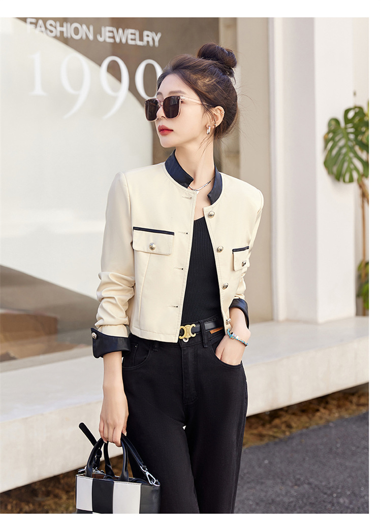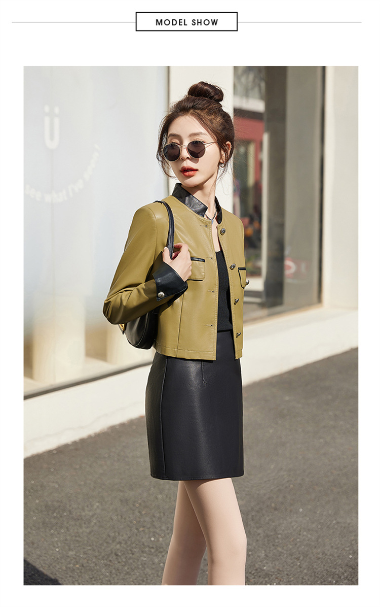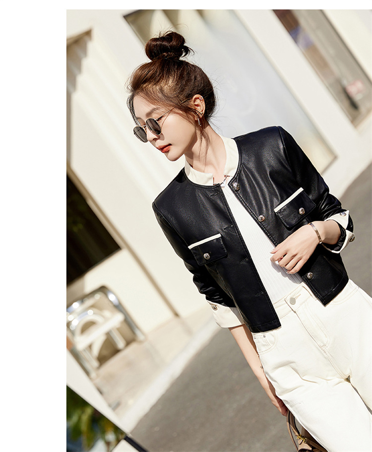 春女新款皮衣短外套,撞色拼接方形口袋小立领小个子夹克外套HR-WY38099