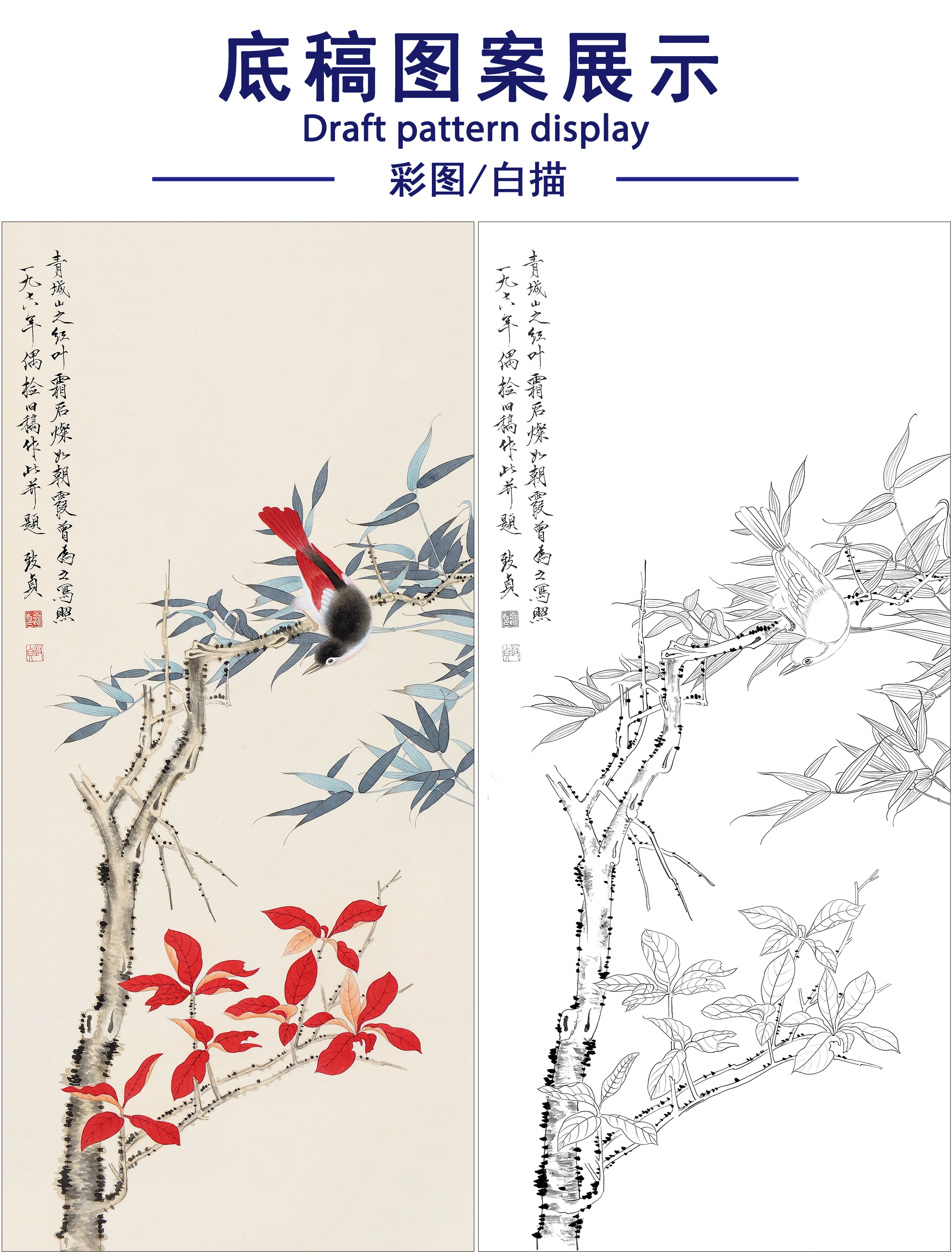 俞致贞花鸟工笔画白描底稿《 红叶小鸟》临摹勾线高清打印稿ZZ57