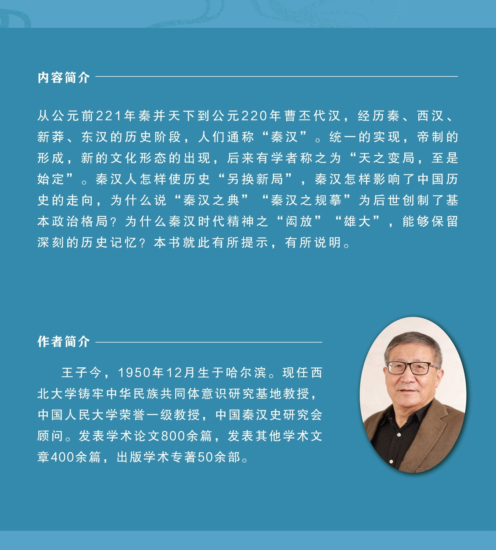 王子今,1950年12月生于哈尔滨。现任西北大学铸牢中华民族共同体意识研究基地教授,“古文字与中华文明传承发展工程”协同攻关创新平台、中国人民大学荣誉一级教授,中国秦汉史研究会顾问。发表学术论文800余篇,发表其他学术文章400余篇,出版《秦汉交通史稿》《史记的文化发掘:中国早期史学的人类学探索》《秦汉区域文化研究》《睡虎地秦简〈日书〉甲种疏证》《走向大一统的秦汉政治》《古史性别研究丛稿》《秦汉时期生态环境研究》《秦汉史:帝国的成立》《秦汉边疆与民族问题》《秦汉称谓研究》《秦汉交通考古》《秦汉名物丛考》《匈奴经营西域研究》《秦汉儿童的世界》《秦始皇直道考察与研究》《秦汉海洋文化研究》《秦人的信仰世界》《汉代丝绸之路文化史》等学术专著50余部。