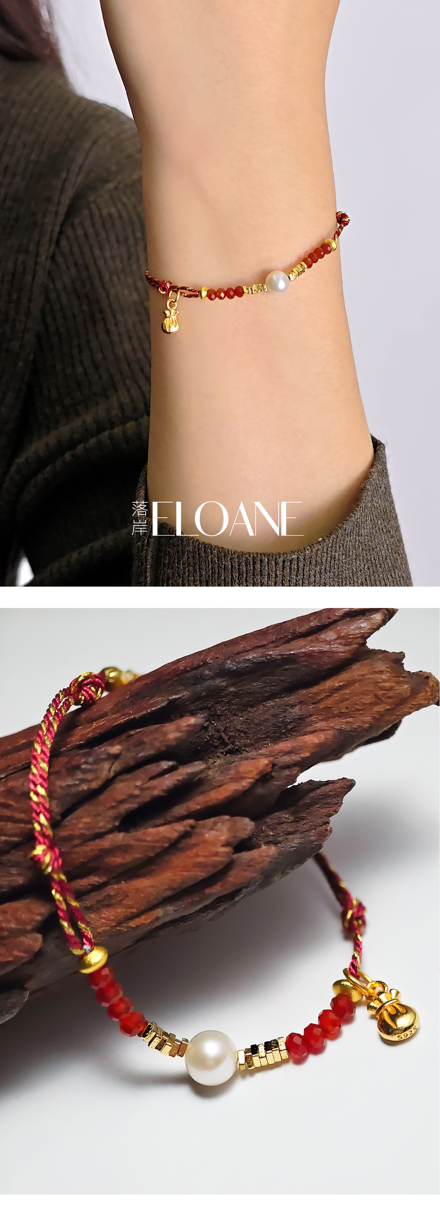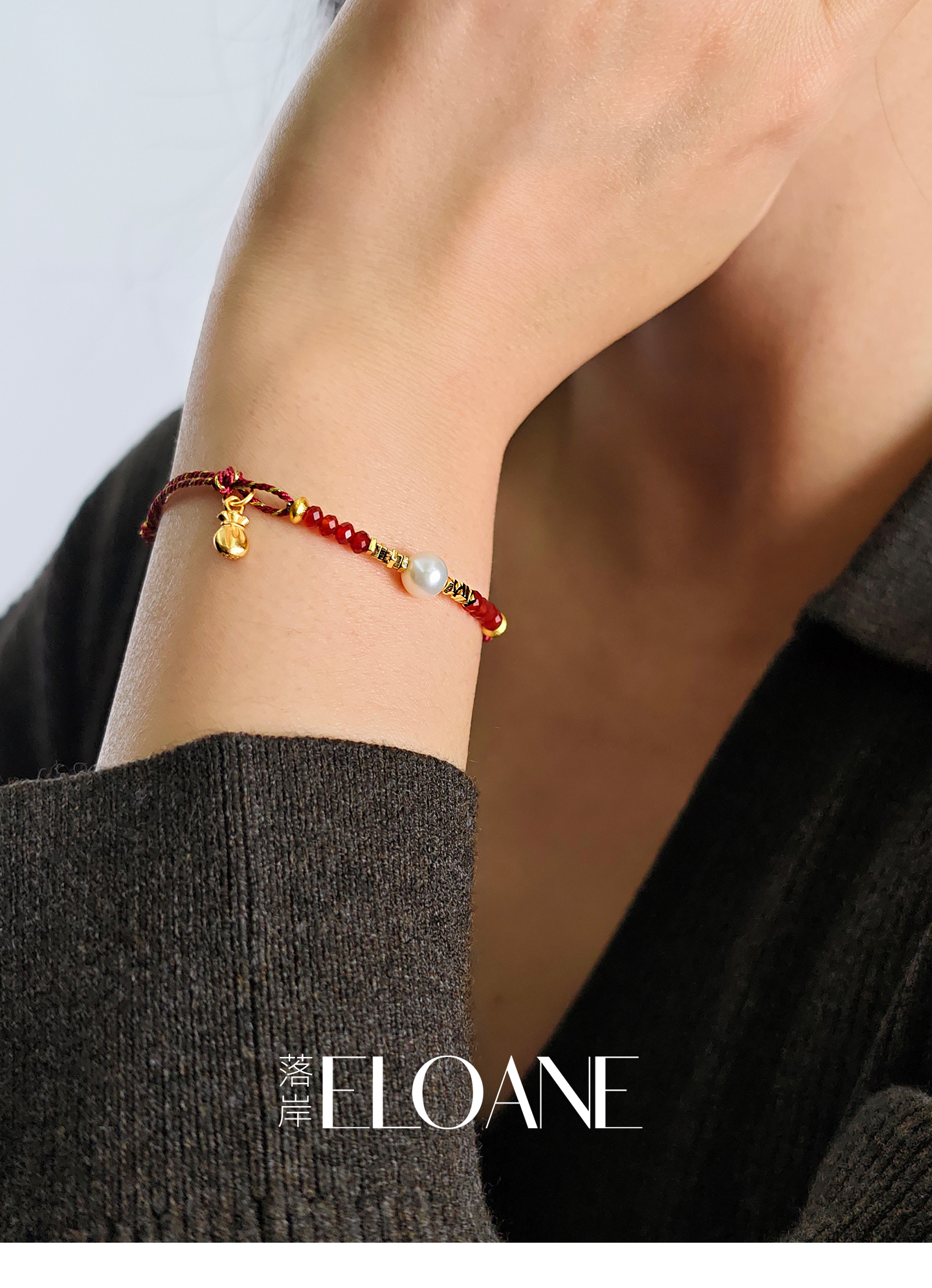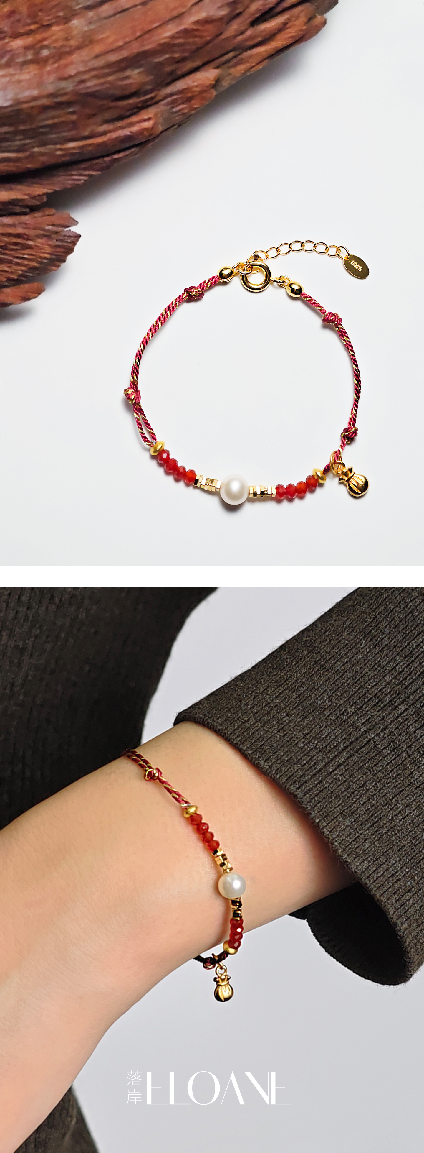 ELOANE GALLERY落岸 天然淡水珍珠红玛瑙碎金钱袋吊坠红绳手链ORIENT红韵系列