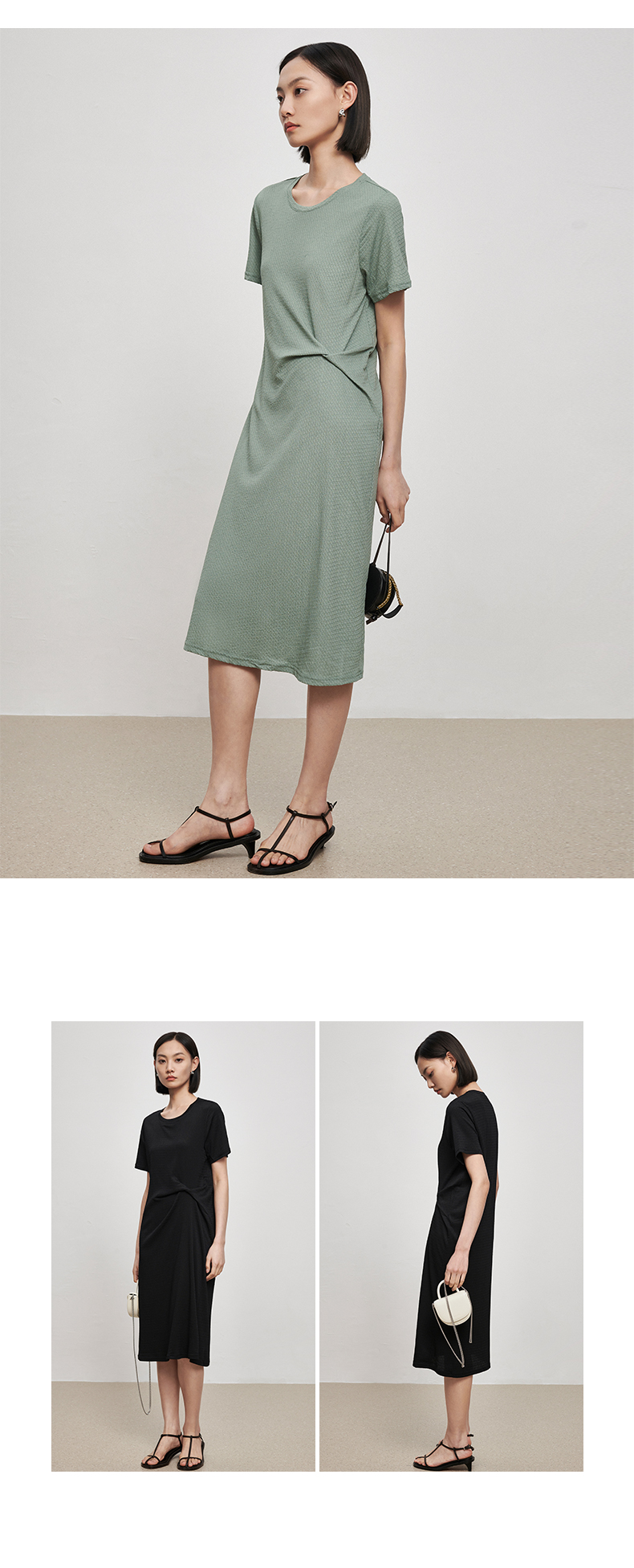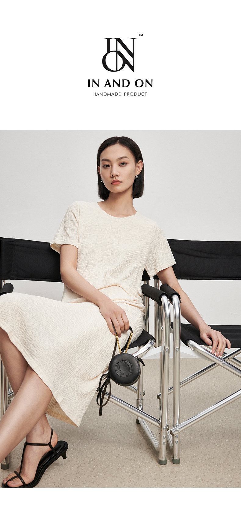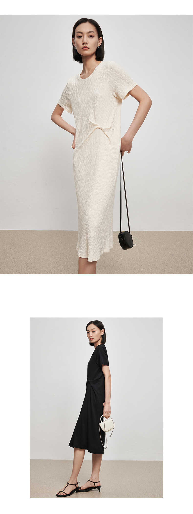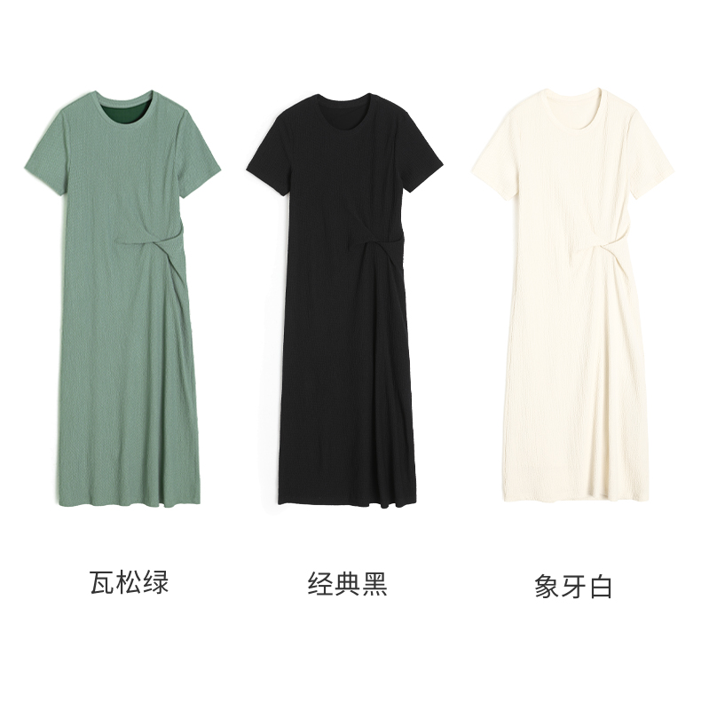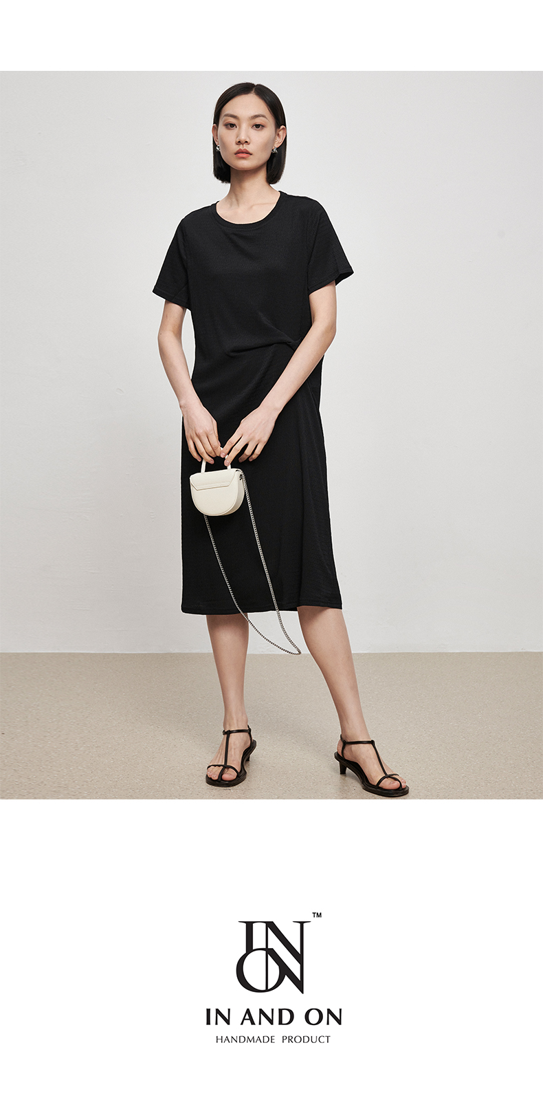 IN AND ON21973水波纹扭结连衣裙女长款优雅气质短袖圆领纯色简约长裙