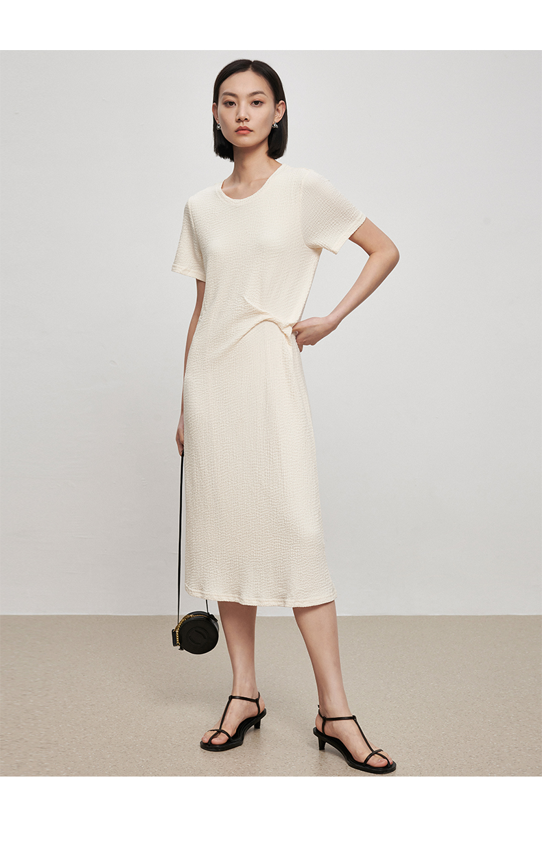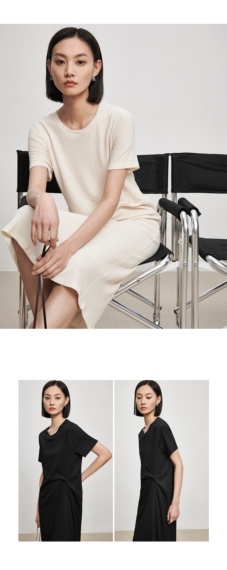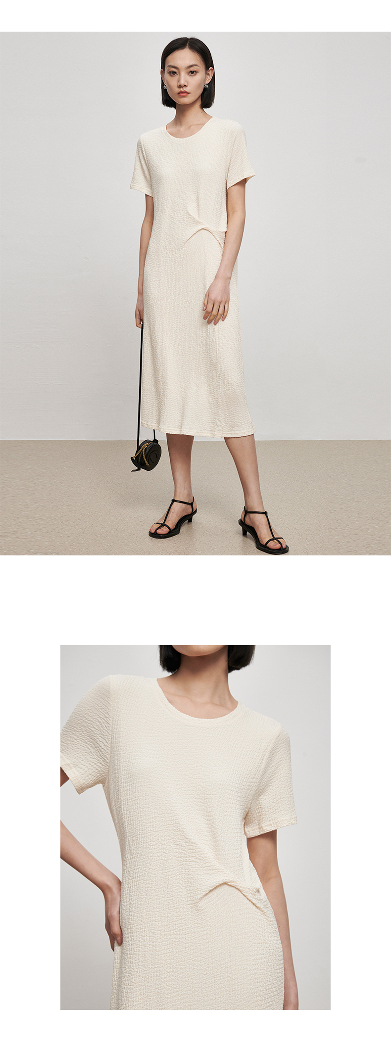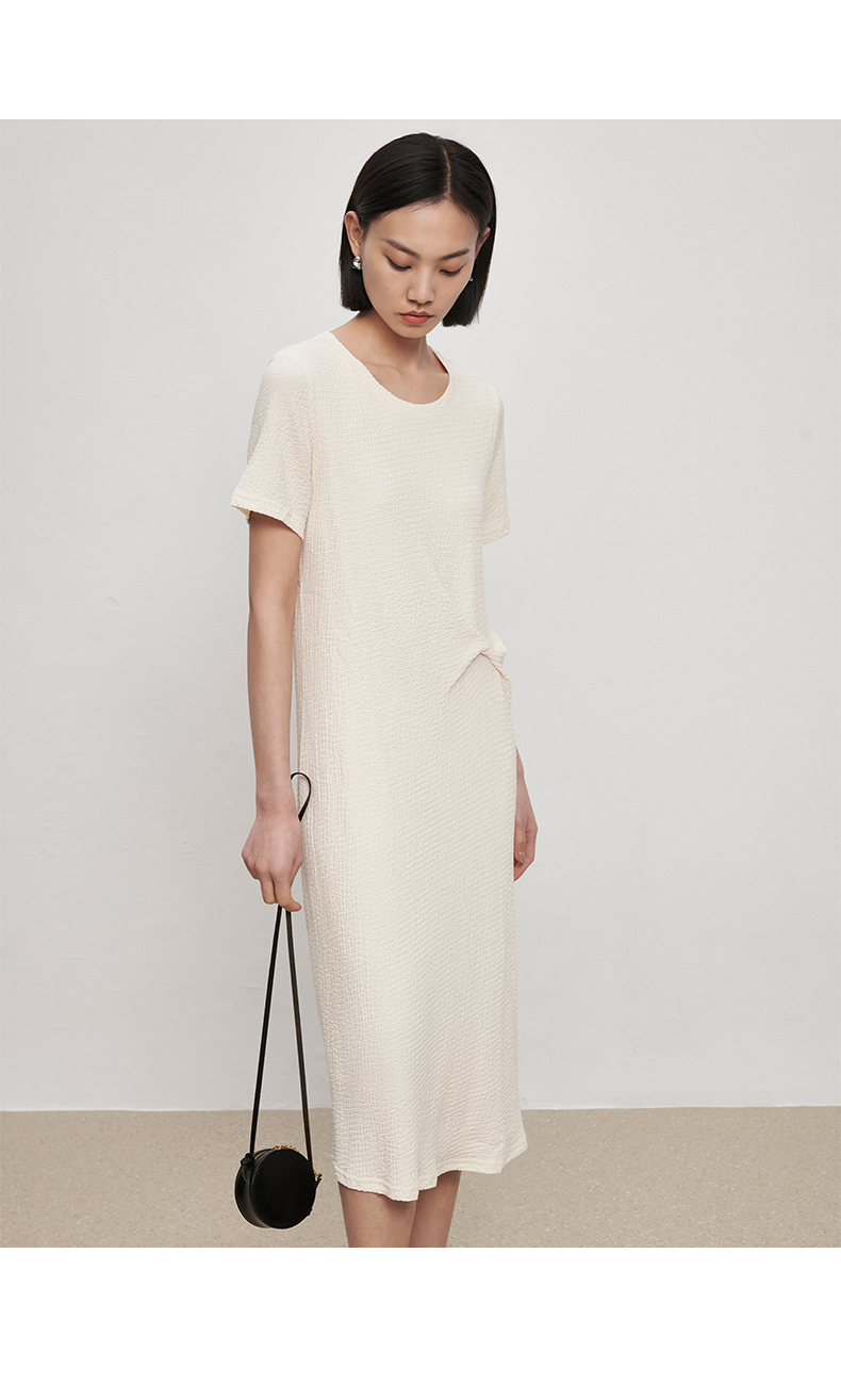 IN AND ON21973水波纹扭结连衣裙女长款优雅气质短袖圆领纯色简约长裙