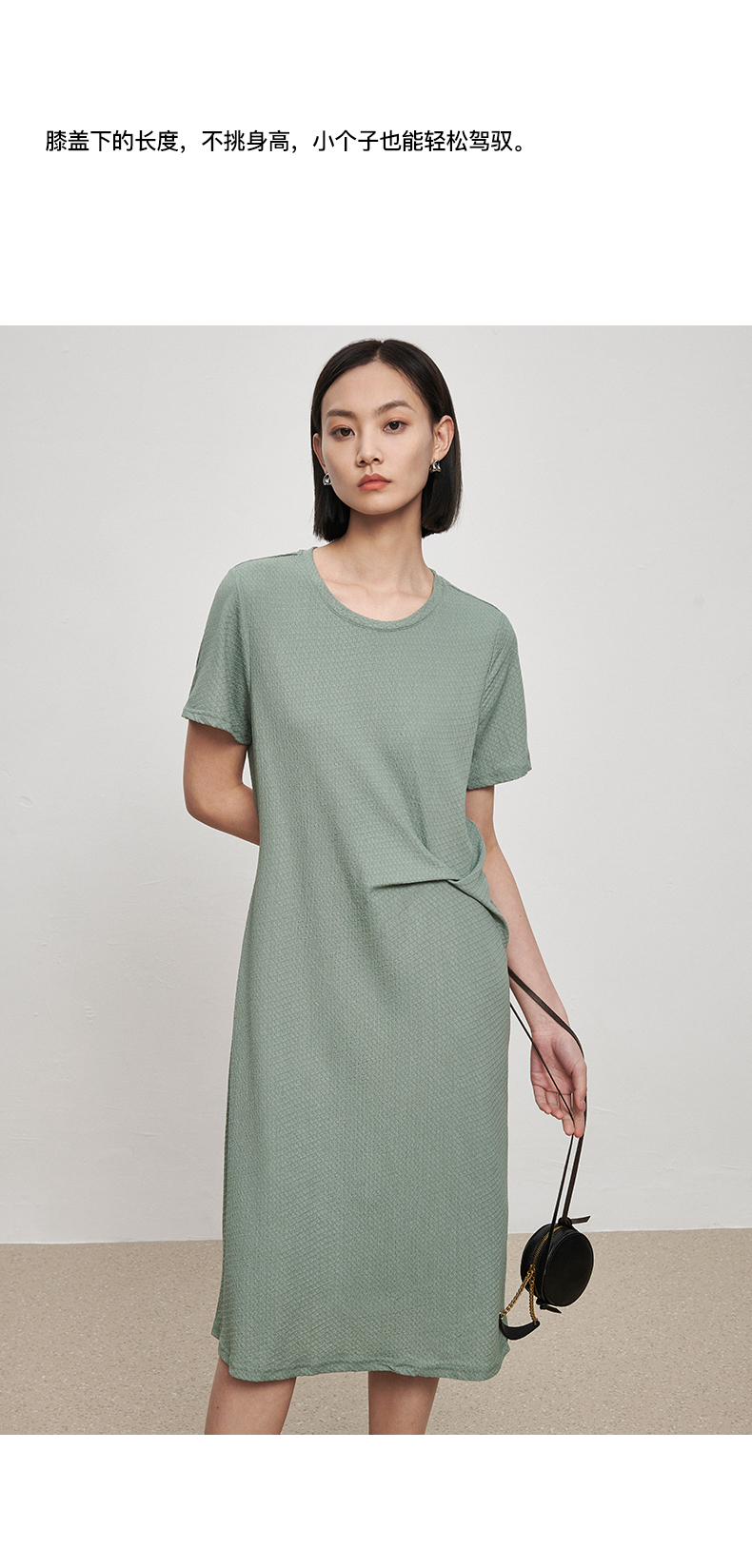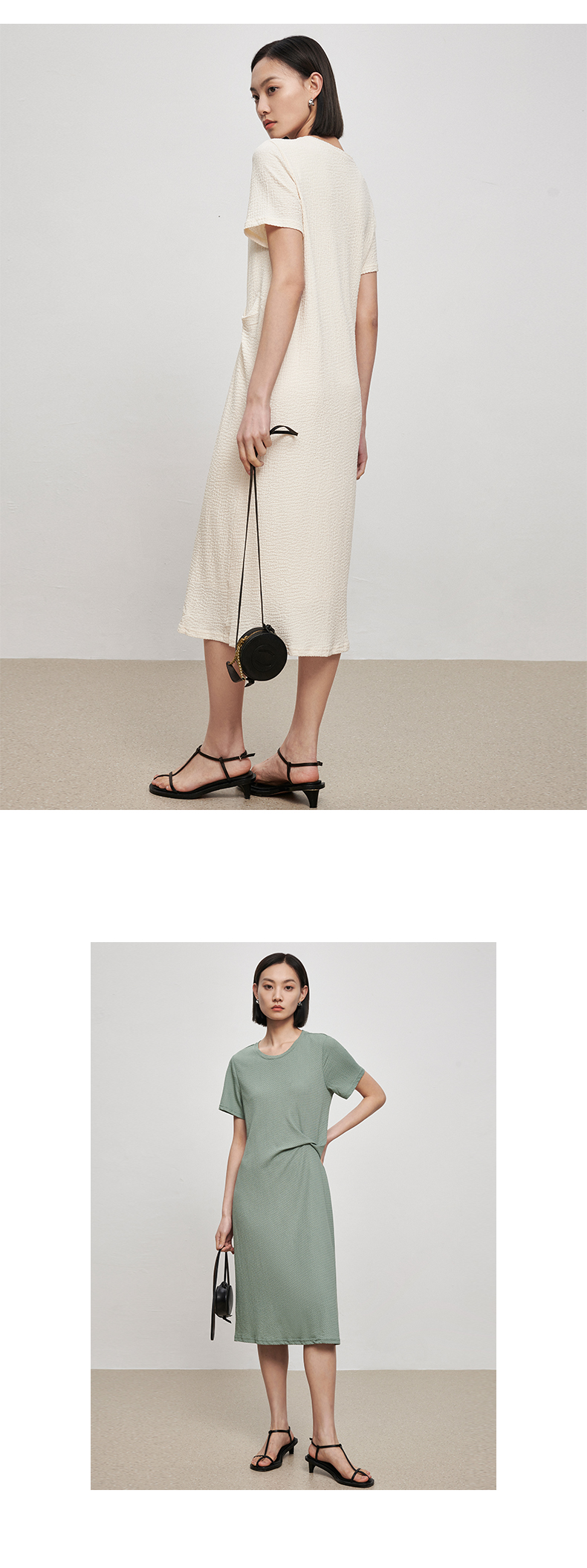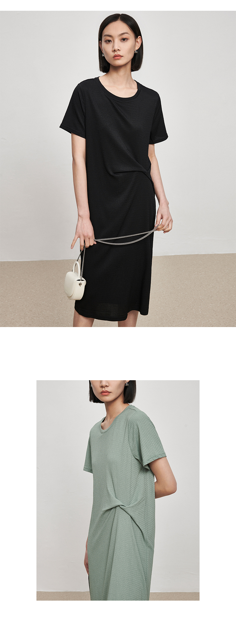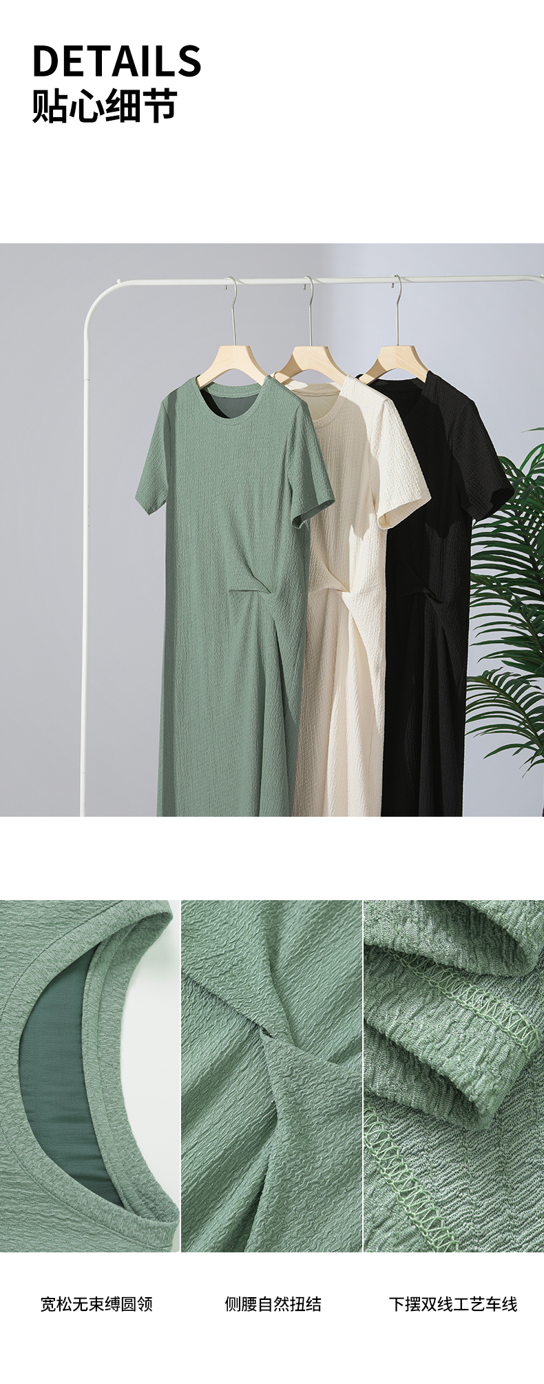 IN AND ON21973水波纹扭结连衣裙女长款优雅气质短袖圆领纯色简约长裙