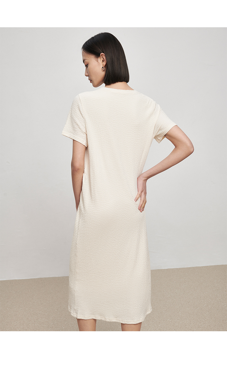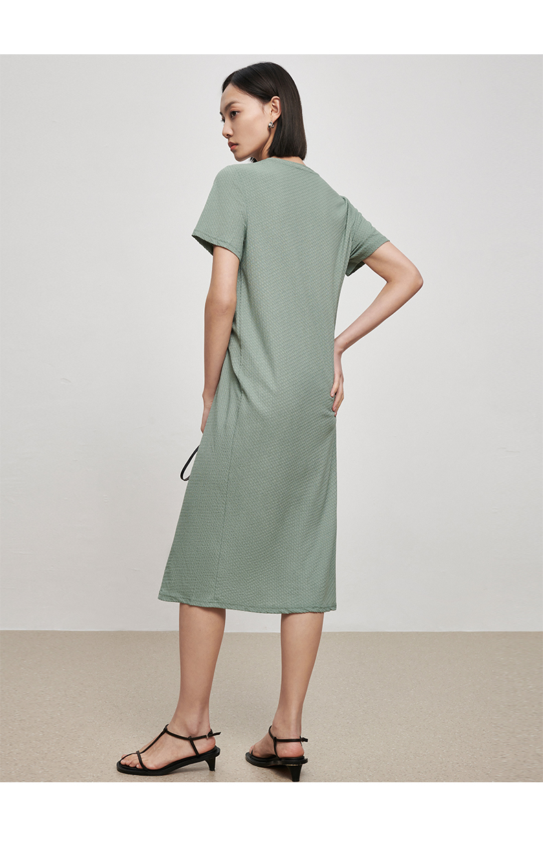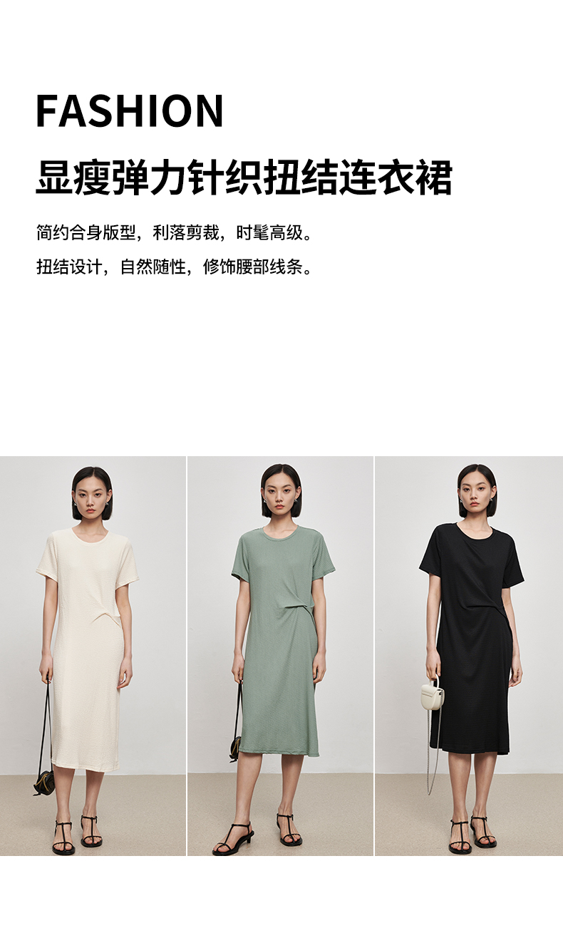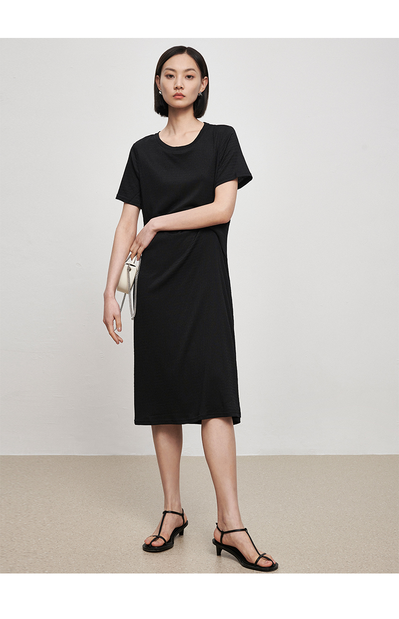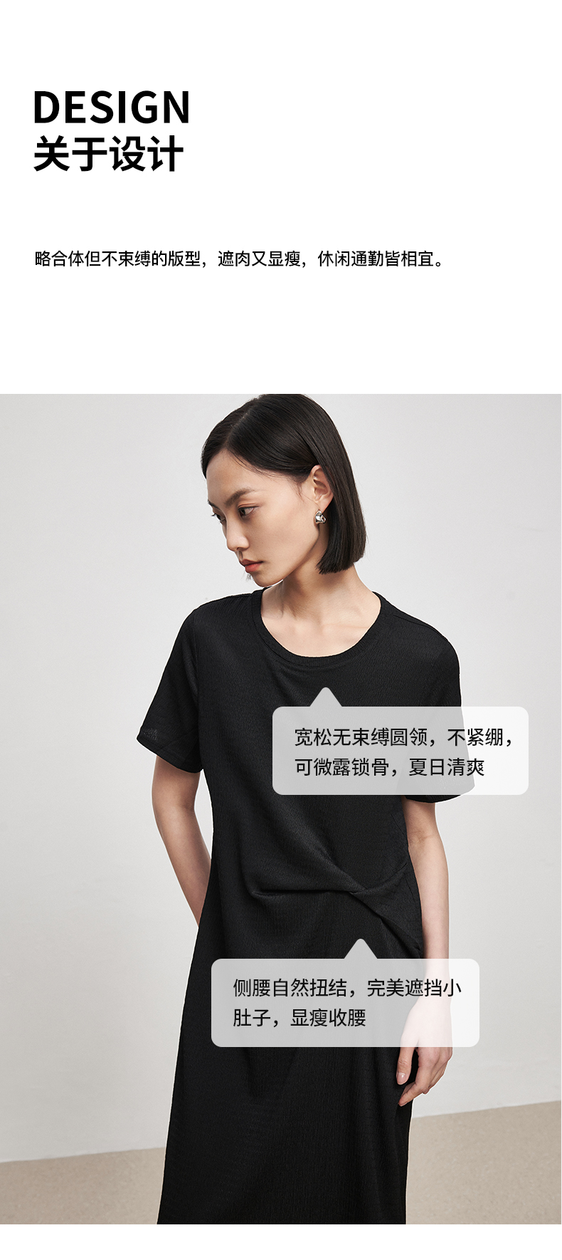 IN AND ON21973水波纹扭结连衣裙女长款优雅气质短袖圆领纯色简约长裙