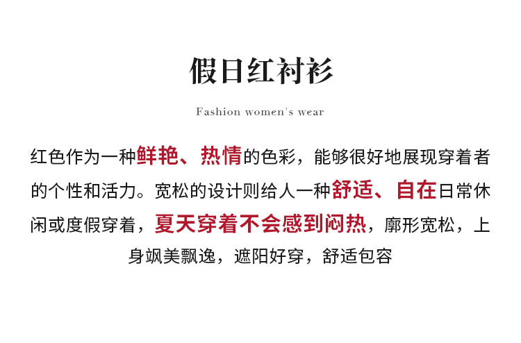 【商场同款】CNB4583 “ 假日红衬衫 ” 松弛感廓形衬衫 夏天穿着不会感到闷热,廓形宽松,上身飒美飘逸,遮阳好穿,舒适包容