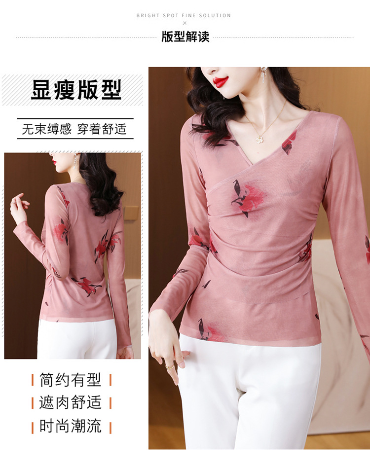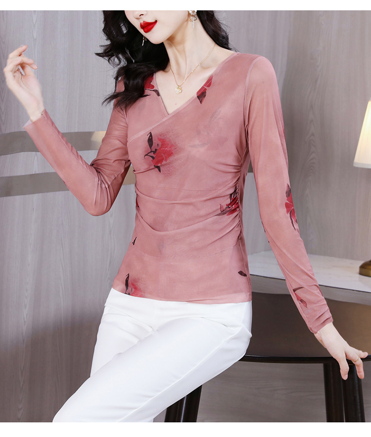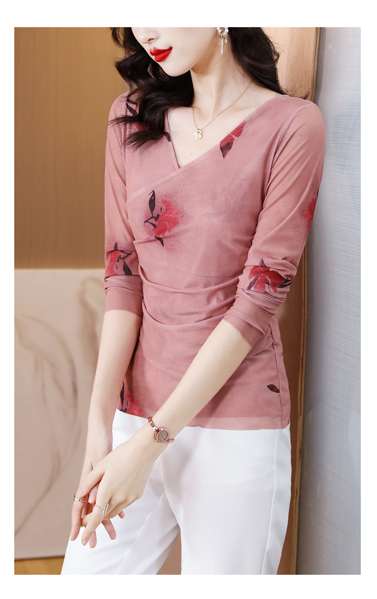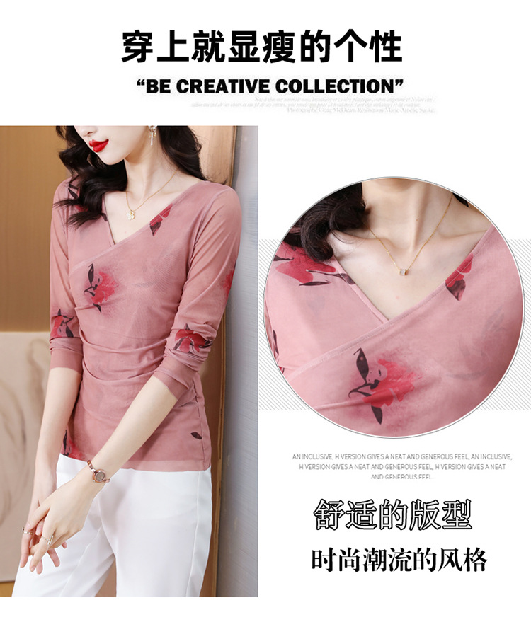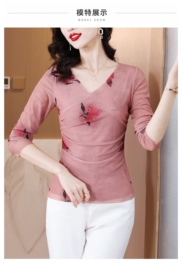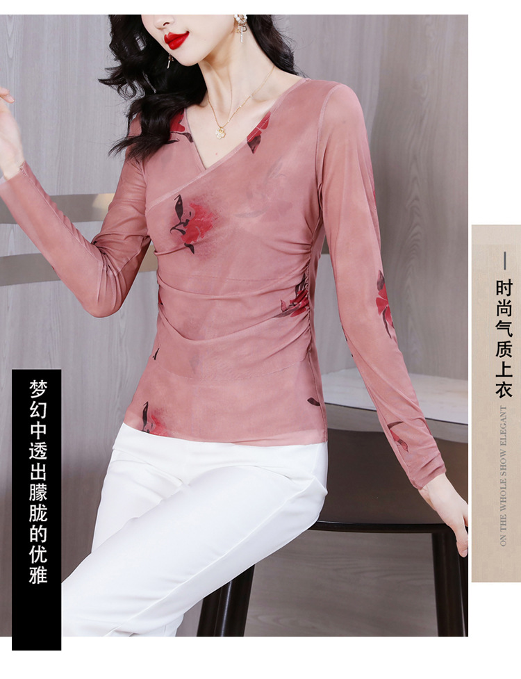 早秋新款,设计感小众女花卉印花v领复古别致优雅长袖上衣KQL-B40N2271