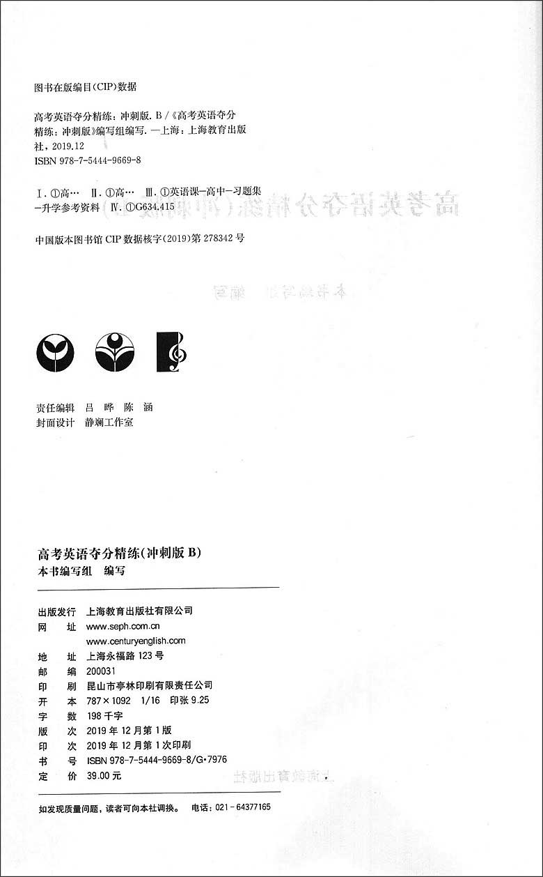 高考英语夺分精练 冲刺版B 一小时/周 世纪外教名师指导高考英语精练系列 上海高考英语重难点 课外复习辅导资料 上海教育出版社