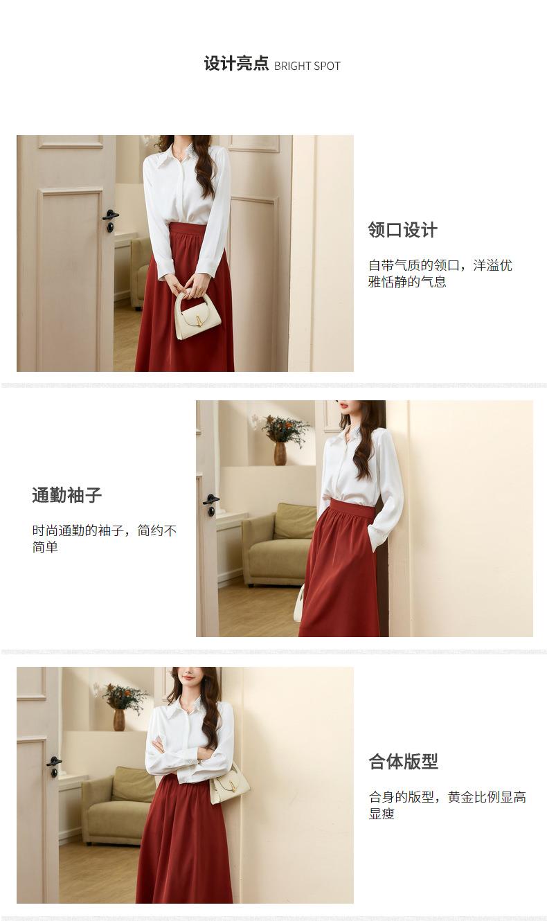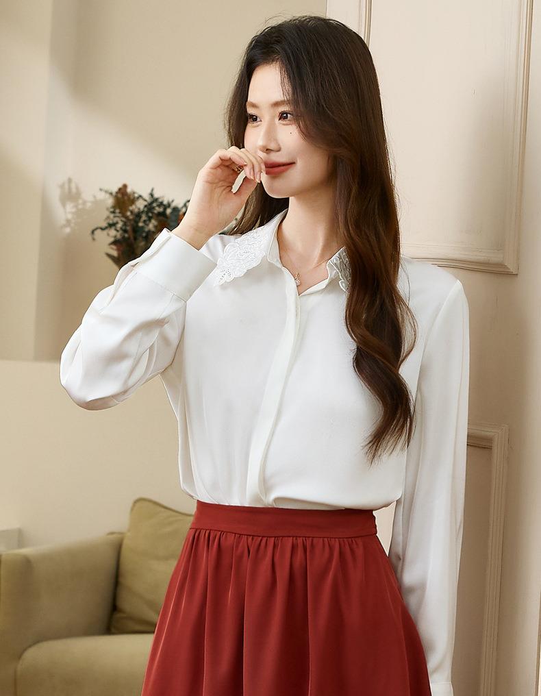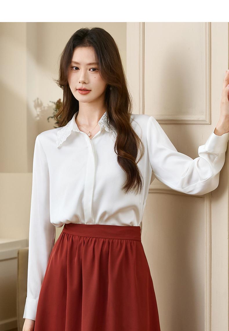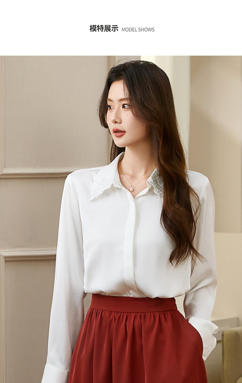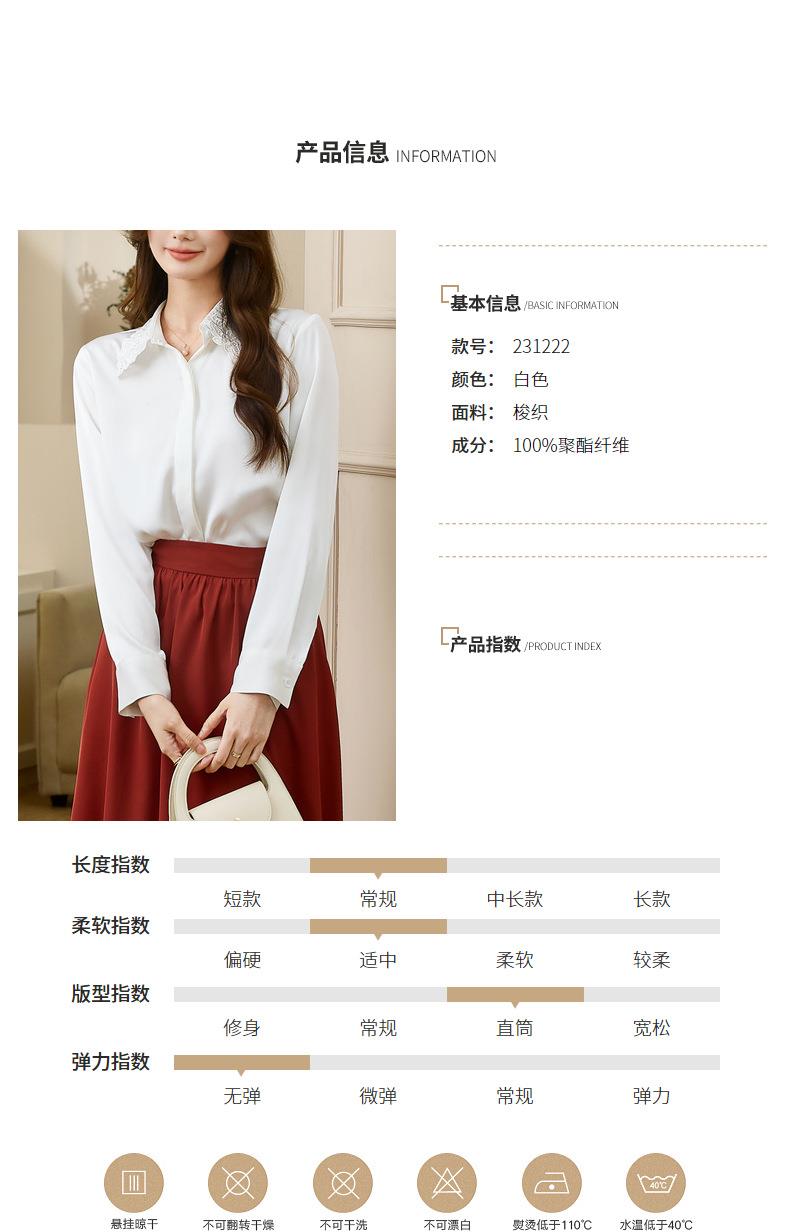 百姿 都市丽人刺绣翻领长袖衬衫女2023早秋新款纯色上衣231222