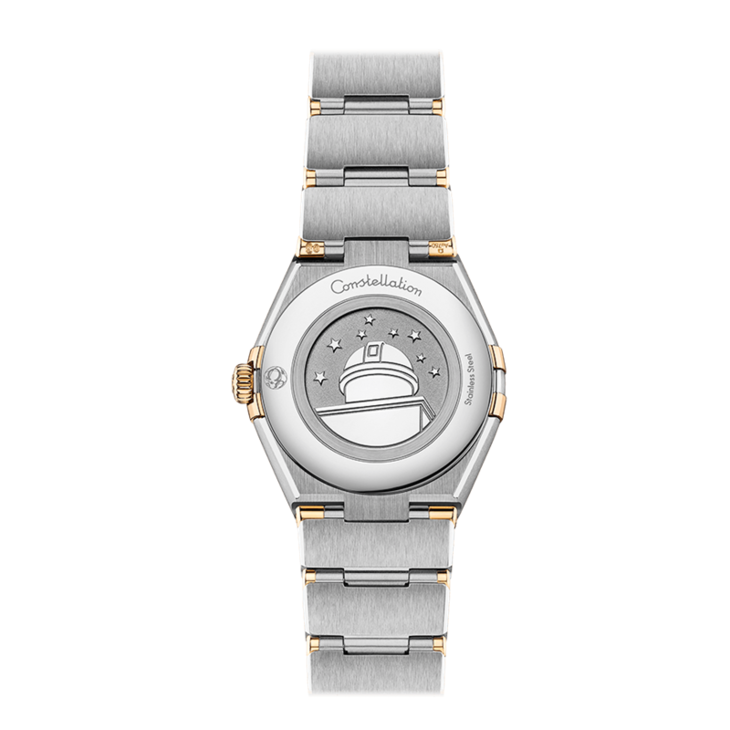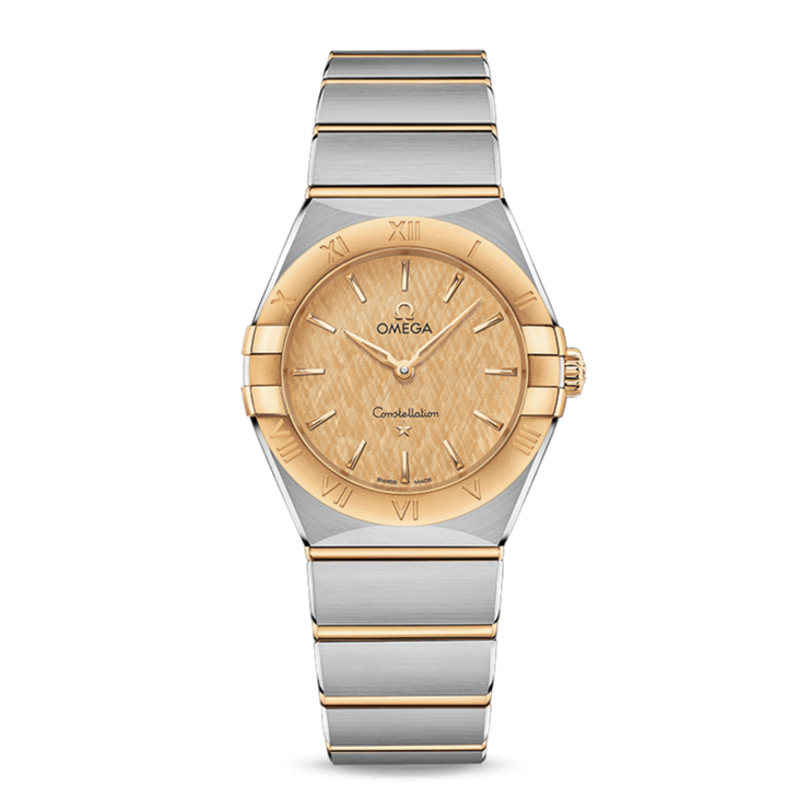 镜面材质 | 蓝宝石水晶玻璃 | 表盘 | 经典的半月形切面、“托爪”以及mono-rang表链。 黄色18K金与精钢打造,表圈镌刻罗马数字刻度,香槟色表盘呈现丝绸纹理,覆以耐磨损蓝宝石玻璃表镜。指针、欧米茄品牌标识、星座徽标以及小时刻度亦以黄色18K金打造而成。 密底 |