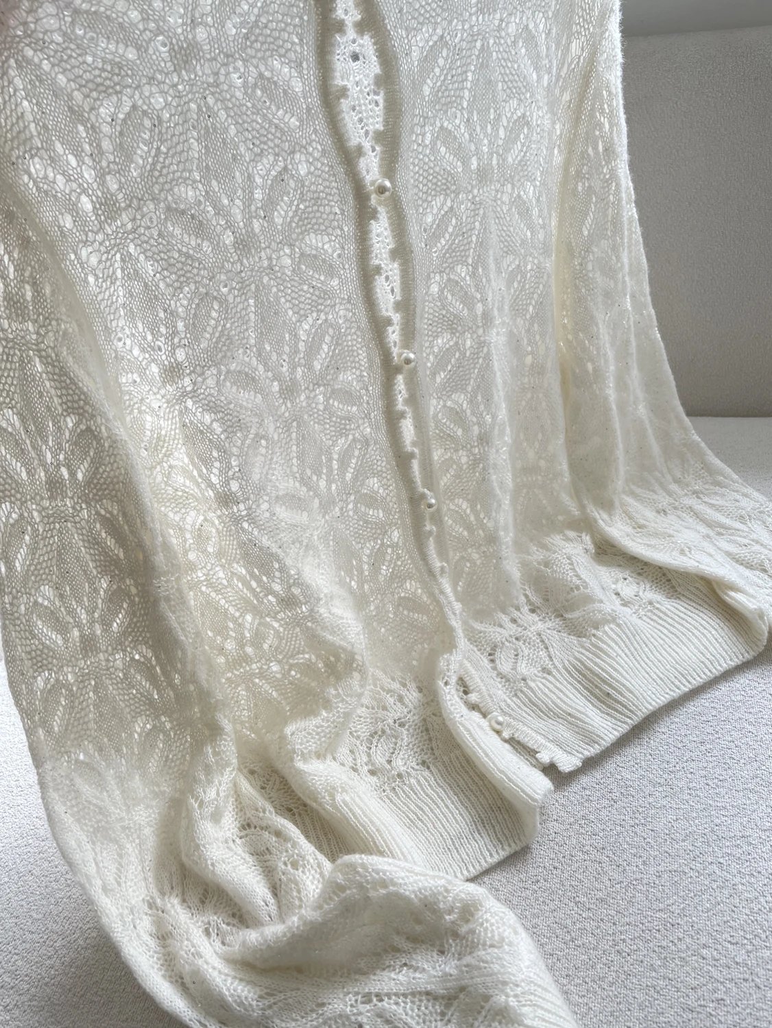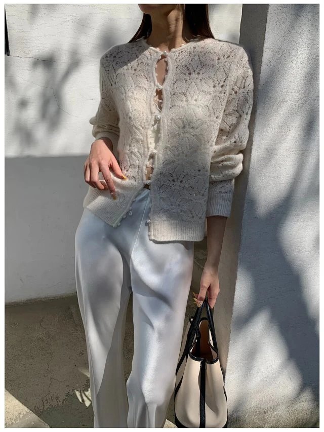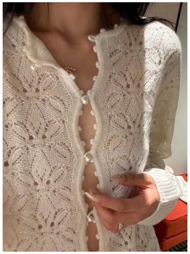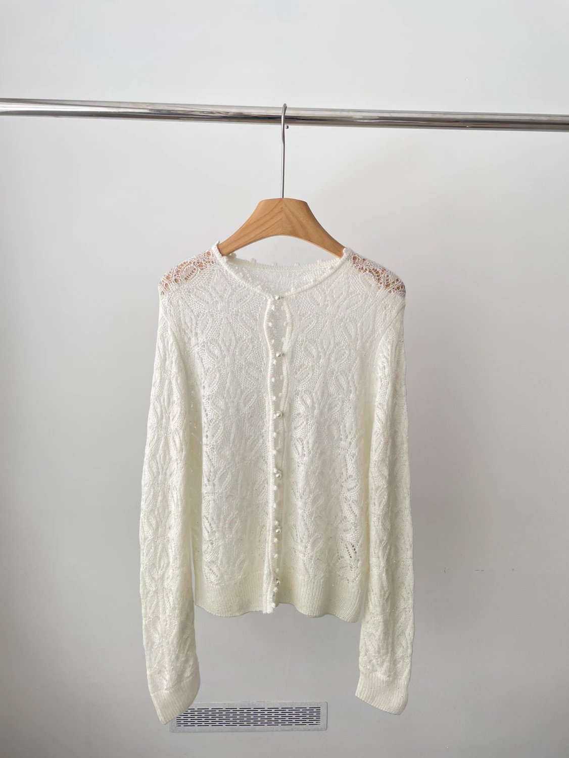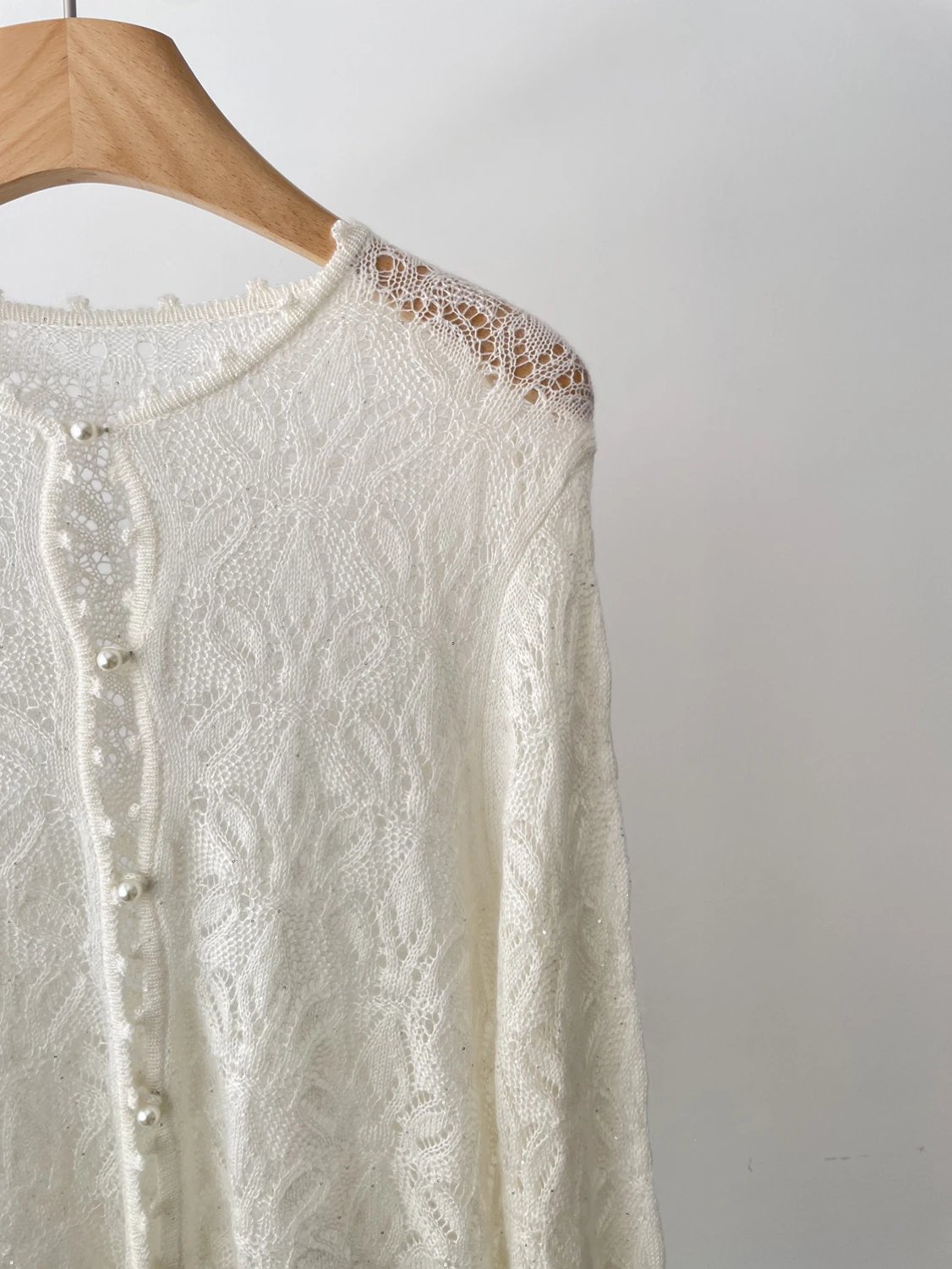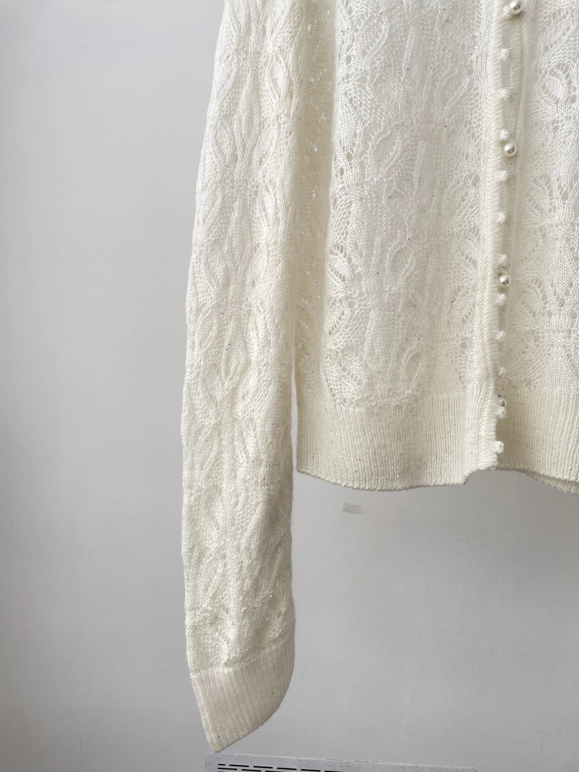 重磅渠道 ER真丝羊绒镂空勾花开衫 超美珍珠扣开合针织开衫 温柔减领早春开衫