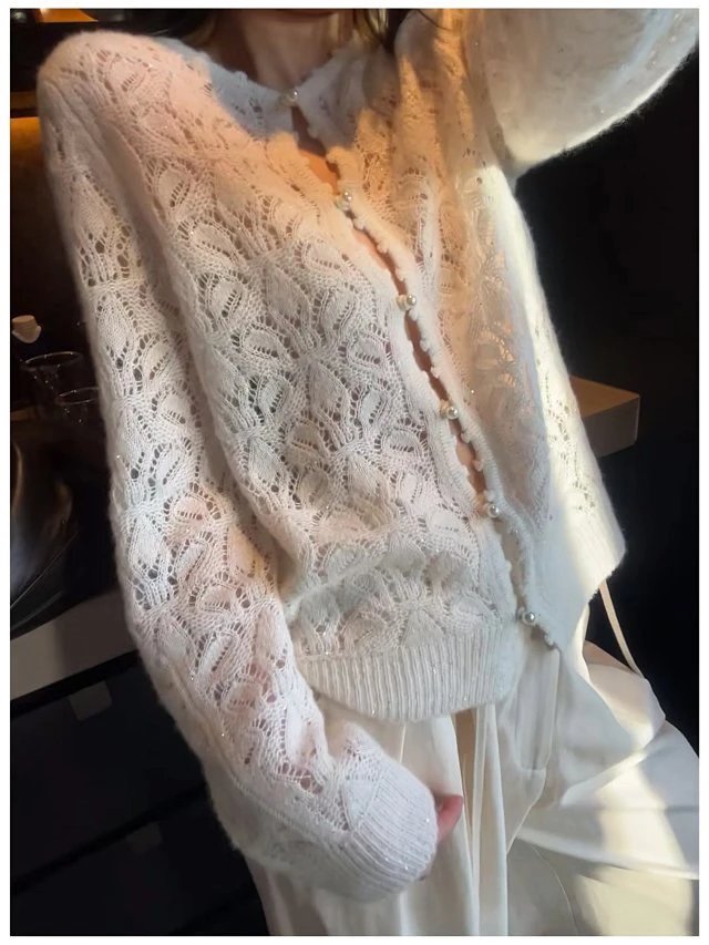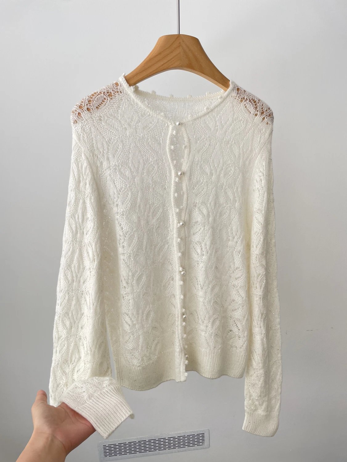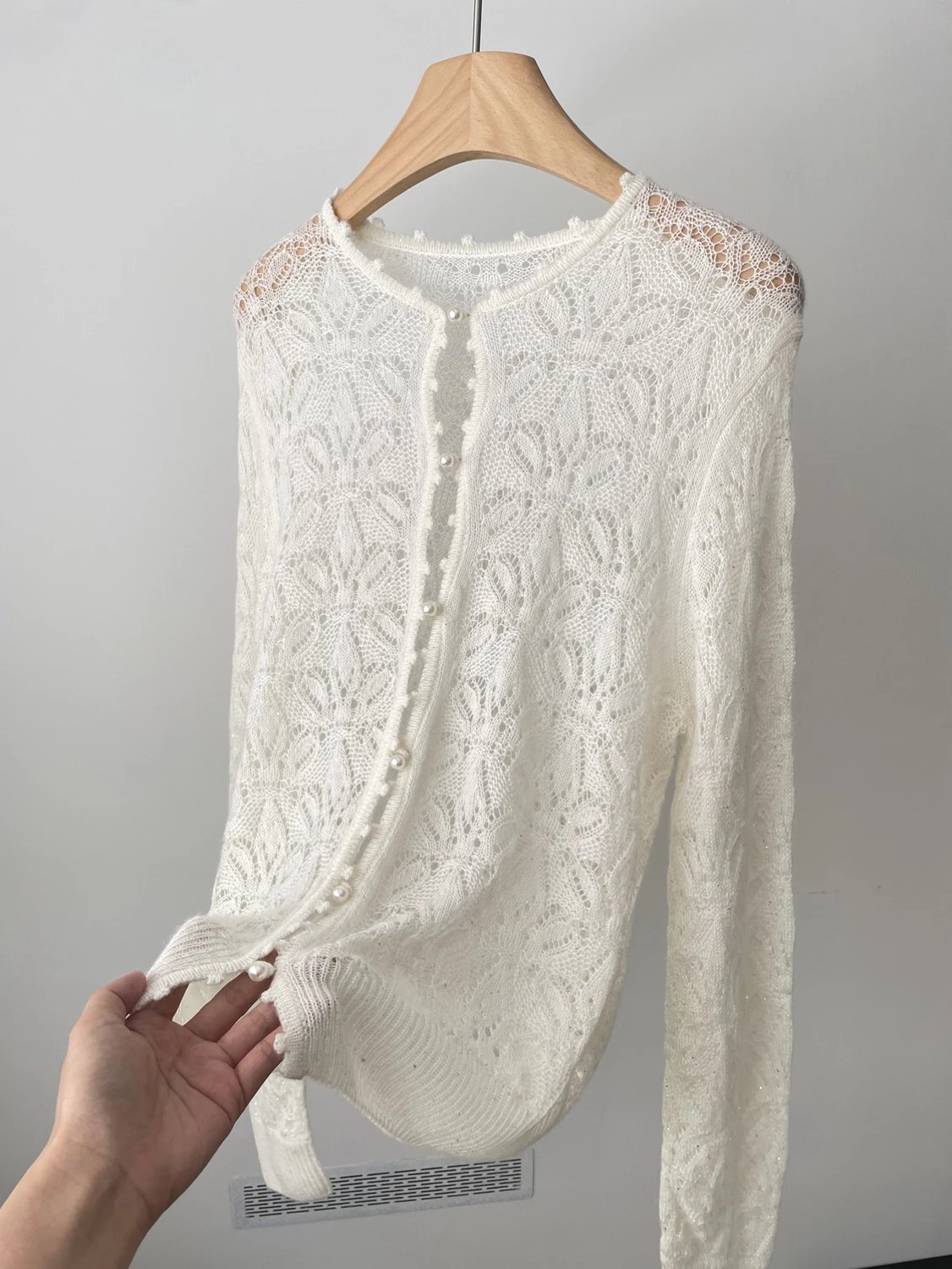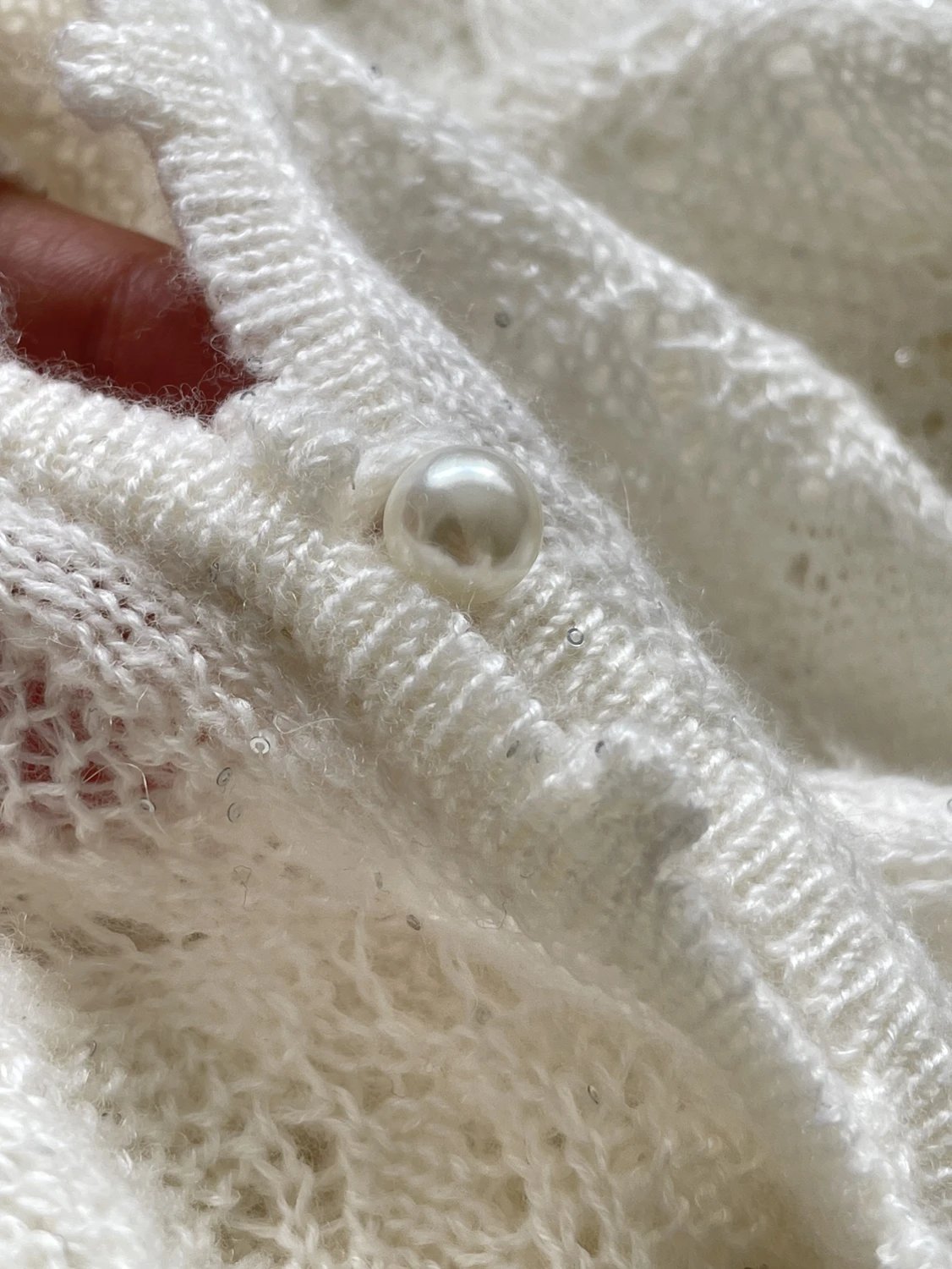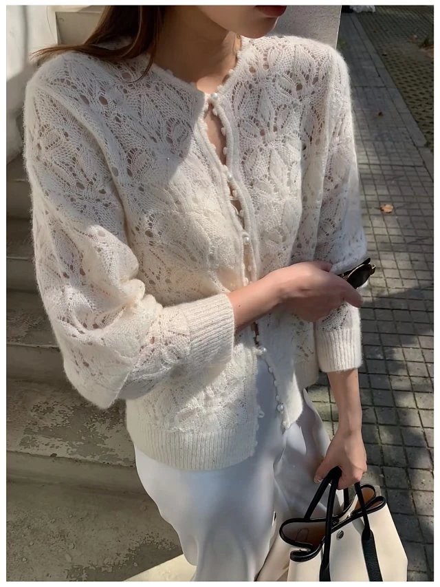 重磅渠道 ER真丝羊绒镂空勾花开衫 超美珍珠扣开合针织开衫 温柔减领早春开衫