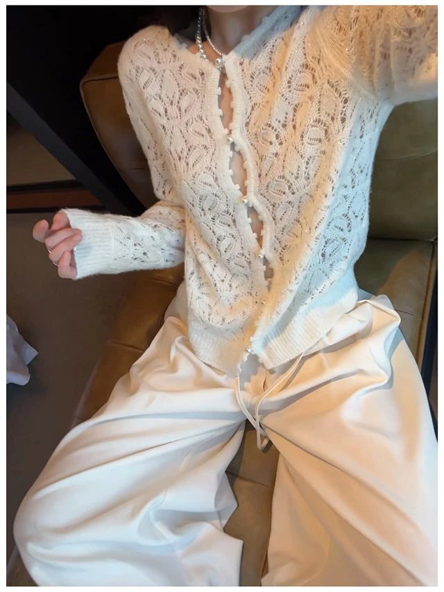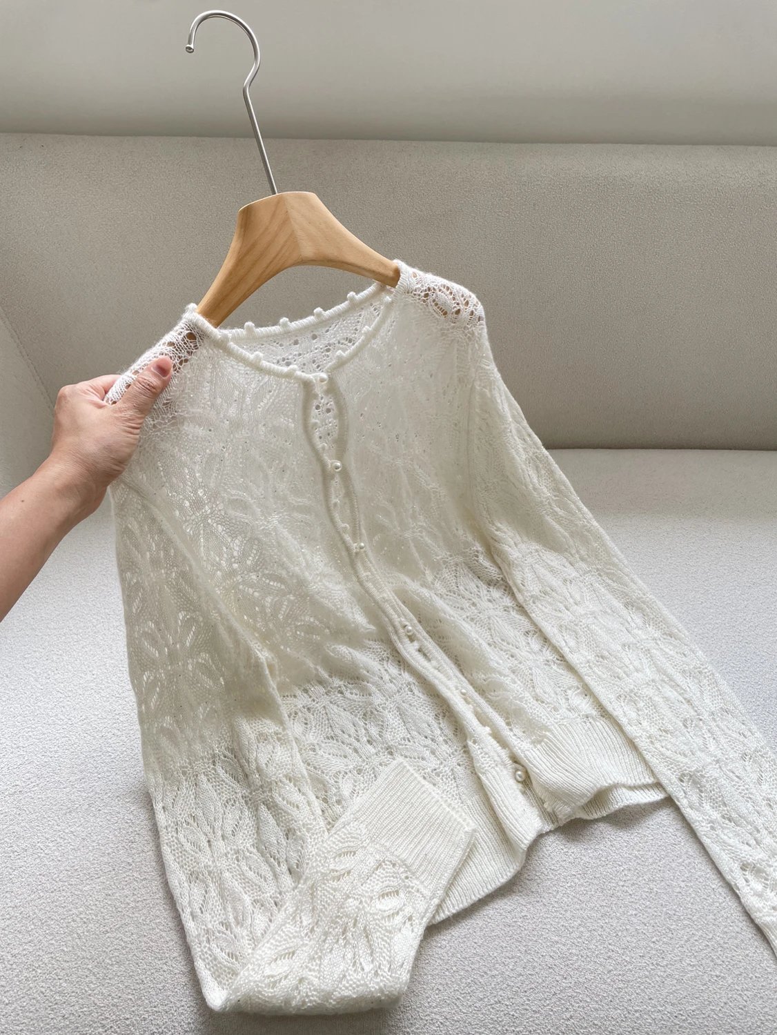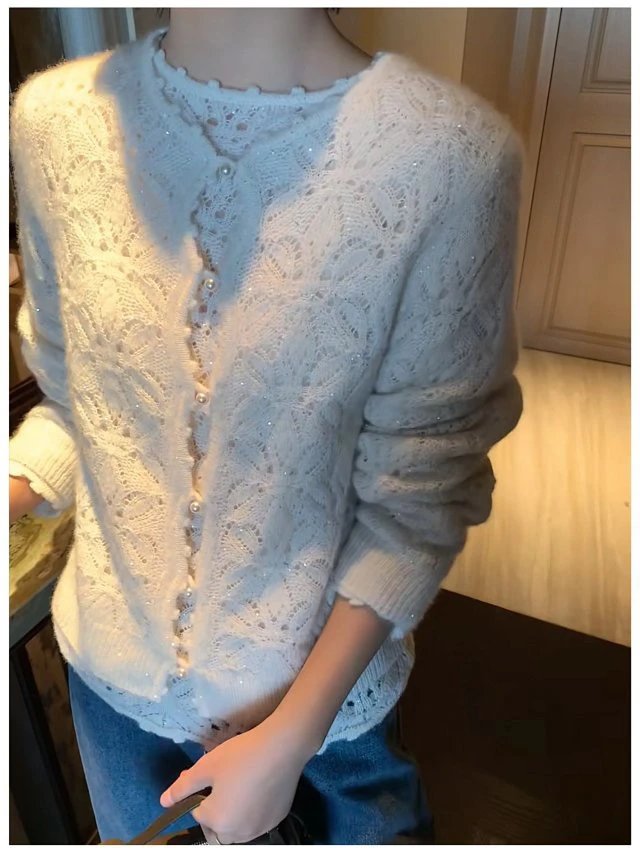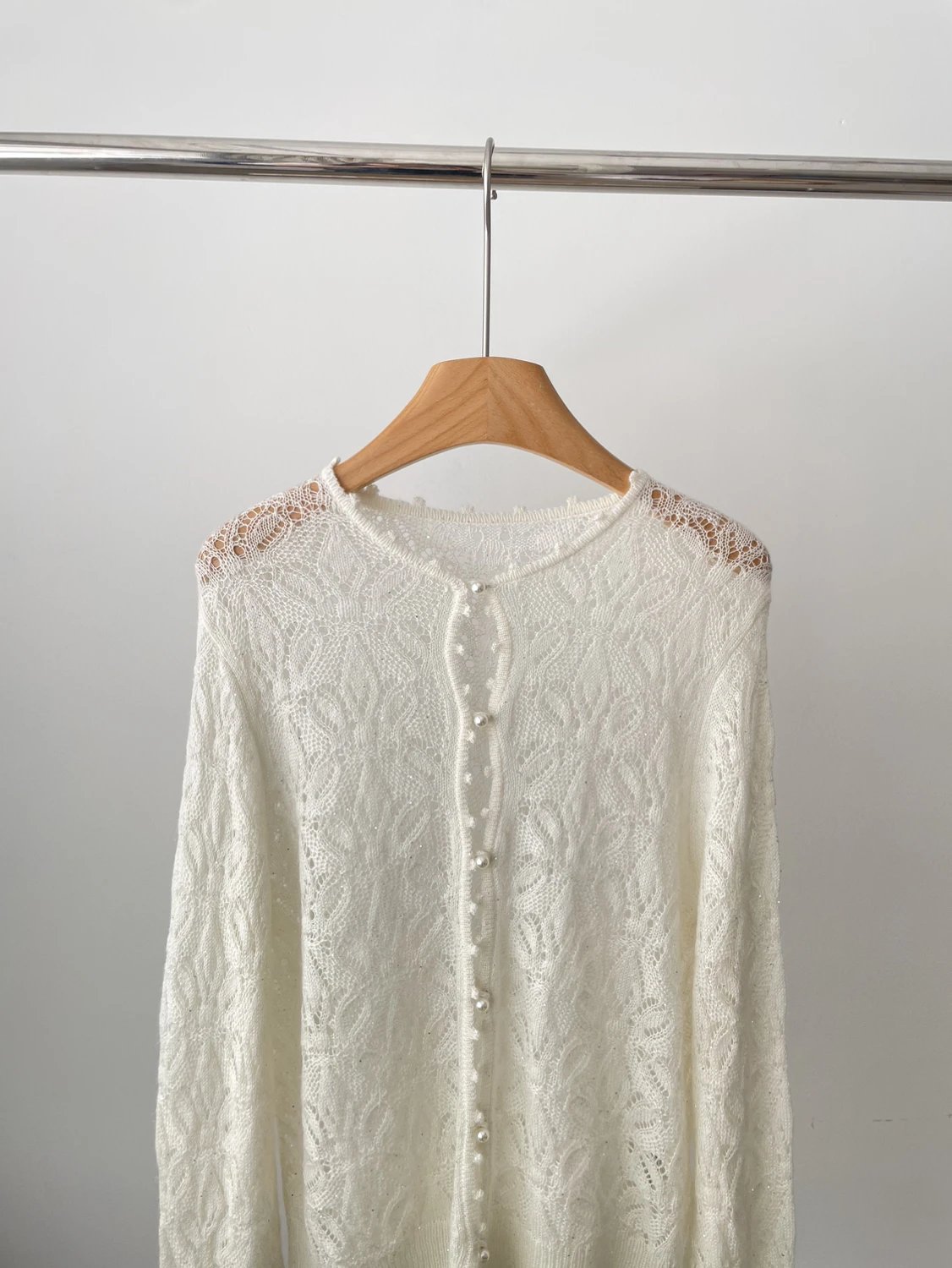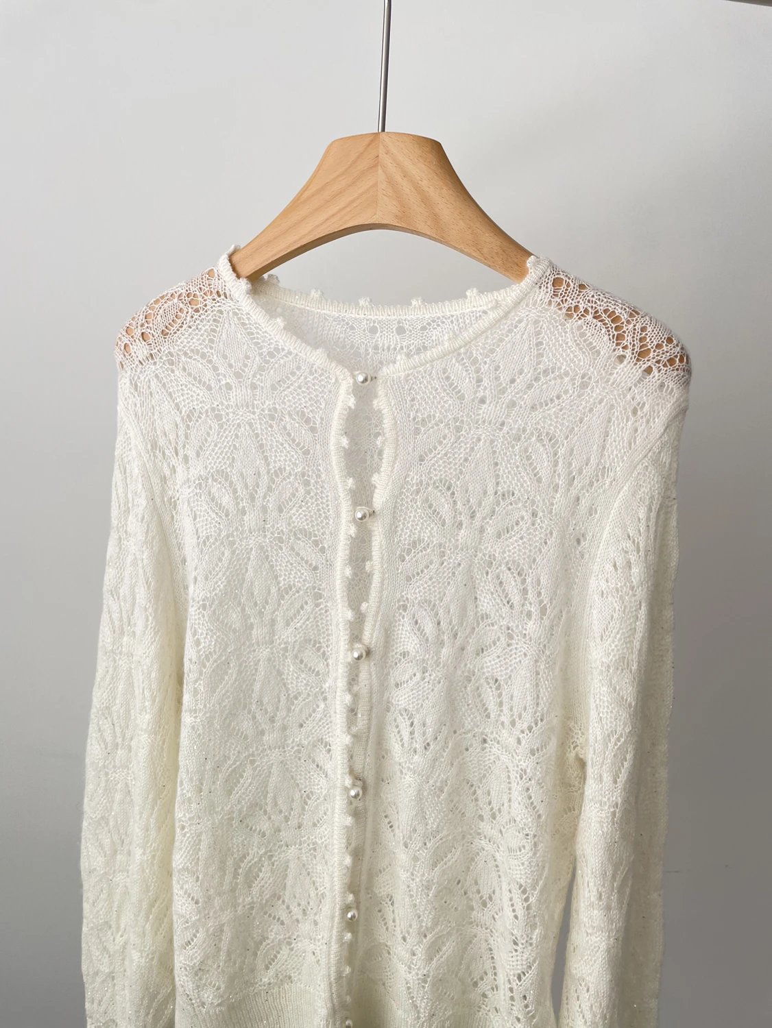 重磅渠道 ER真丝羊绒镂空勾花开衫 超美珍珠扣开合针织开衫 温柔减领早春开衫