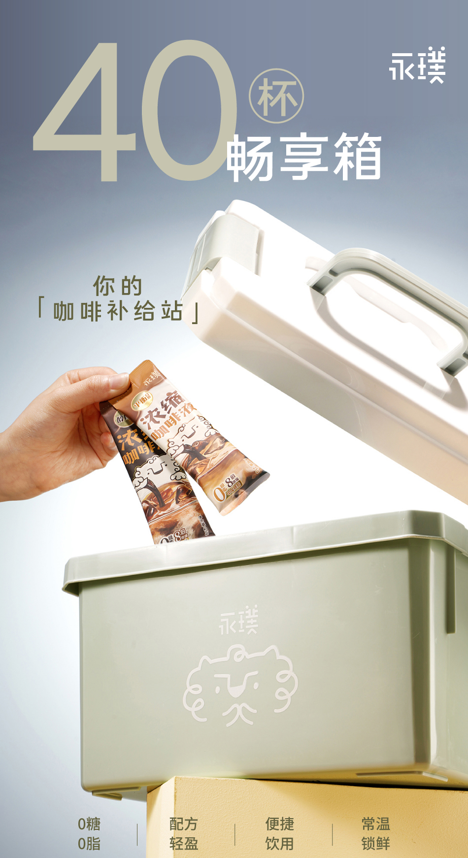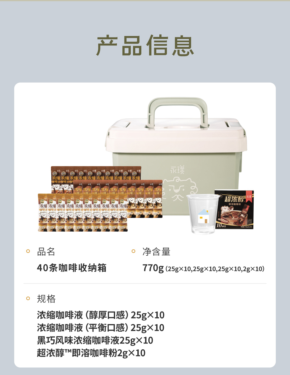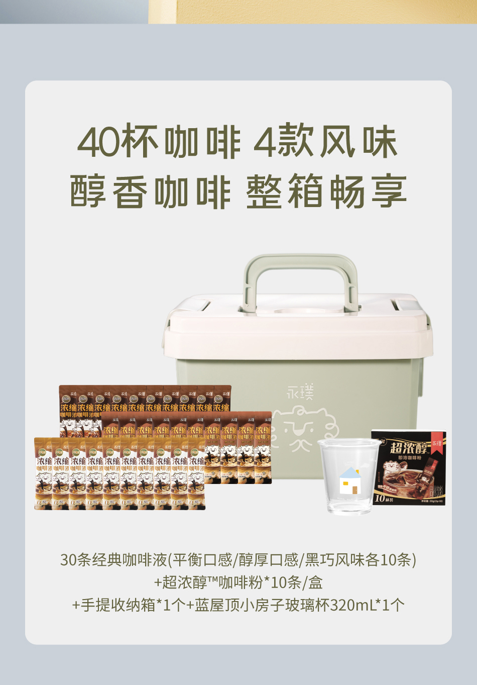 永璞咖啡液畅享装40杯4款风味🔺一个常温保存的Espresso🥤8倍浓缩,0糖0脂,排油解腻,大餐救星,减脂健身人士最爱!还送永璞手提收纳箱+蓝屋顶小房子玻璃杯