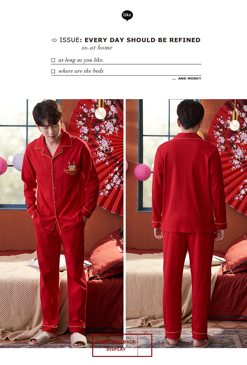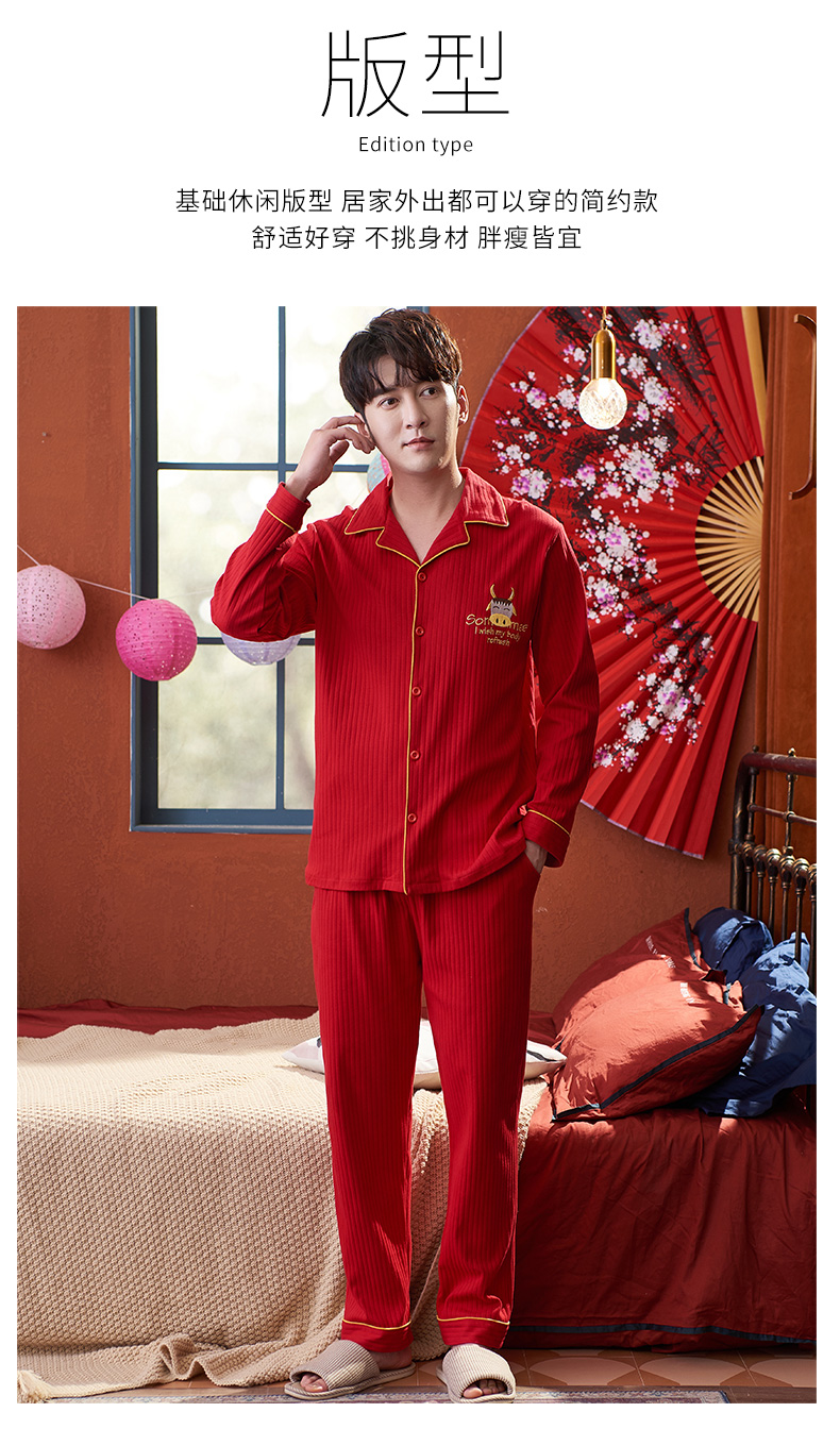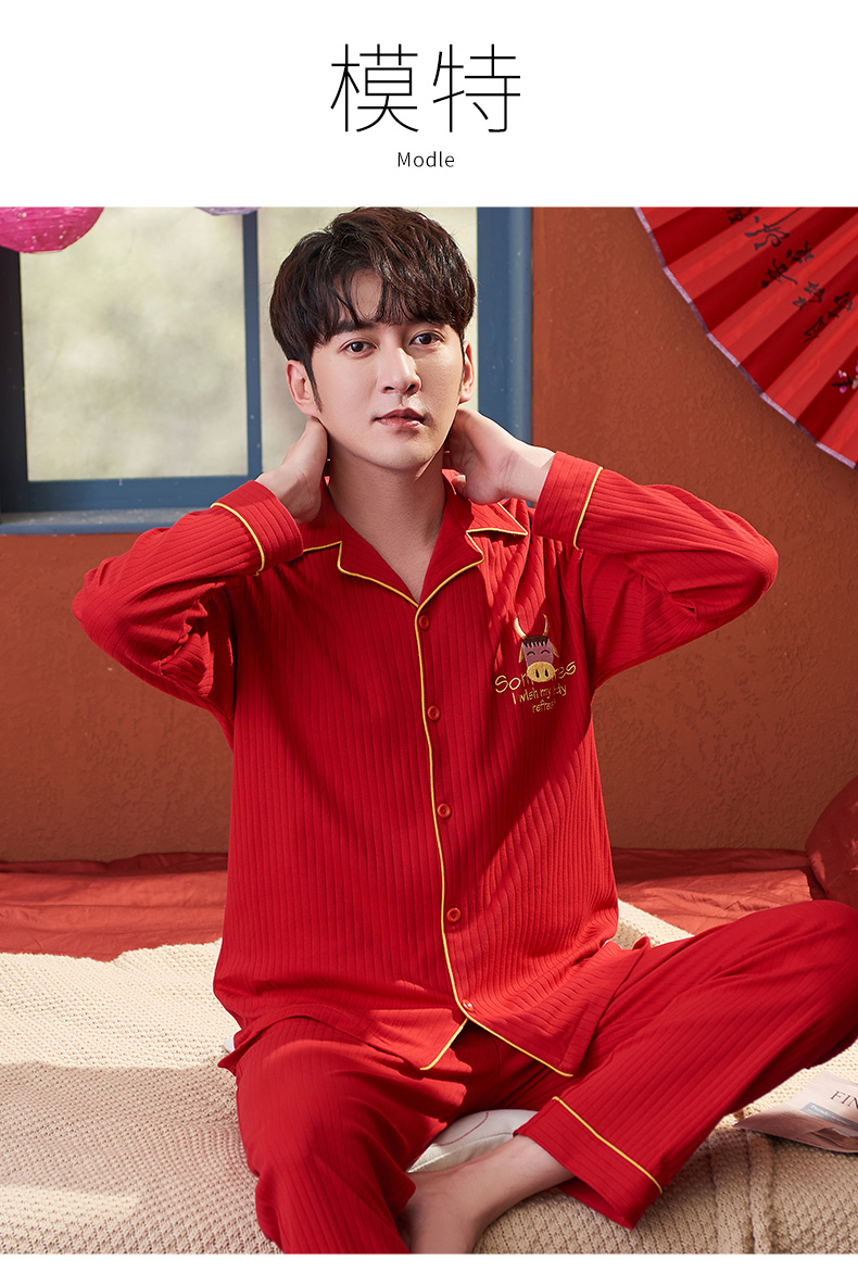猫人长袖开衫睡衣男MR6616N红色双面100%棉
