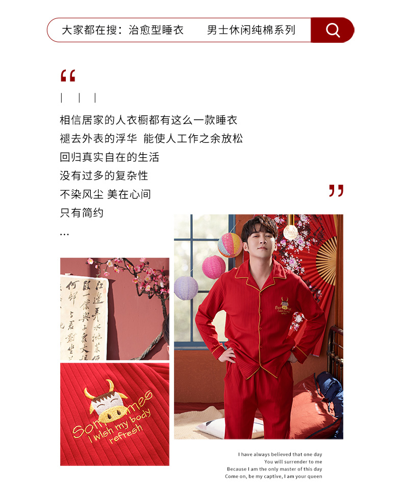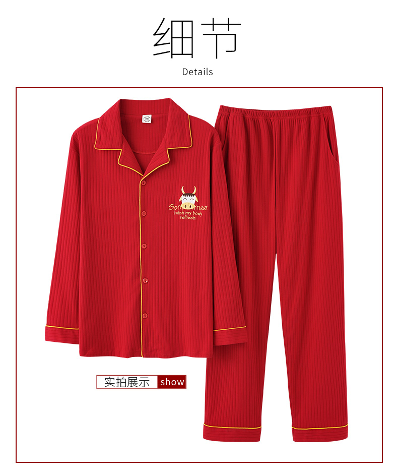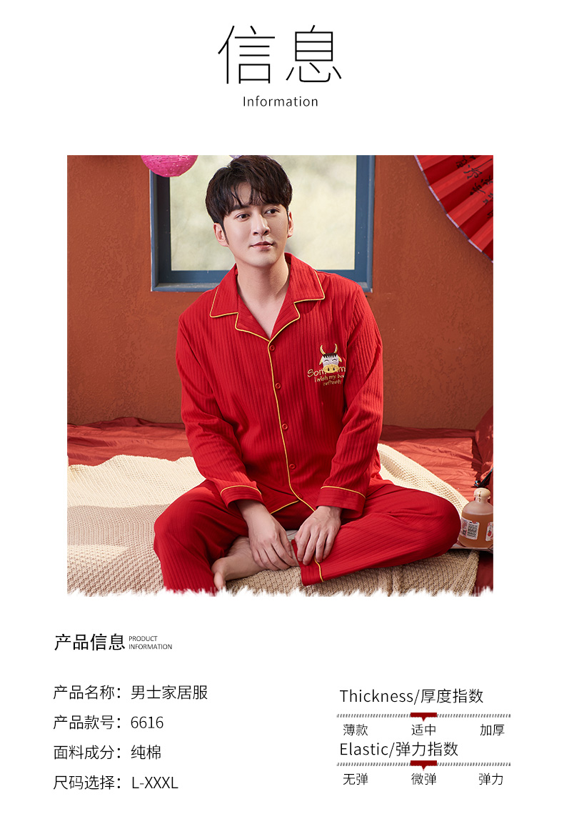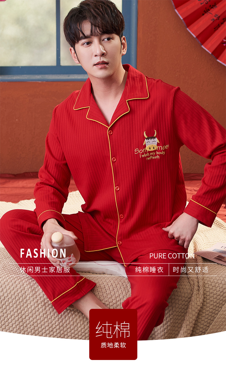 猫人长袖开衫睡衣男MR6616N红色双面100%棉
