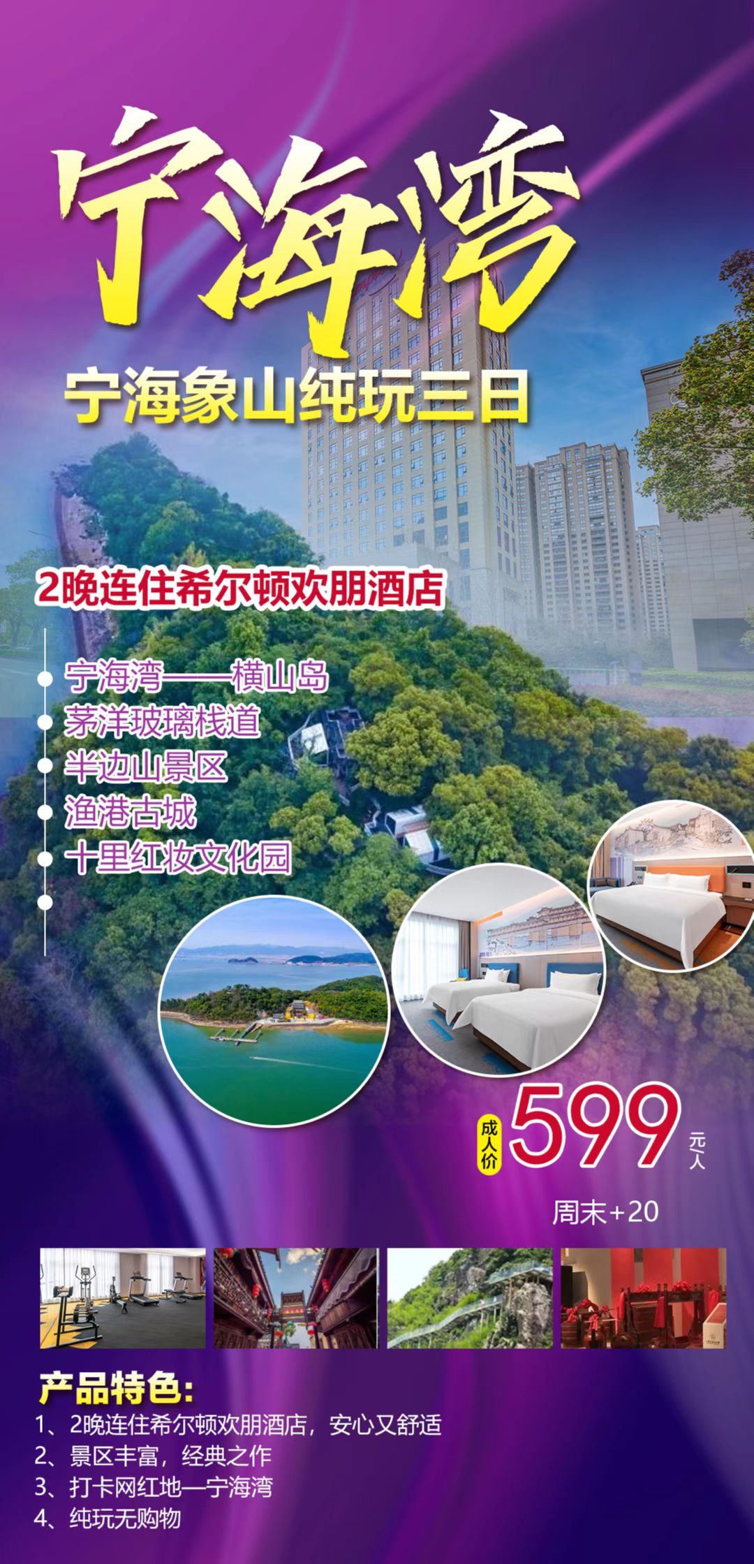 至尊宁海•奢华象山•『2晚希尔顿欢朋酒店』打卡网红宁海湾-半边山-夜游石浦鱼港!探寻十里红妆文化馆,3天2晚高品质度假游!