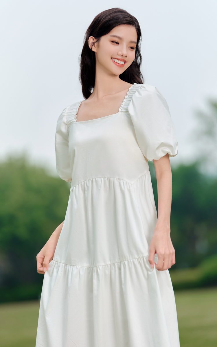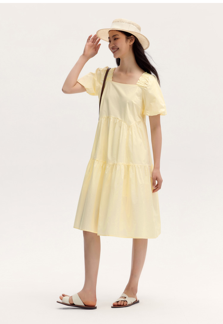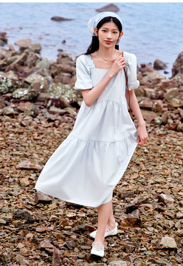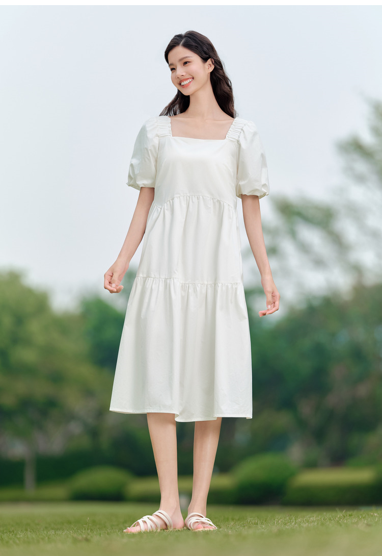森马连衣裙女温柔系木耳边方领夏季新款泡泡袖娃娃裙甜美可爱