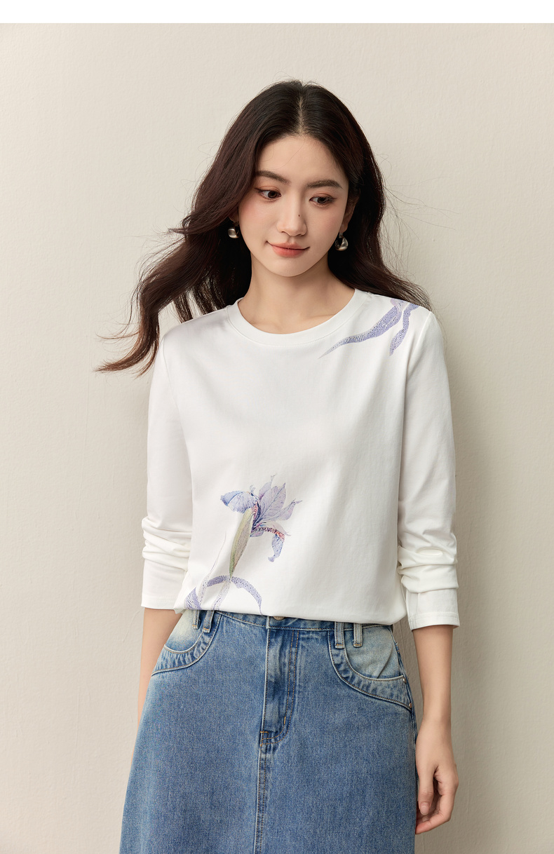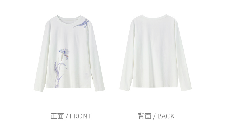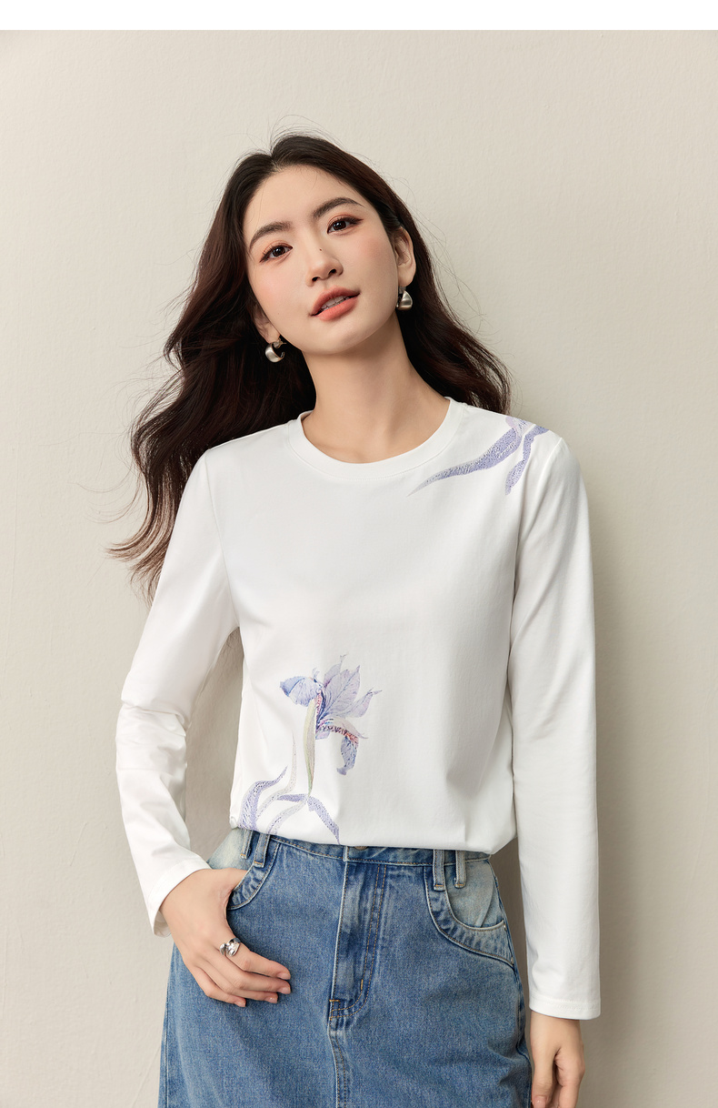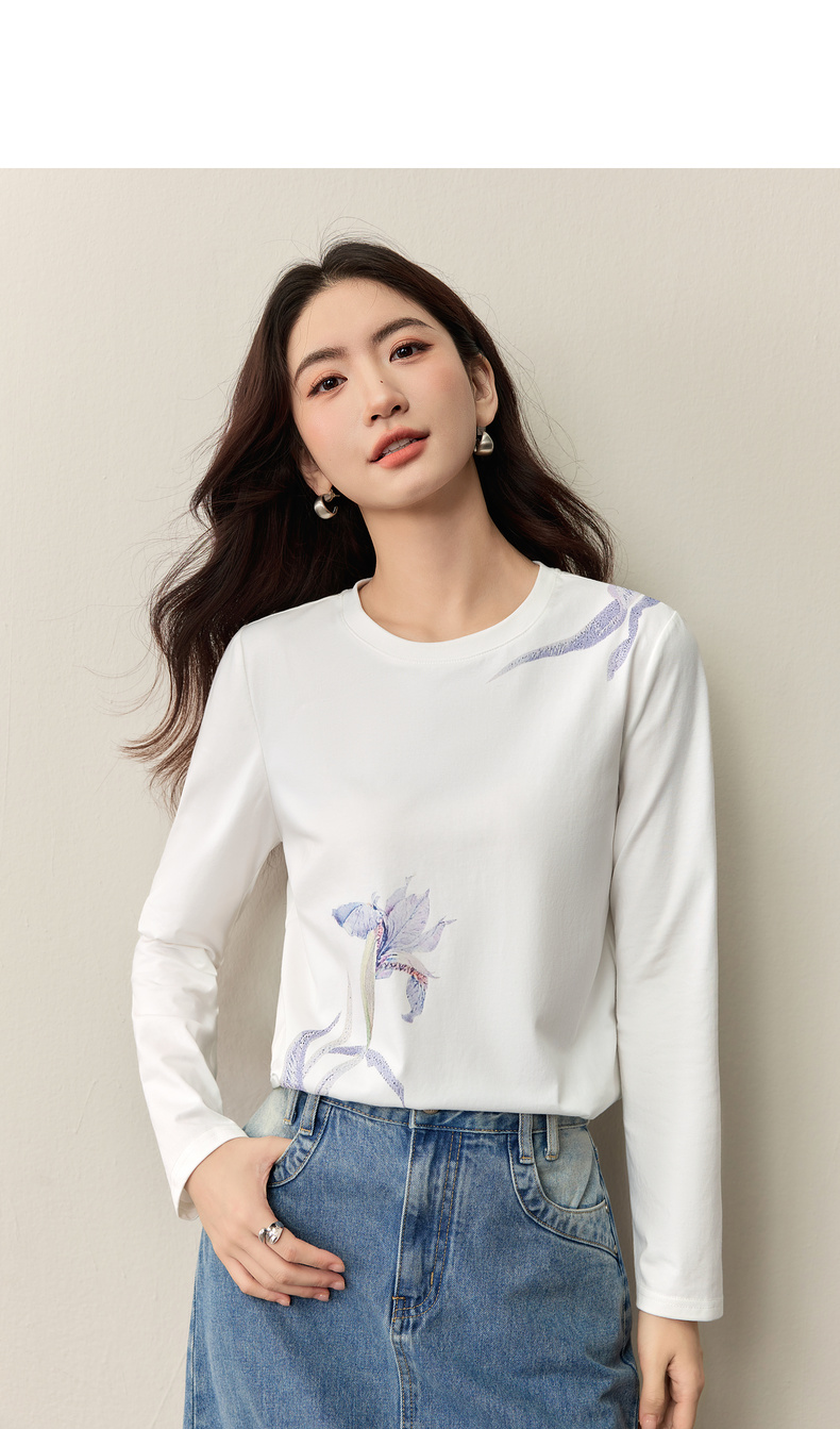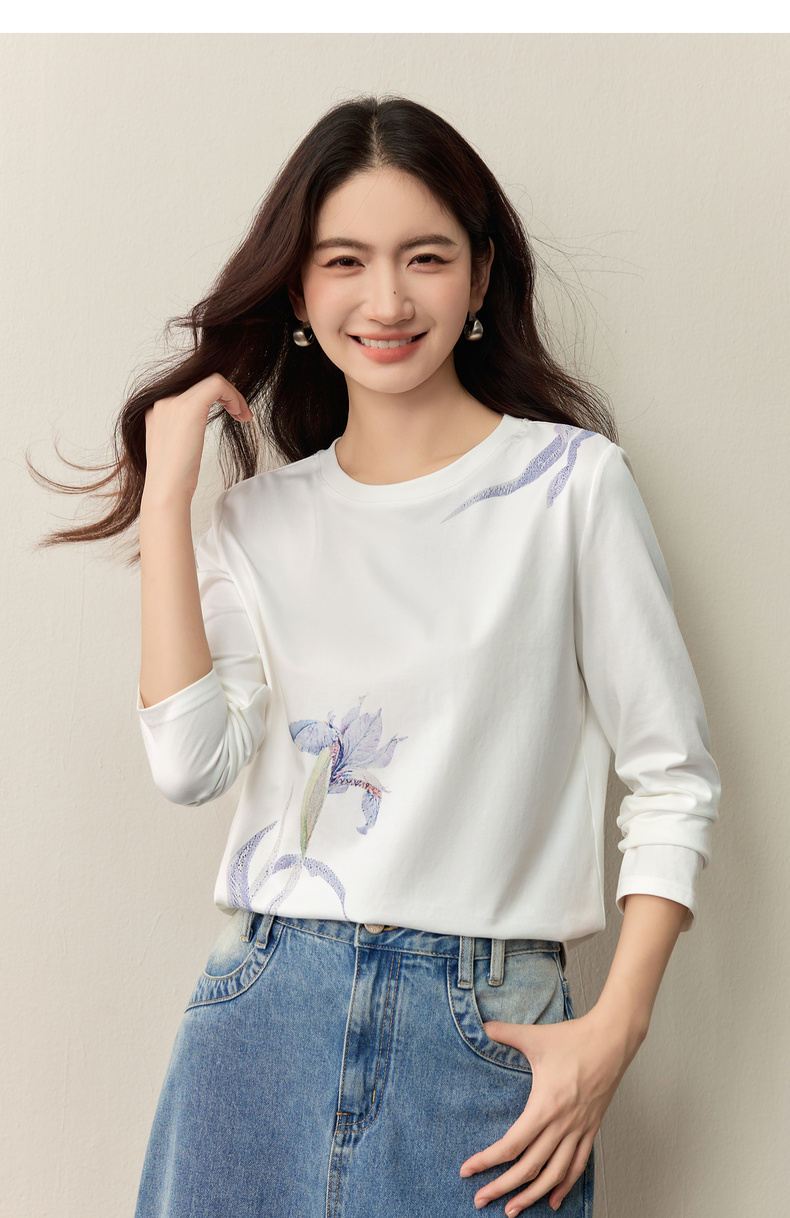 【内购】【鸢尾花】简约通勤圆领艺术数码印花长袖精梳棉T恤-153TG2502