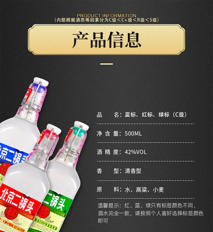 北京二锅头出口小方瓶42度清香型白酒500ml*6瓶红蓝绿三色混装金奖小方瓶