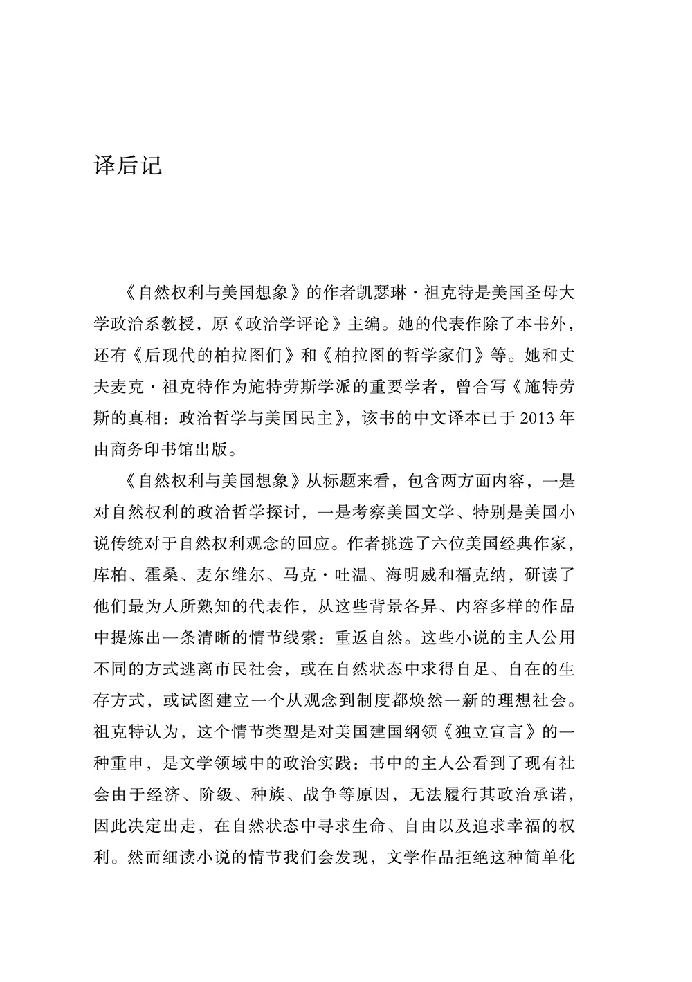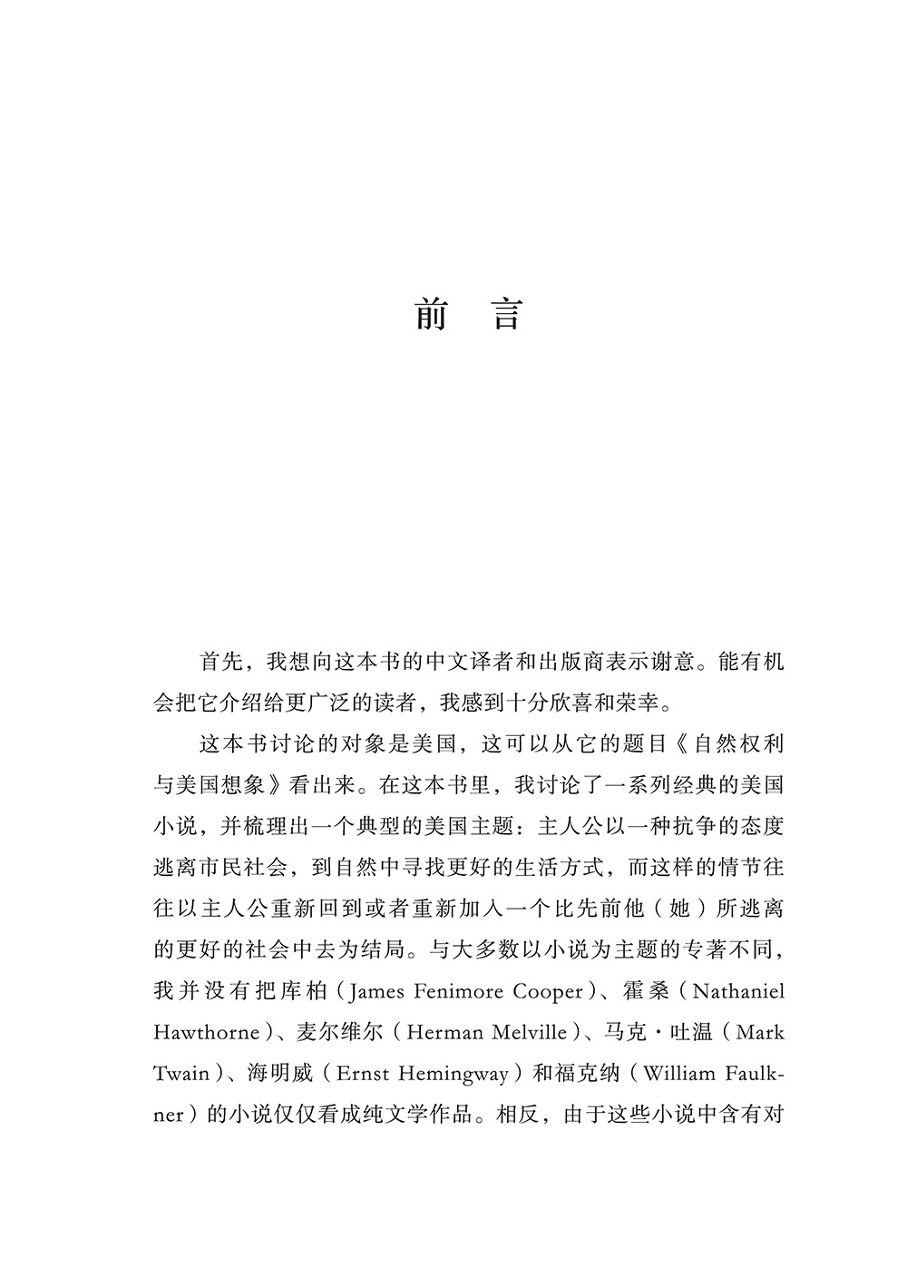 一是阐释自然权利的内涵,二是提炼美国文学特别是美国小说传统对于自然权利观念的回应。祖克特挑选六位美国本土作家——库柏、霍桑、麦尔维尔、马克·吐温、海明威和福克纳,研读他们最为人所熟知的代表作。在她的精巧构思下,小说家的每一次重返自然,都是对美国立国精神的一次深刻反省,是对社会契约理念之实践意义的一次重新评估。