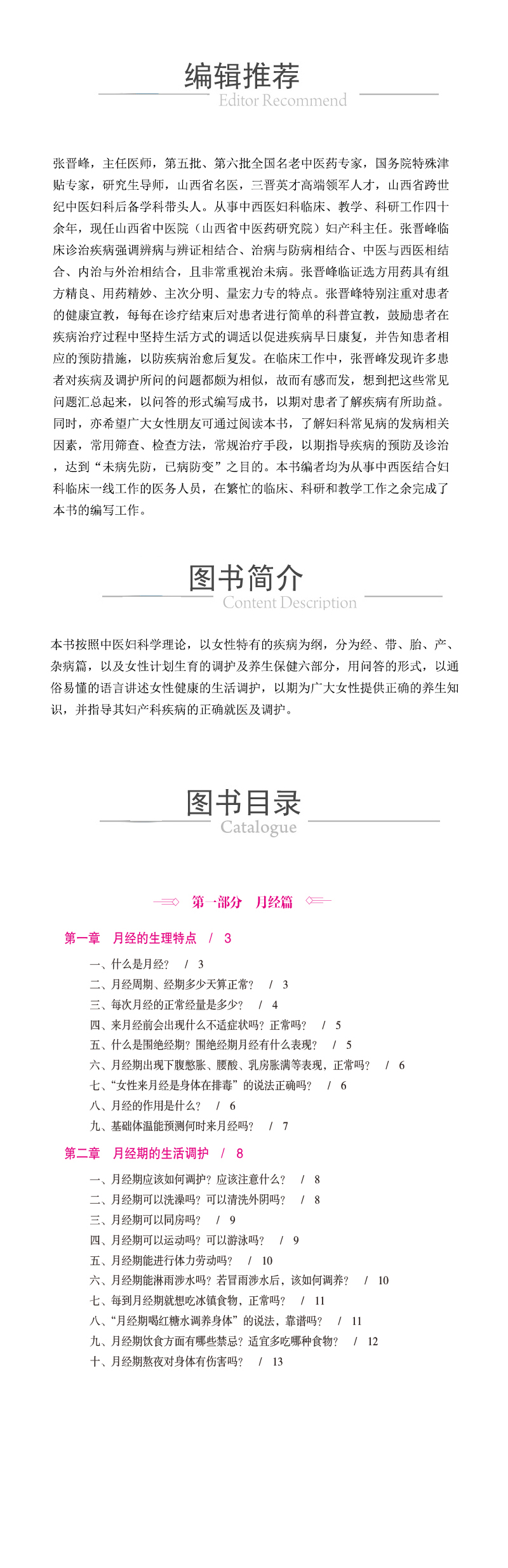 本书按照中医妇科学理论,以女性特有的疾病为纲,分为经、带、胎、产、杂病篇,以及女性计划生育的调护及养生保健六部分,用问答的形式,以通俗易懂的语言讲述女性健康的生活调护,以期为广大女性提供正确的养生知识,并指导其妇产科疾病的正确就医及调护。