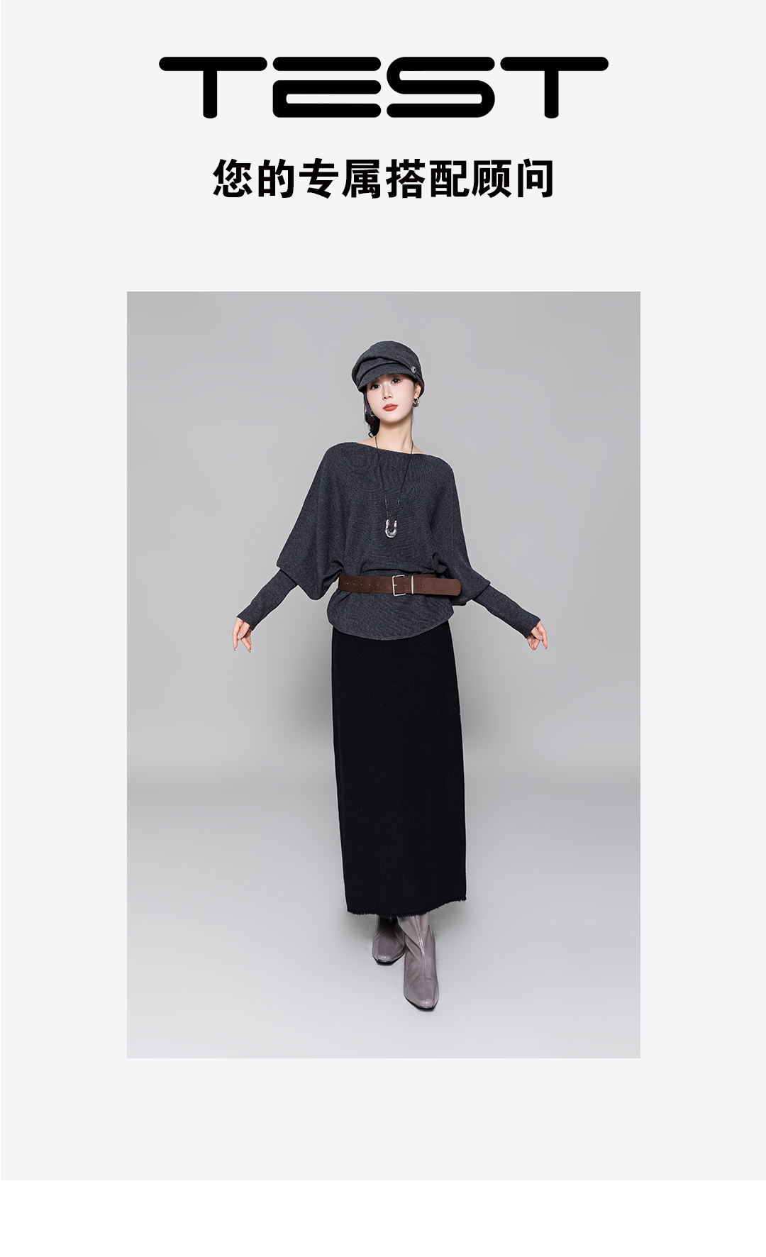 冬上新氛围感穿搭深灰色一字领蝙蝠袖毛衣1254042