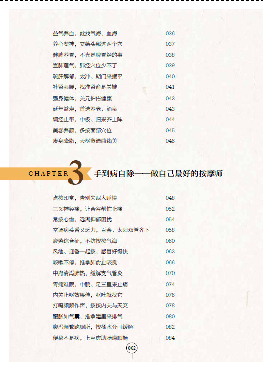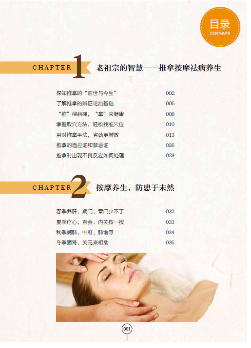 该书是“扫码学中医丛书”之一,全书共分为六章:第一章是“老祖宗的智慧——推拿祛病养生”,第二章是“推拿养生,防患于未然”,第三章是“手到病自除——做自己最好的按摩师”,第四章是“慢性疾病不用愁,推拿去病痛”,第五章是“搞别两性疼痛,不再讳疾忌医”,第六章是“儿科疾病养护法,呵护宝贝健康成长”。每一章都以深入浅出的语言、清晰的插图,为初学者多方位的展示了怎样学习按摩,以及在学习按摩的过程中要注意的方法和技巧。。同时,每个按摩动作都配有详细的视频讲解,扫一扫,就能轻轻松松学习相关的穴位按摩,健体祛病。