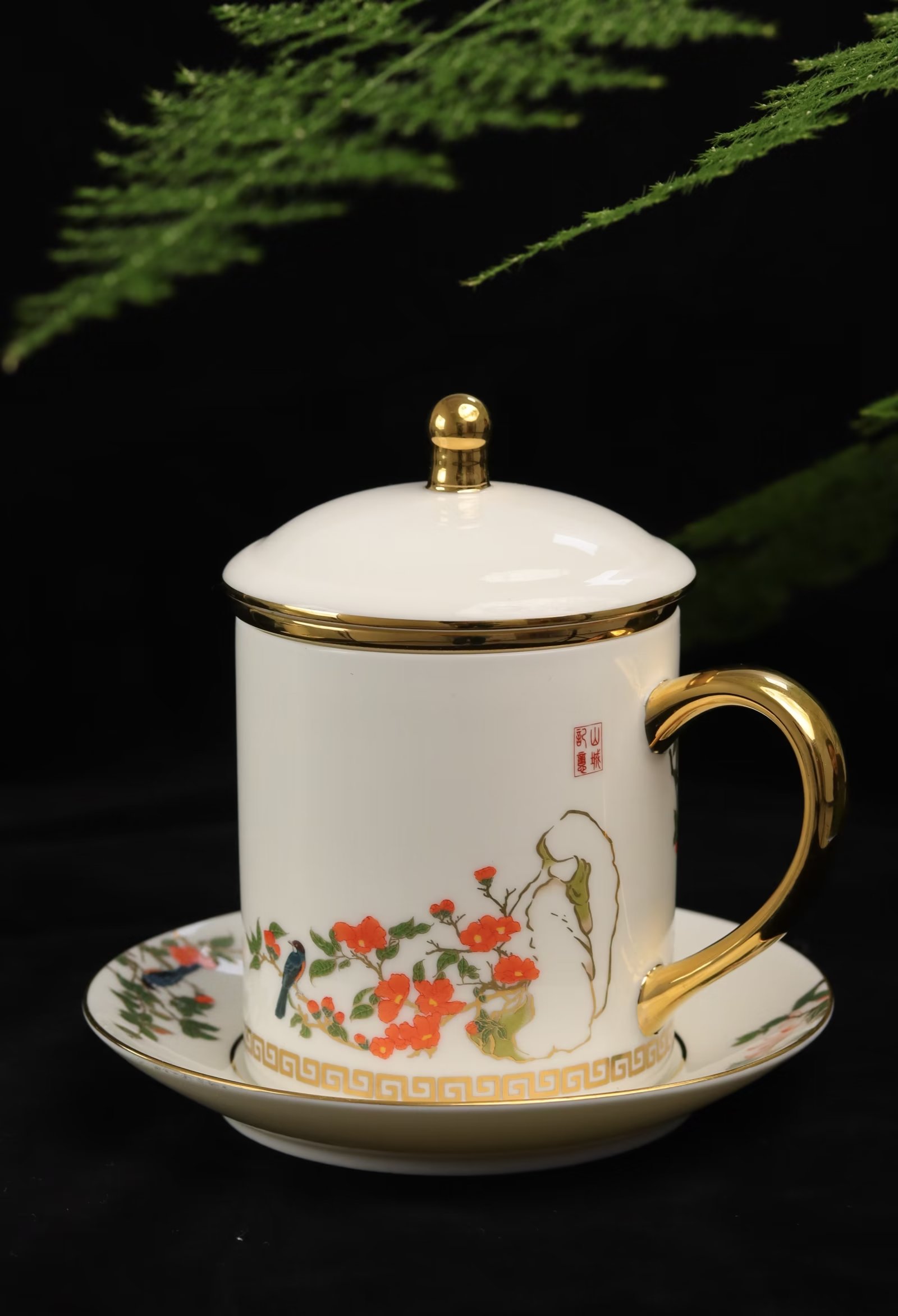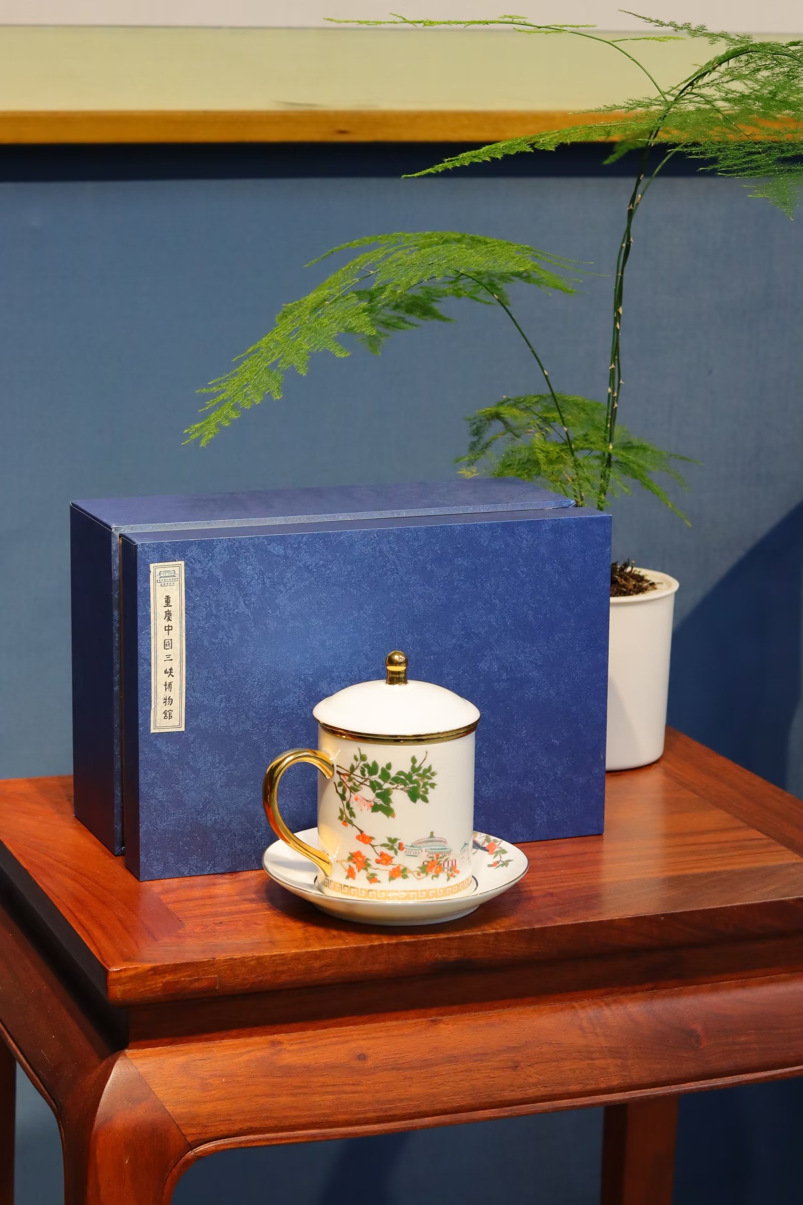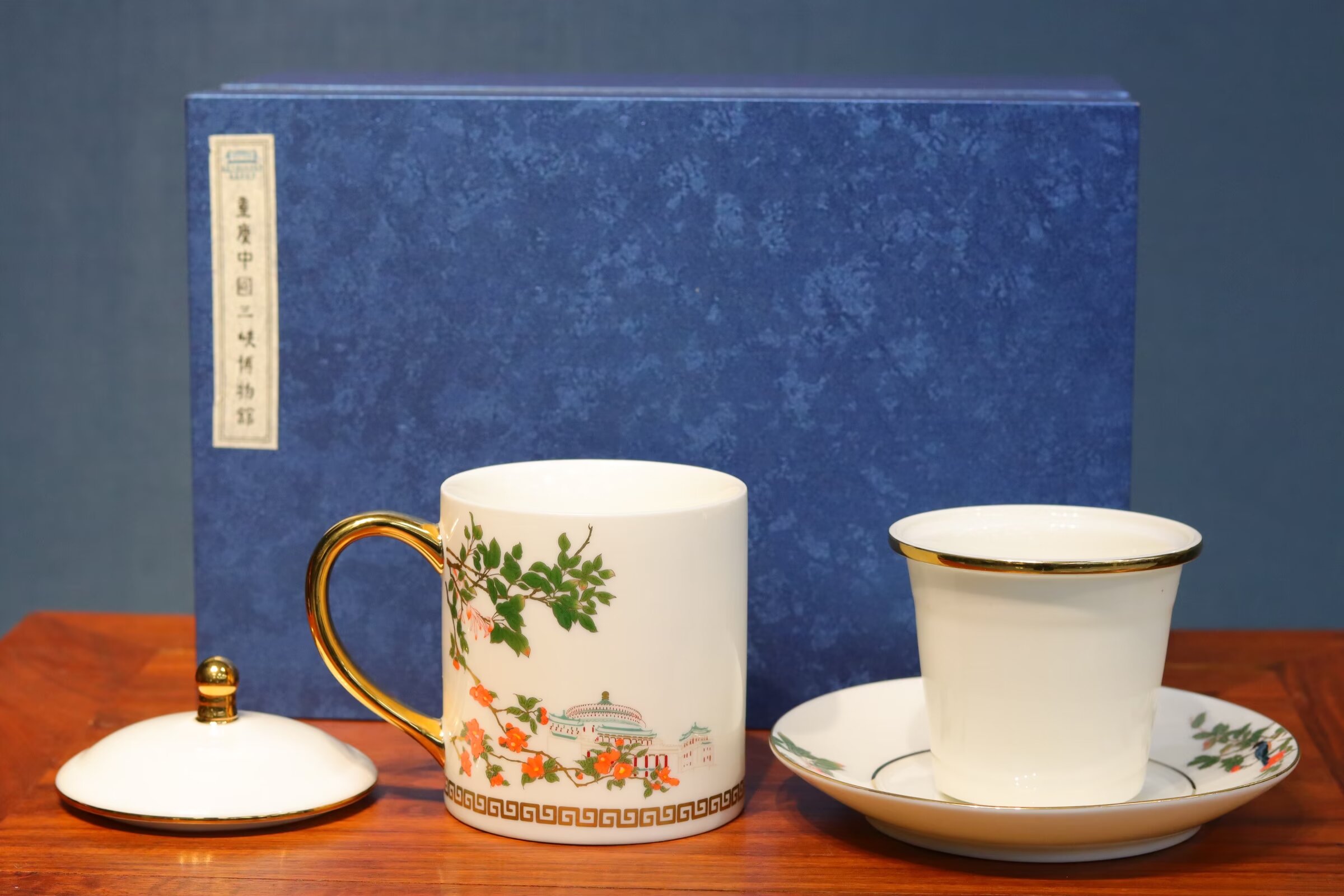《山城记忆办公杯》设计采用重庆市标志建筑物一重庆市人民大礼堂,重庆市花山茶花,以及重庆市市树黄葛树为元素,重庆大礼堂在黄葛树的点缀下一片春意盎然,有见证山城盎然成长的意义,也祝愿着人们的生活拥有满满的幸福安康。盖帽采用的重庆市人民大礼堂的顶部形状,配以金色勾边,凸显办公杯的大气与正式。