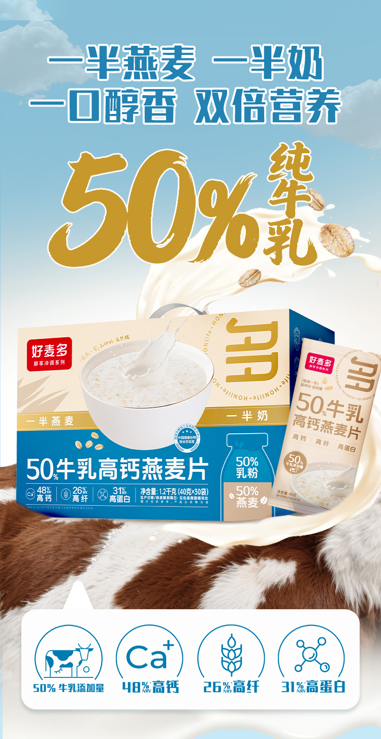 【双重蛋白】好麦多50%高钙牛乳燕麦片1.2kg营养早餐牛奶冲饮独立包装礼盒