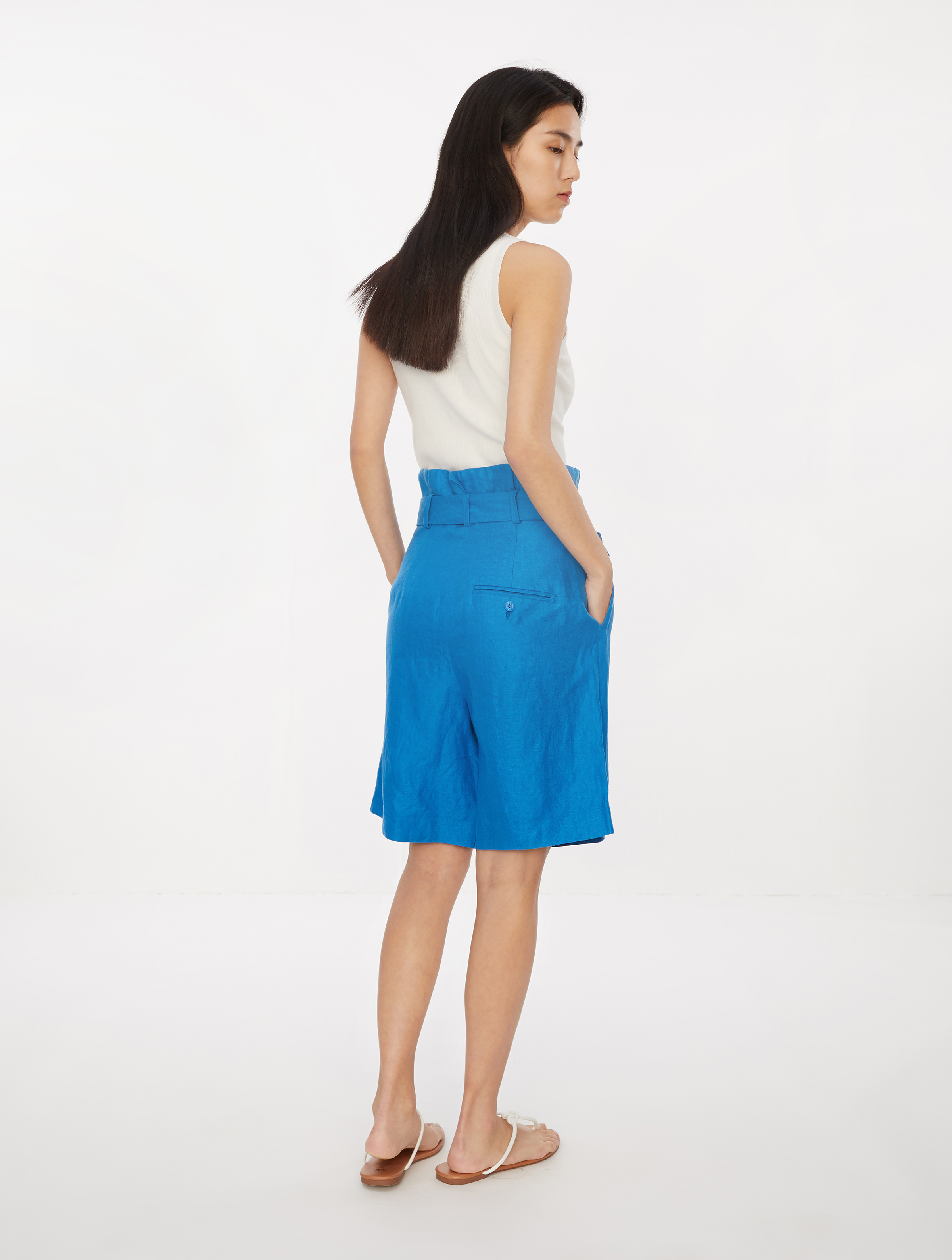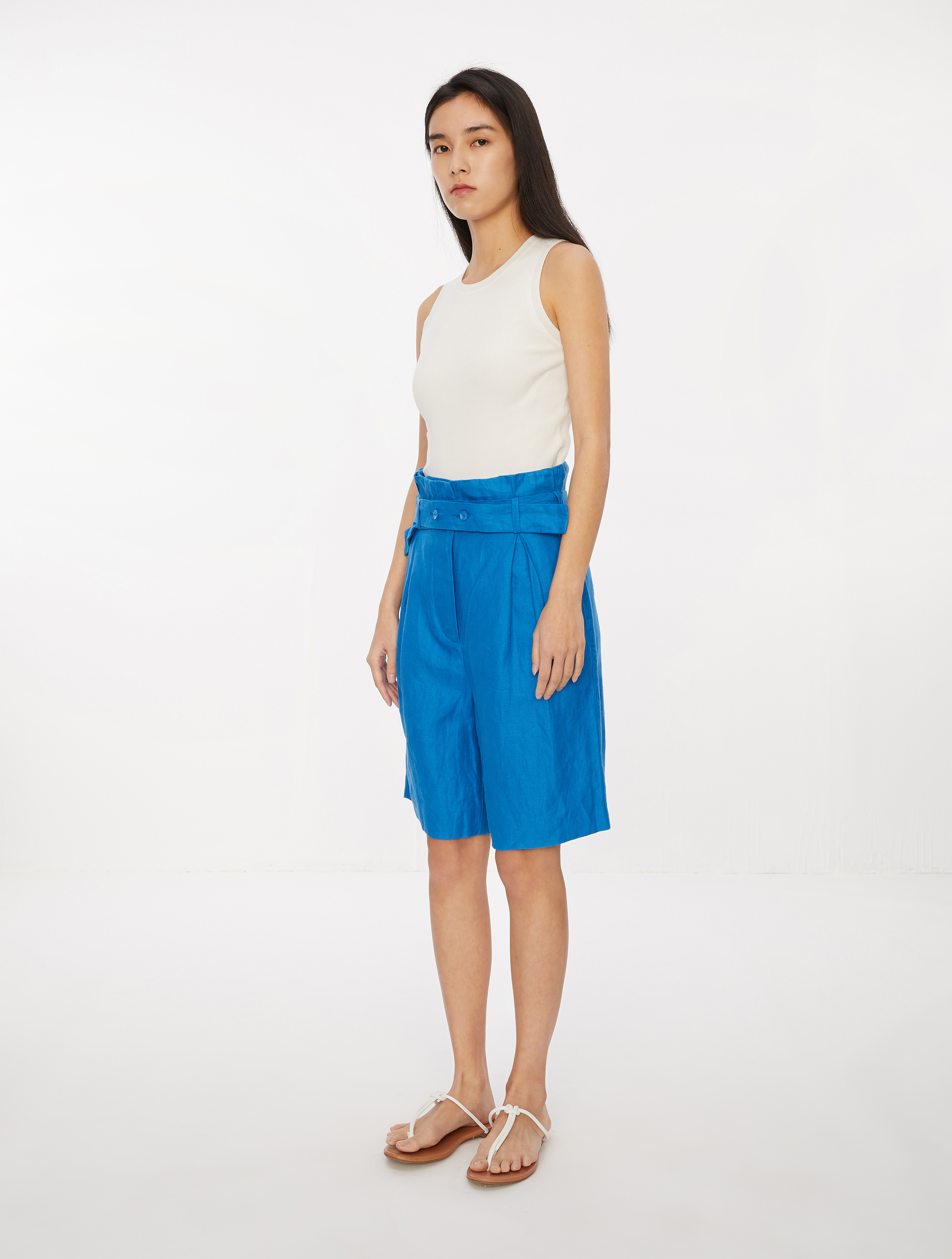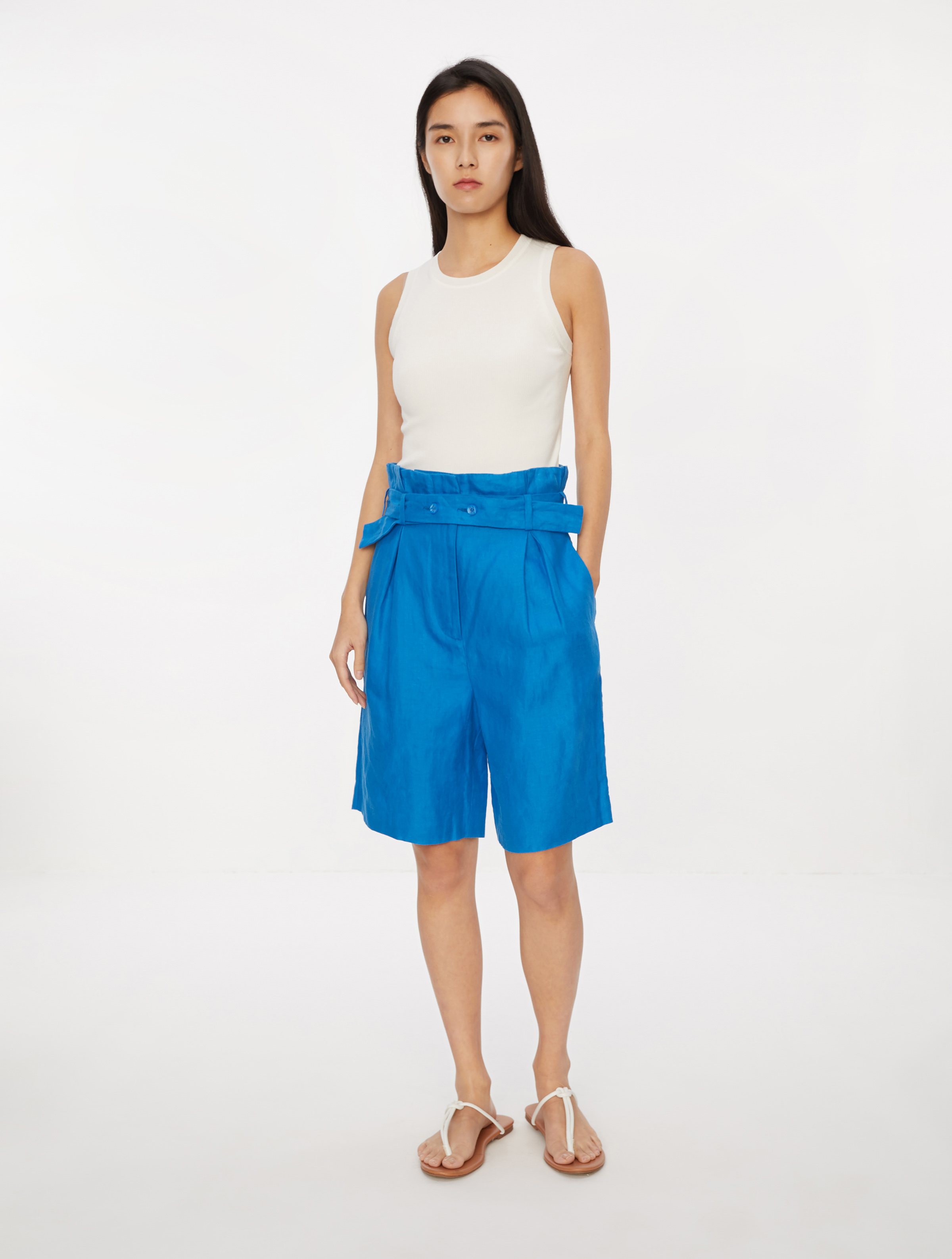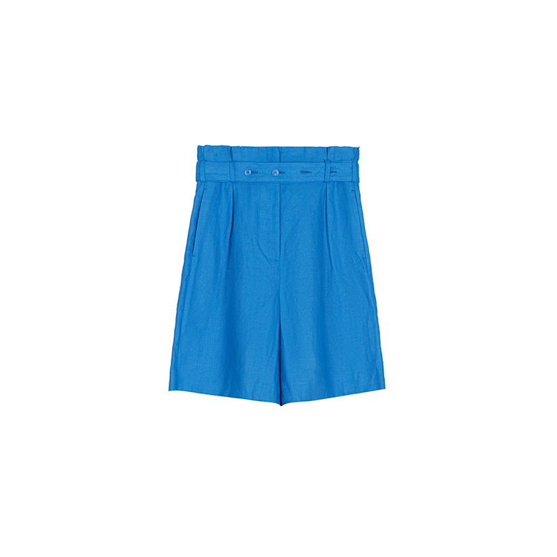 ⾼腰宽松短裤修饰⽐例,腰部褶裥收腰配合纽扣调节腰带,可营造多变造型;