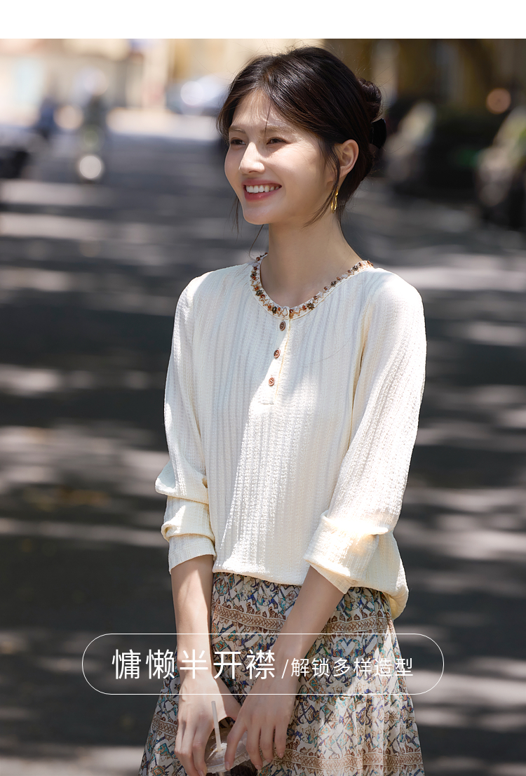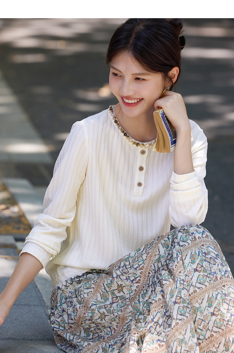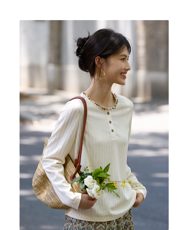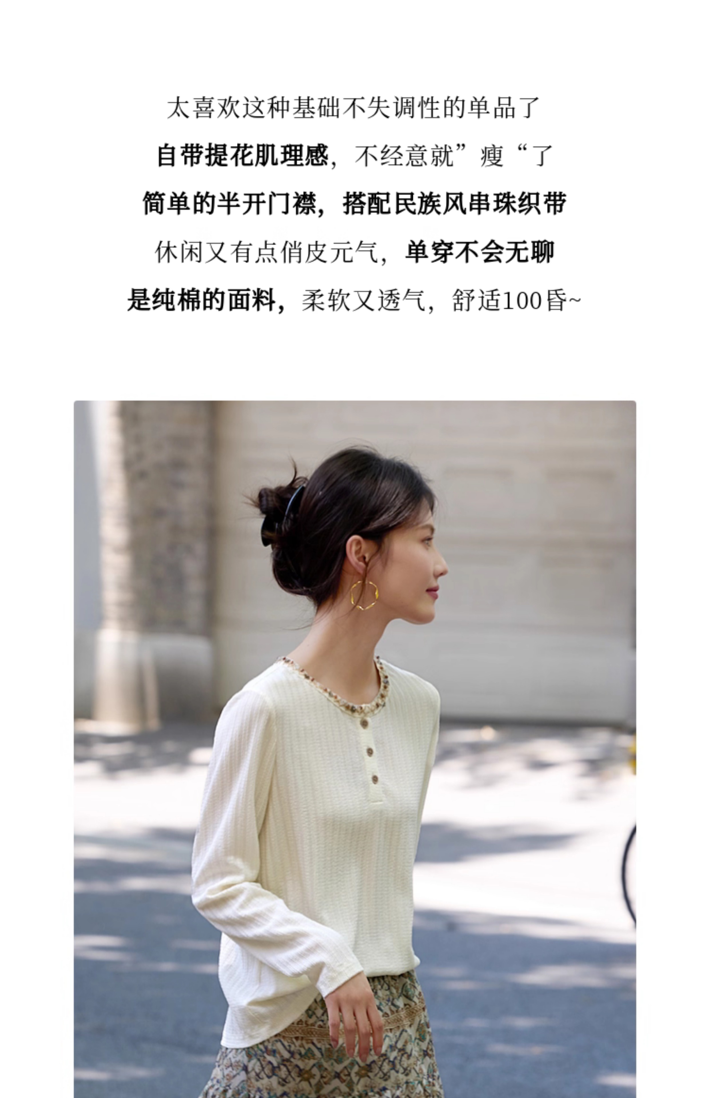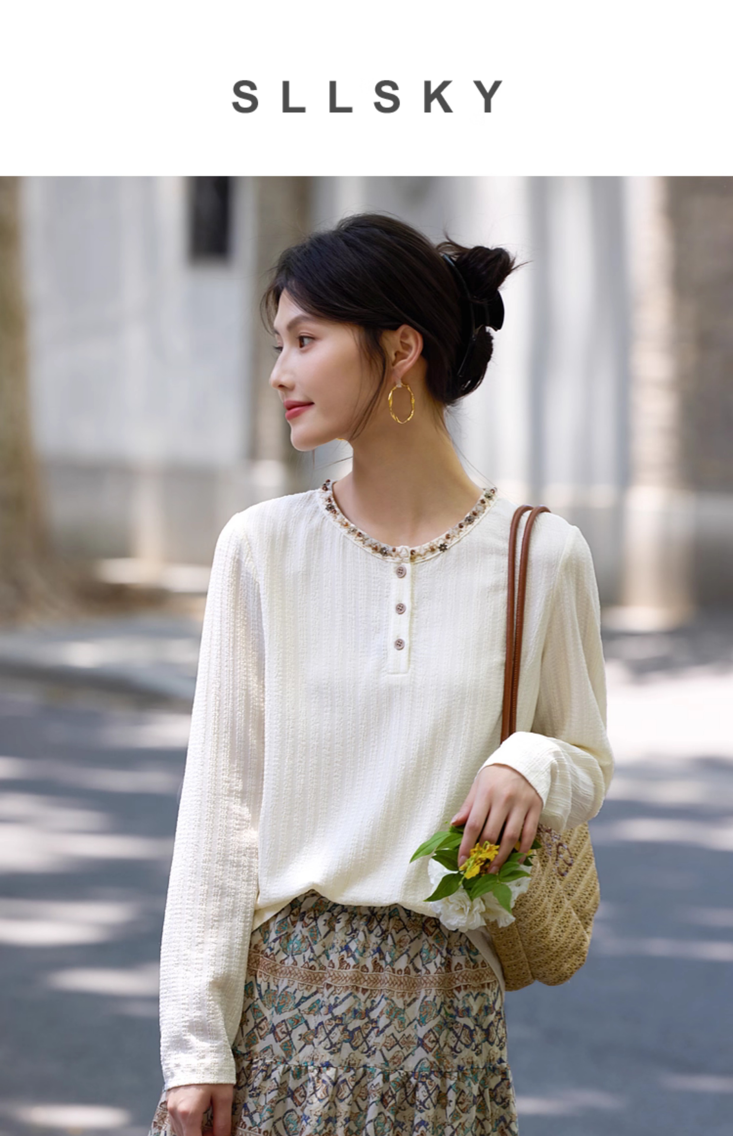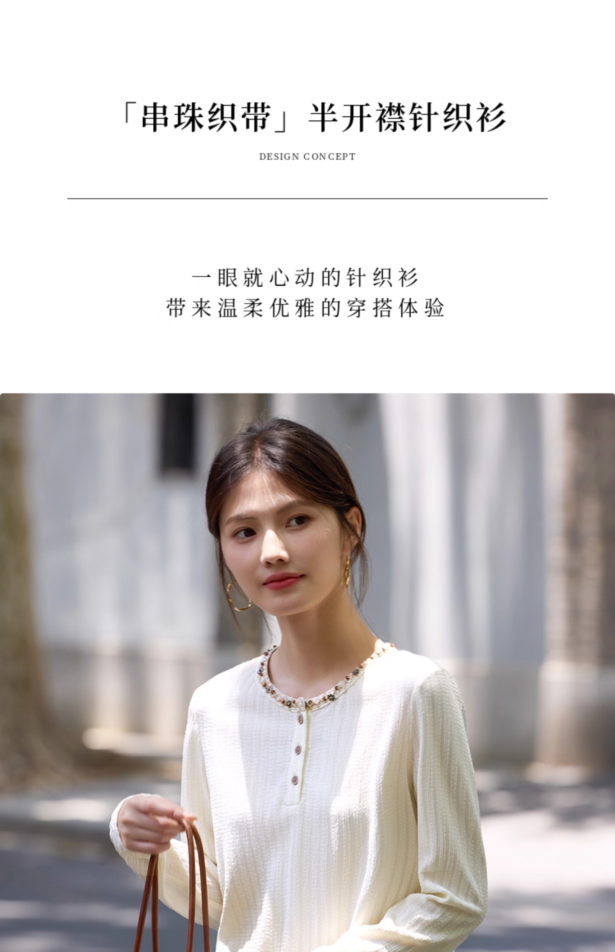 【年终特卖】熙世界肌理感串珠织带针织衫女长袖慵懒宽松圆领上衣2025秋季新款