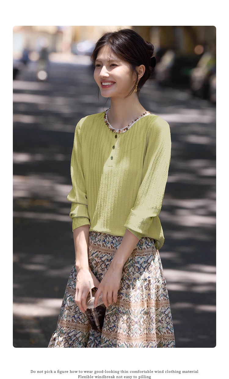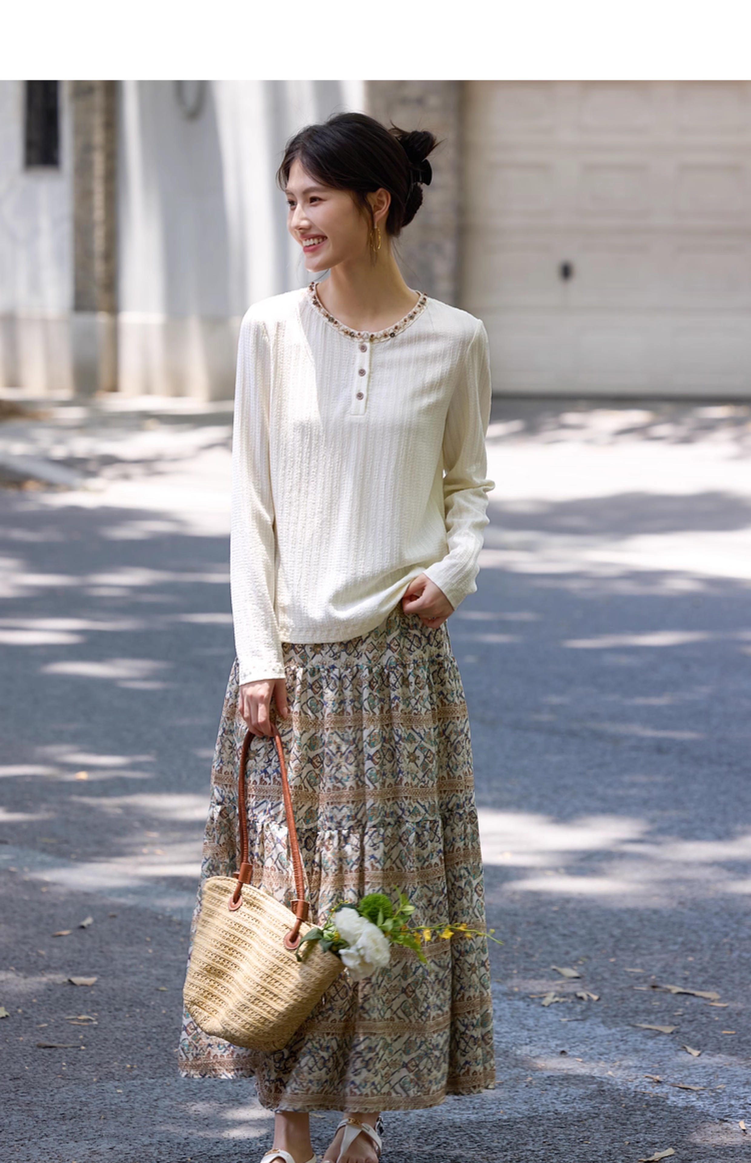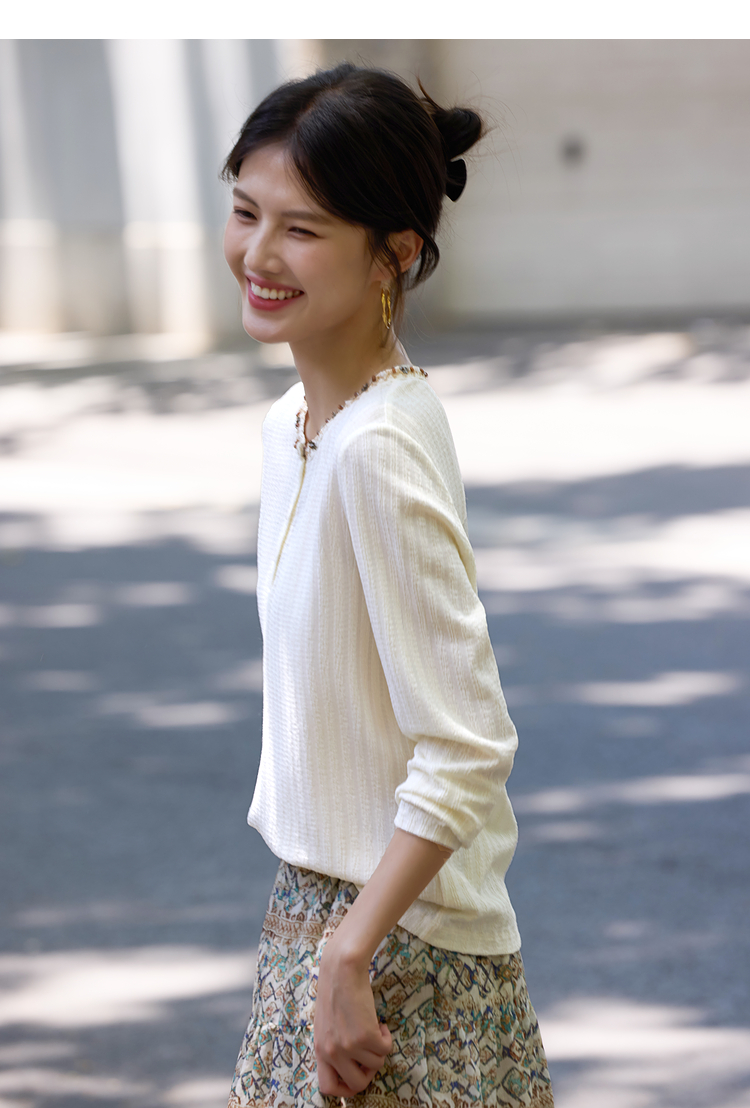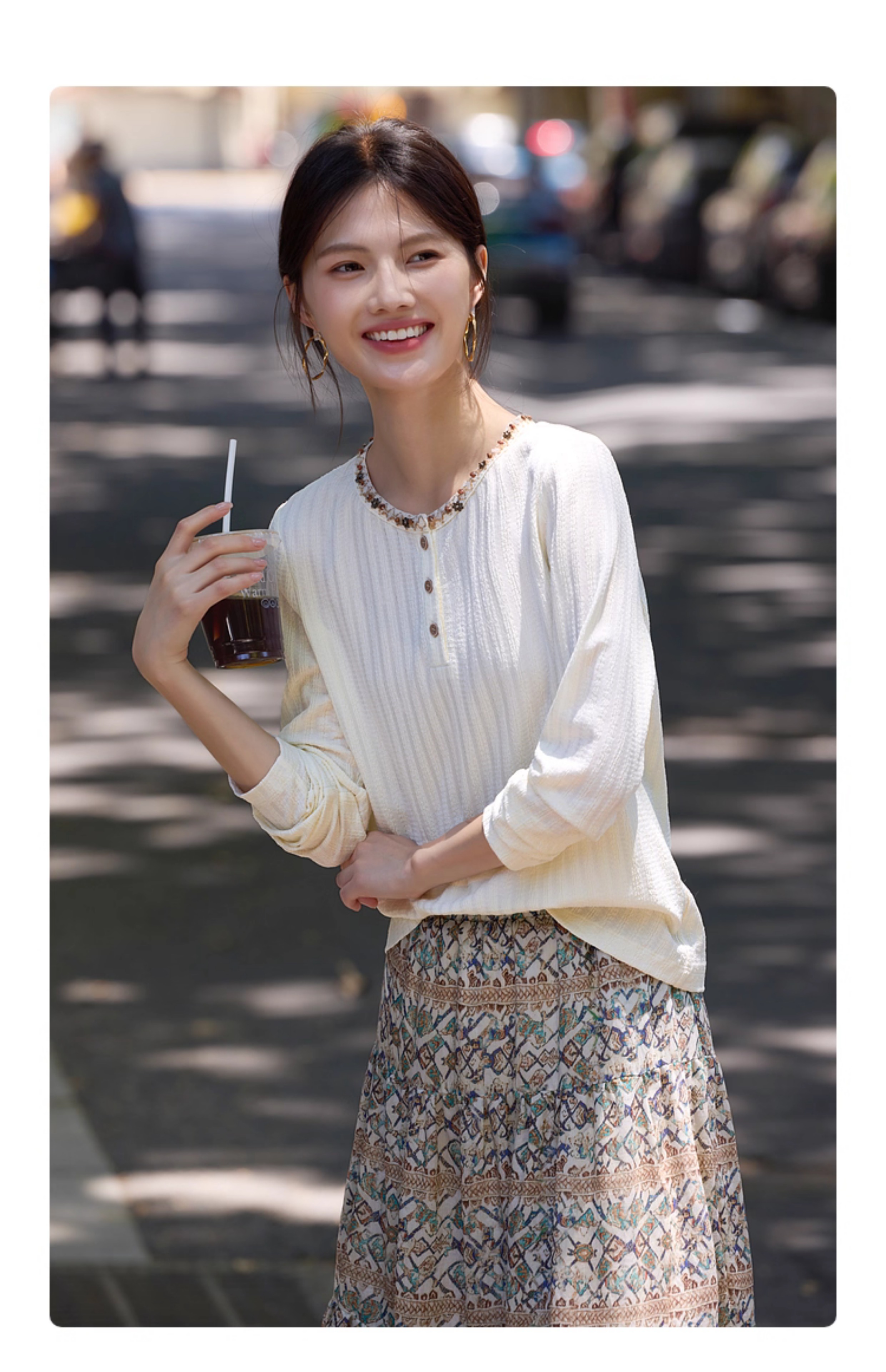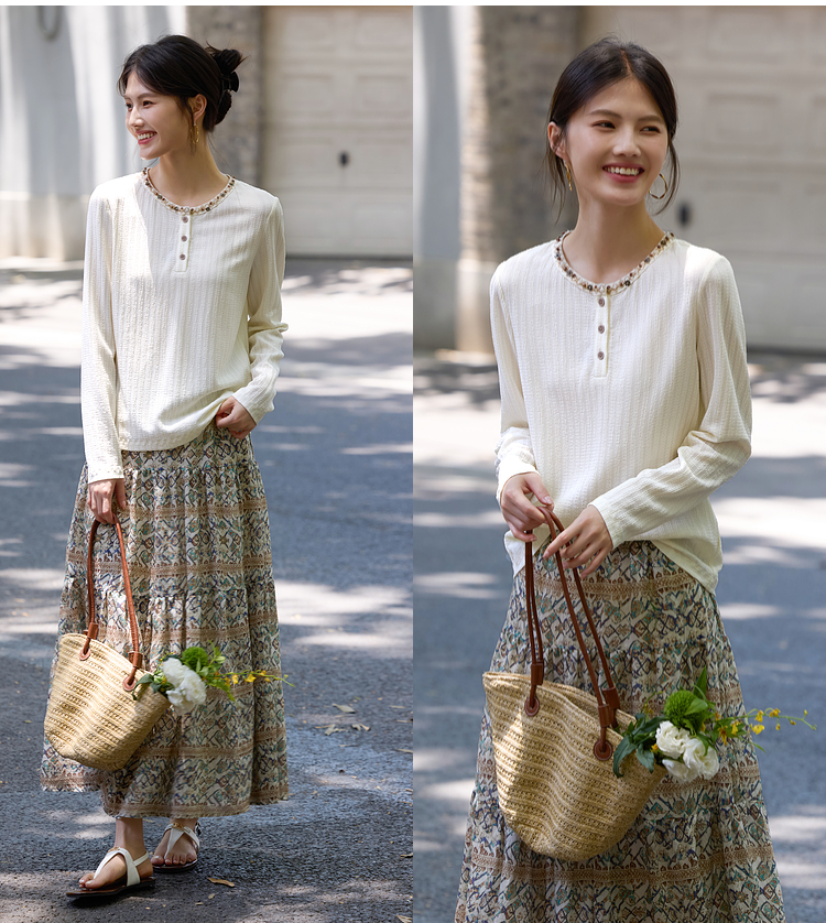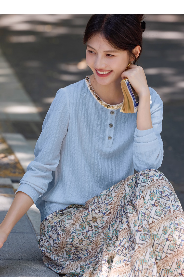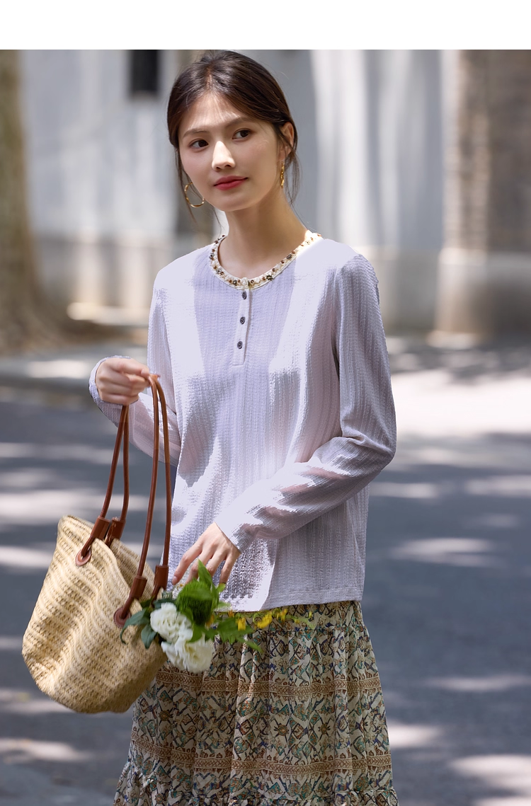 【年终特卖】熙世界肌理感串珠织带针织衫女长袖慵懒宽松圆领上衣2025秋季新款