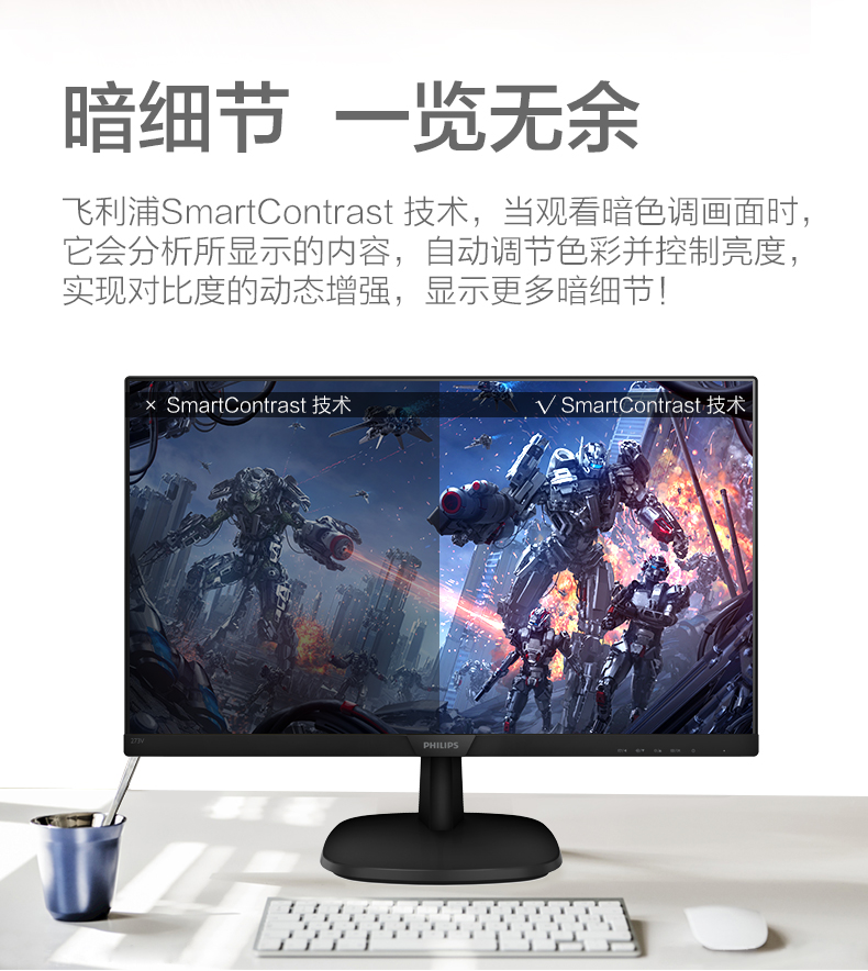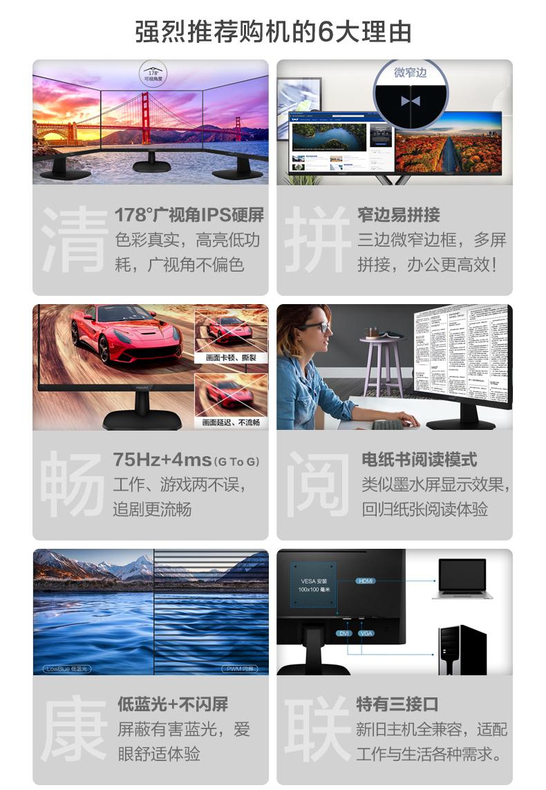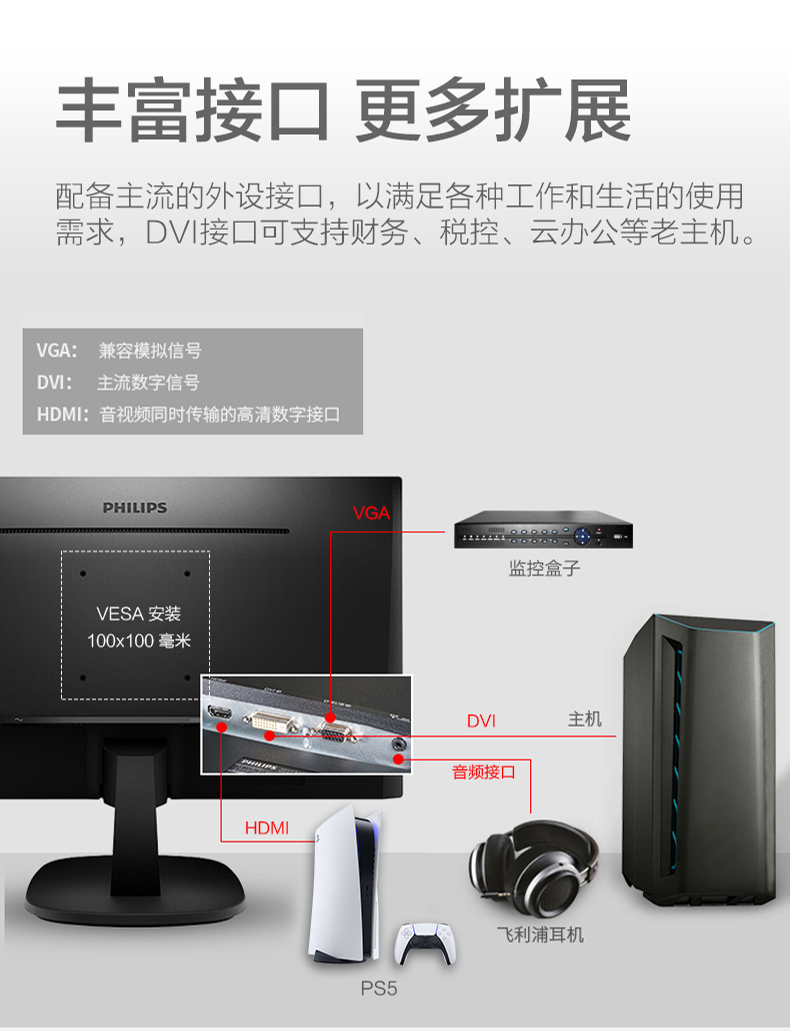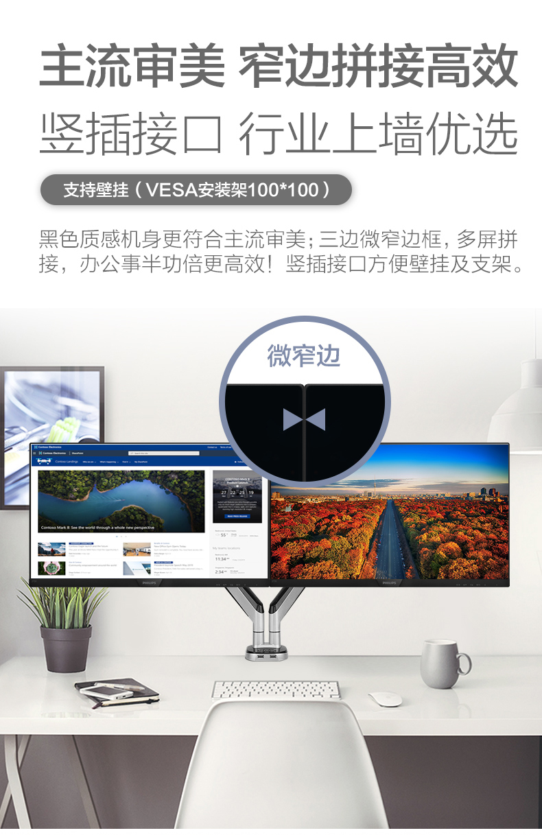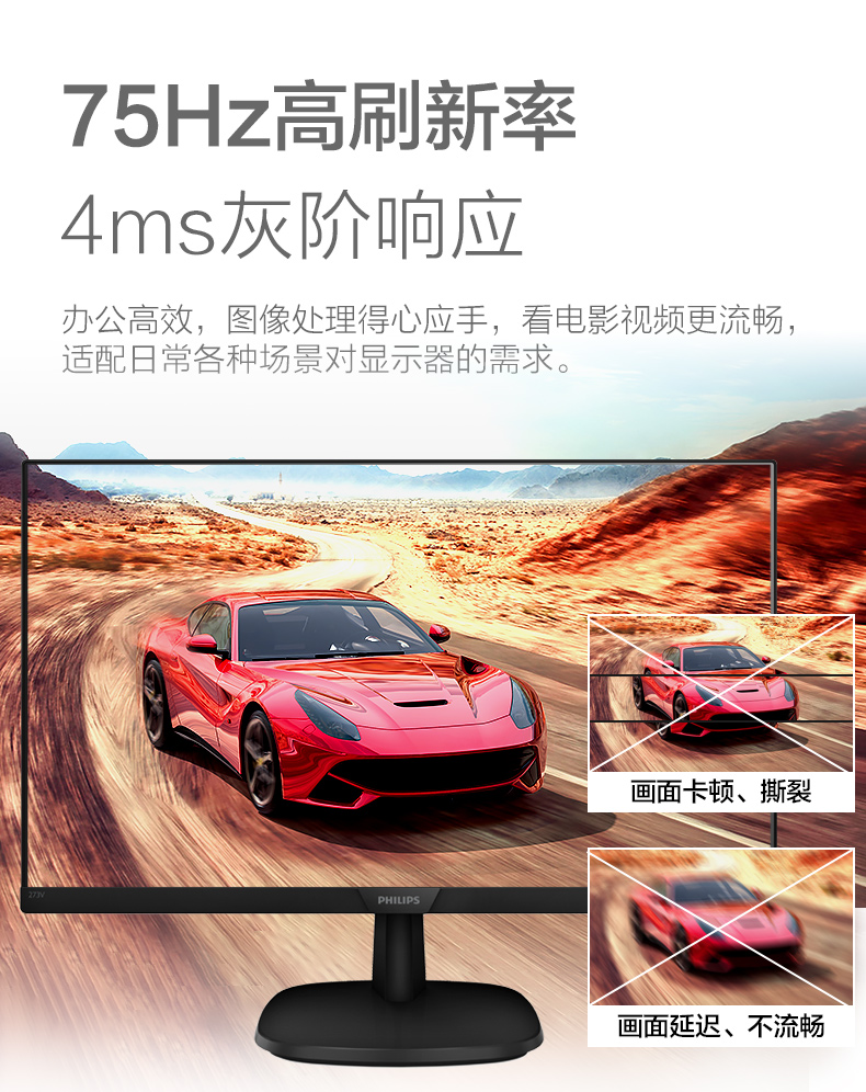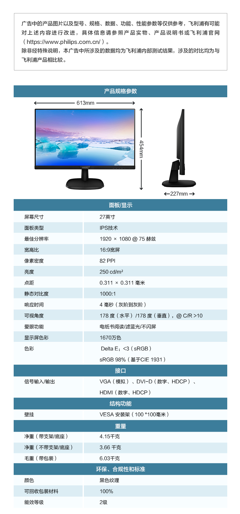 飞利浦 27英寸 IPS屏 FHD 75Hz TUV认证低蓝光 壁挂VGA/DVI/HDMI 网课 办公显示器 商务电脑显示屏273V7QDSBF