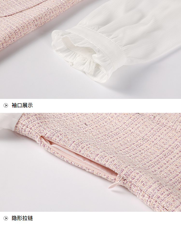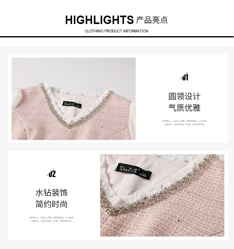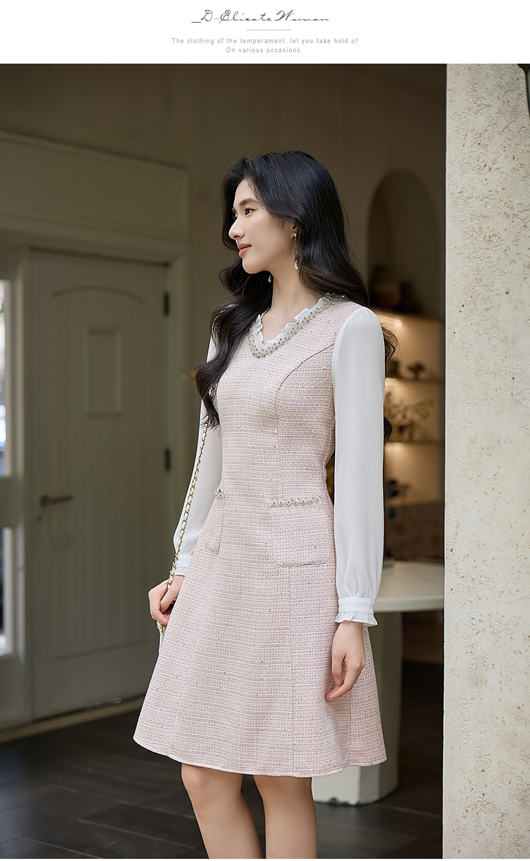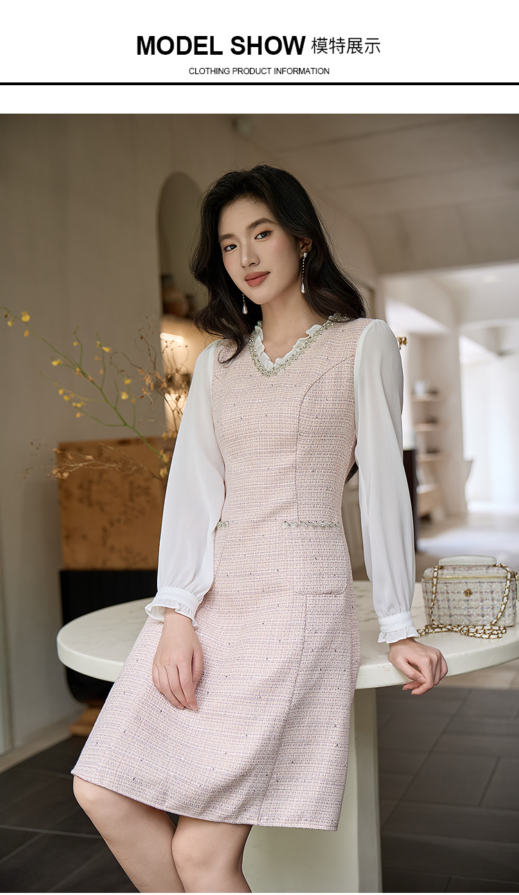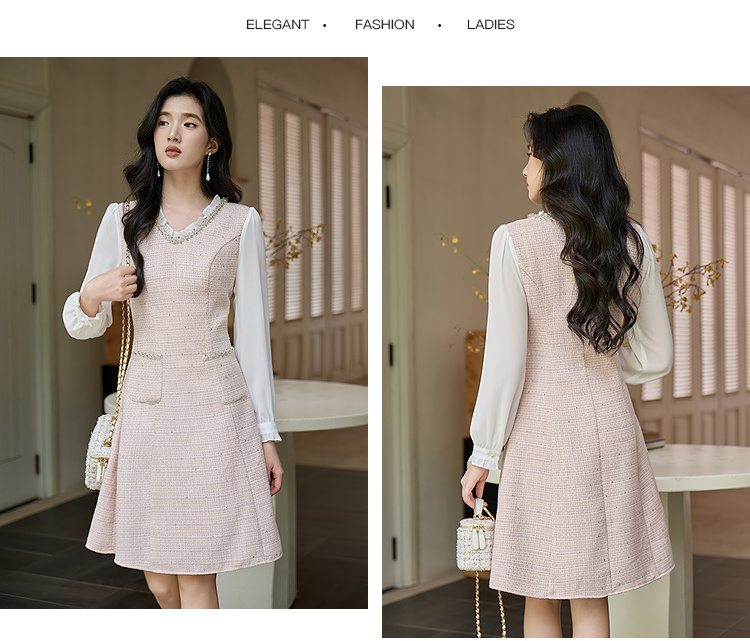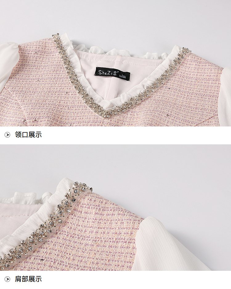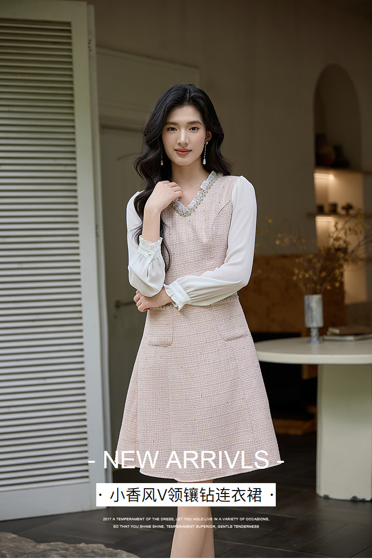 奢姿大码女装小香风V领镶钻连衣裙女2025秋季优雅拼接气质中长裙9953853571