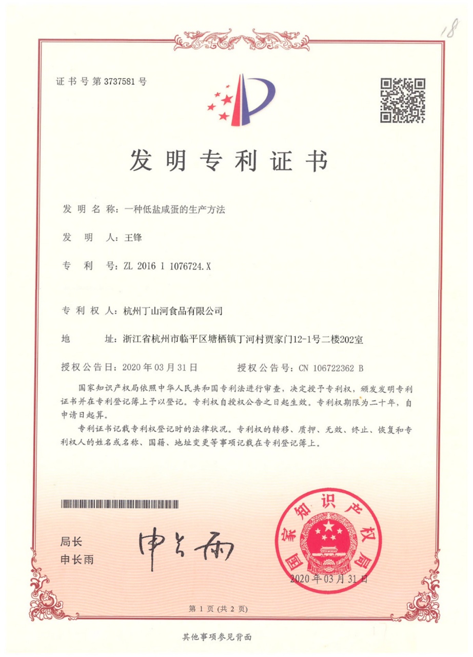 ⭐丁山河品牌联合农科院和湖南农业大学研究出了低盐腌制咸鸭蛋专利技术(专利号:ZL 201611076724.X)