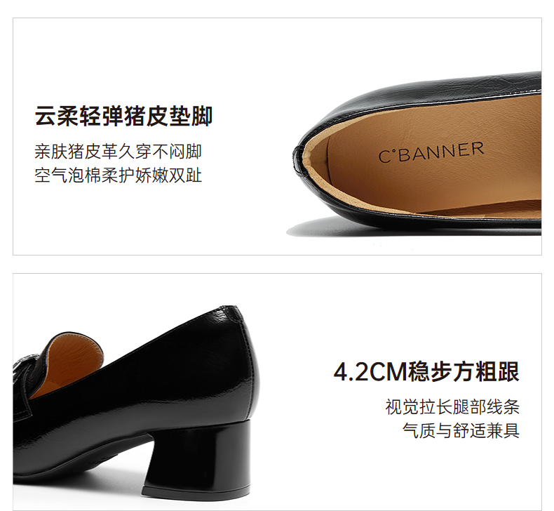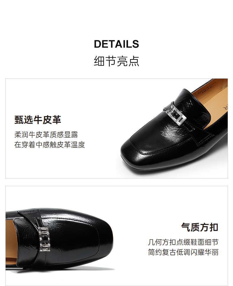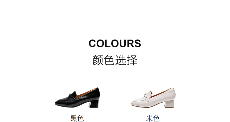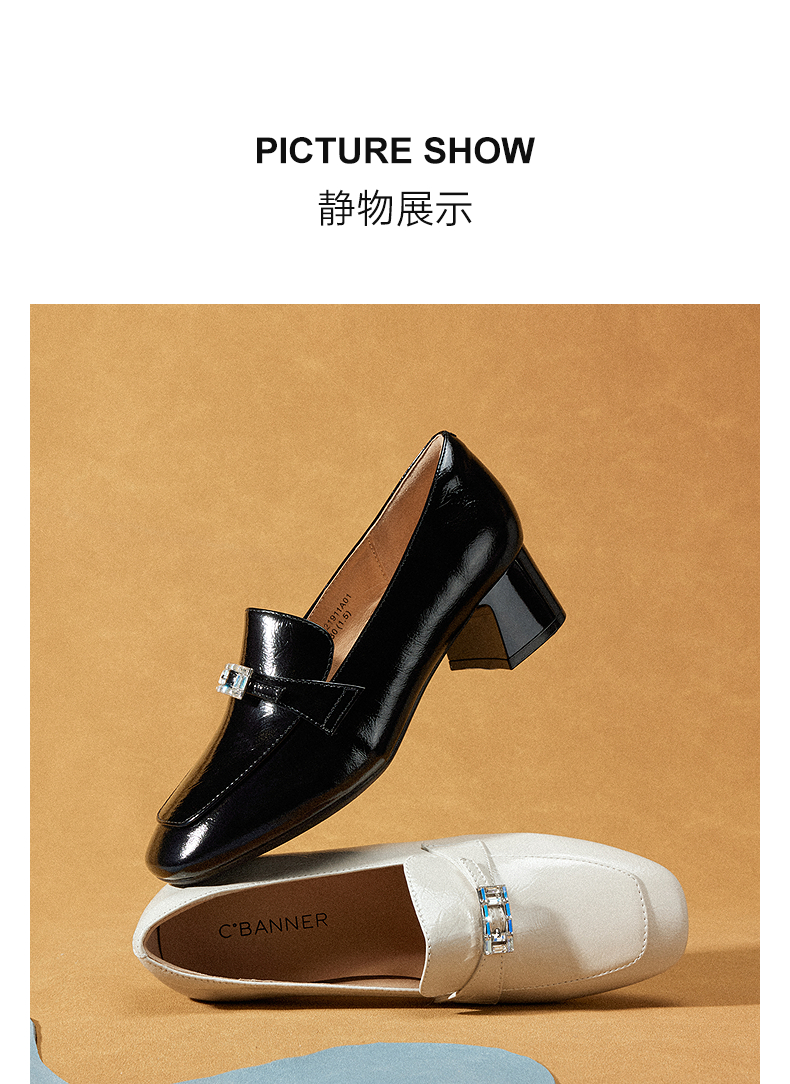 千百度经典一脚蹬乐福鞋女款粗跟通勤黑色中跟小皮鞋A25421911