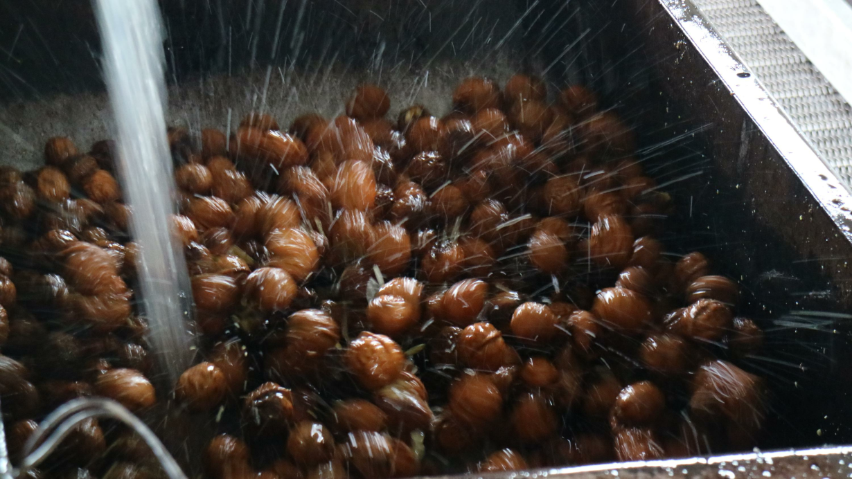 4.高压水枪对鲜果外壳进行强烈冲洗,将附着在核桃壳上的杂质、果皮去除,让我们的核桃外壳漂漂亮亮、干干净净。
