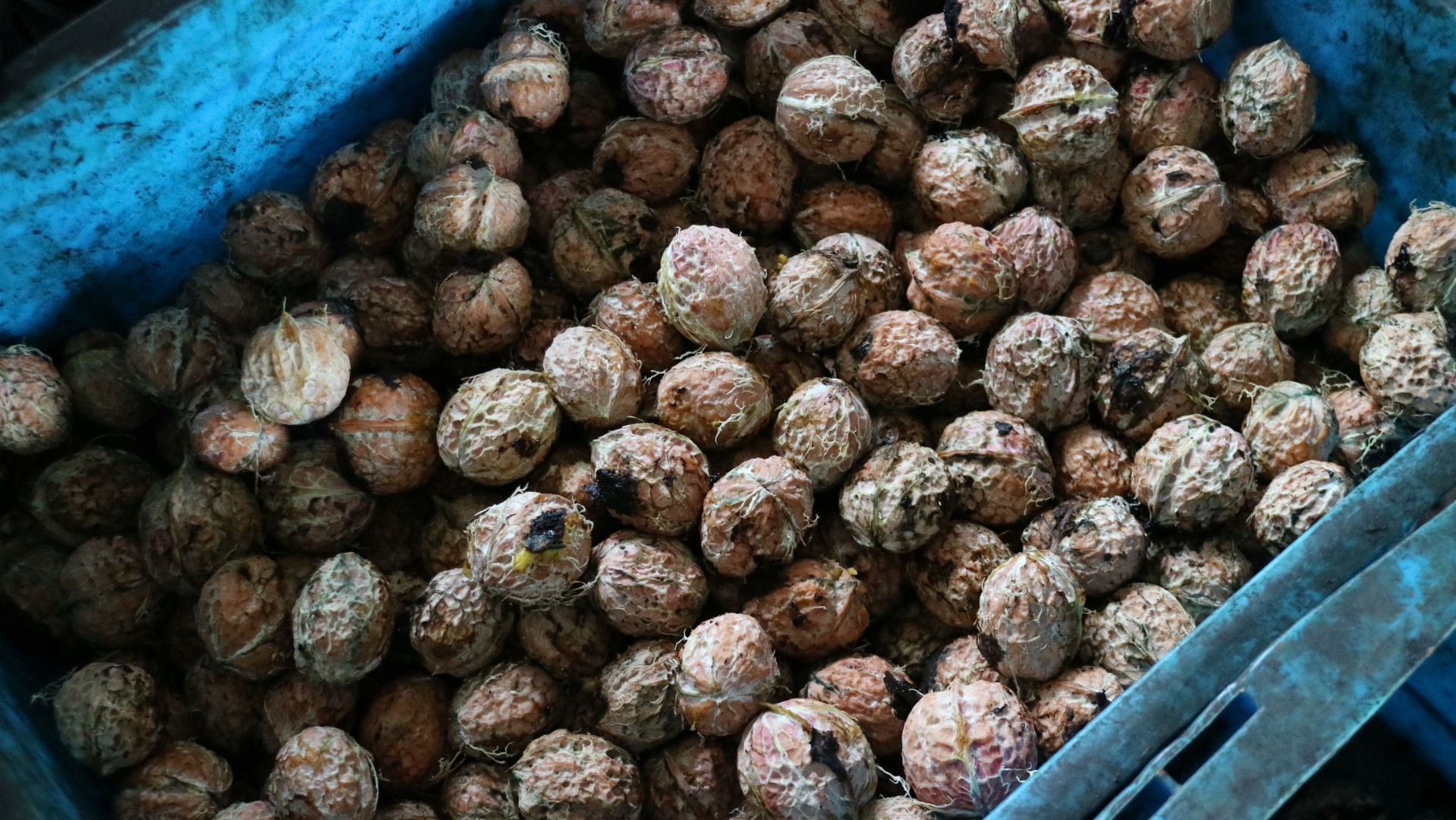 1.采摘的大泡新鲜核桃汇集