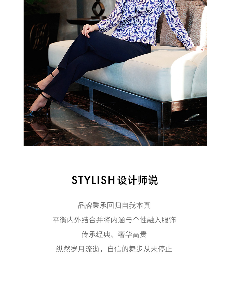 成熟、稳重、高贵典雅、大方得体 融合东方文化的含蓄和法国的浪漫 将创意的艺术性与消费需求相结合 为自信女性塑造高品质场合服装