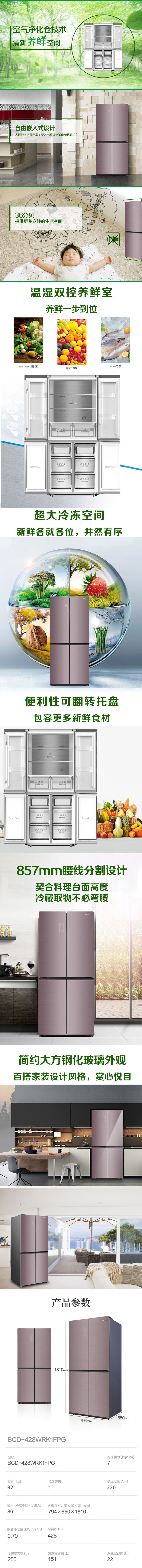 容声(202646)428升十字对开门冰箱 家用大容量一级变频 风冷无霜四门多门电冰箱 BCD-428WRK1FPG